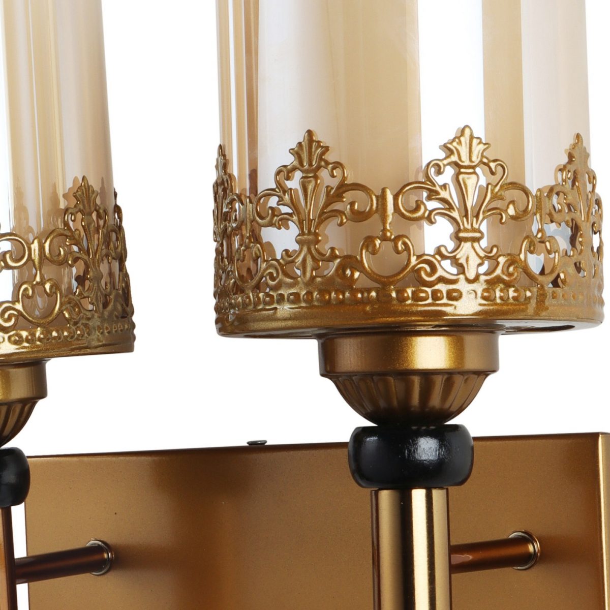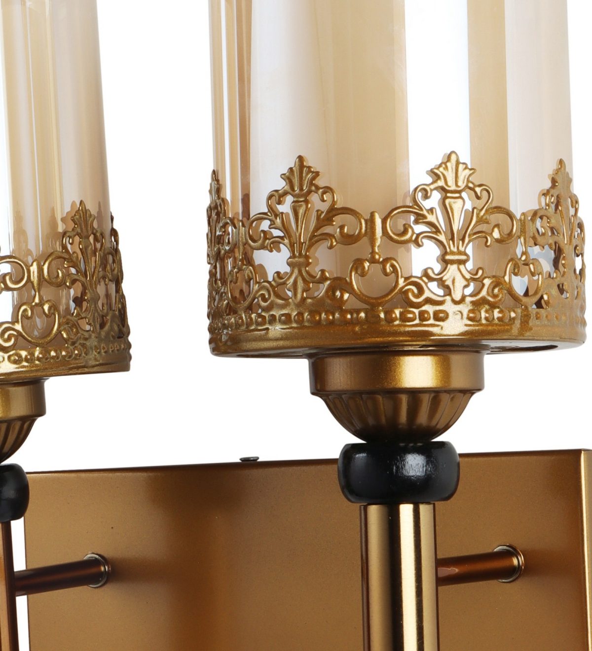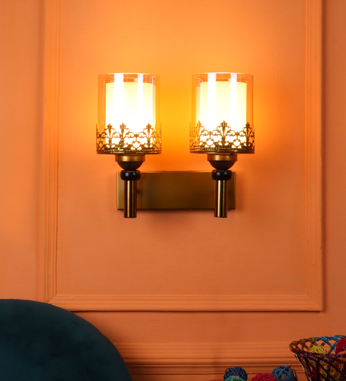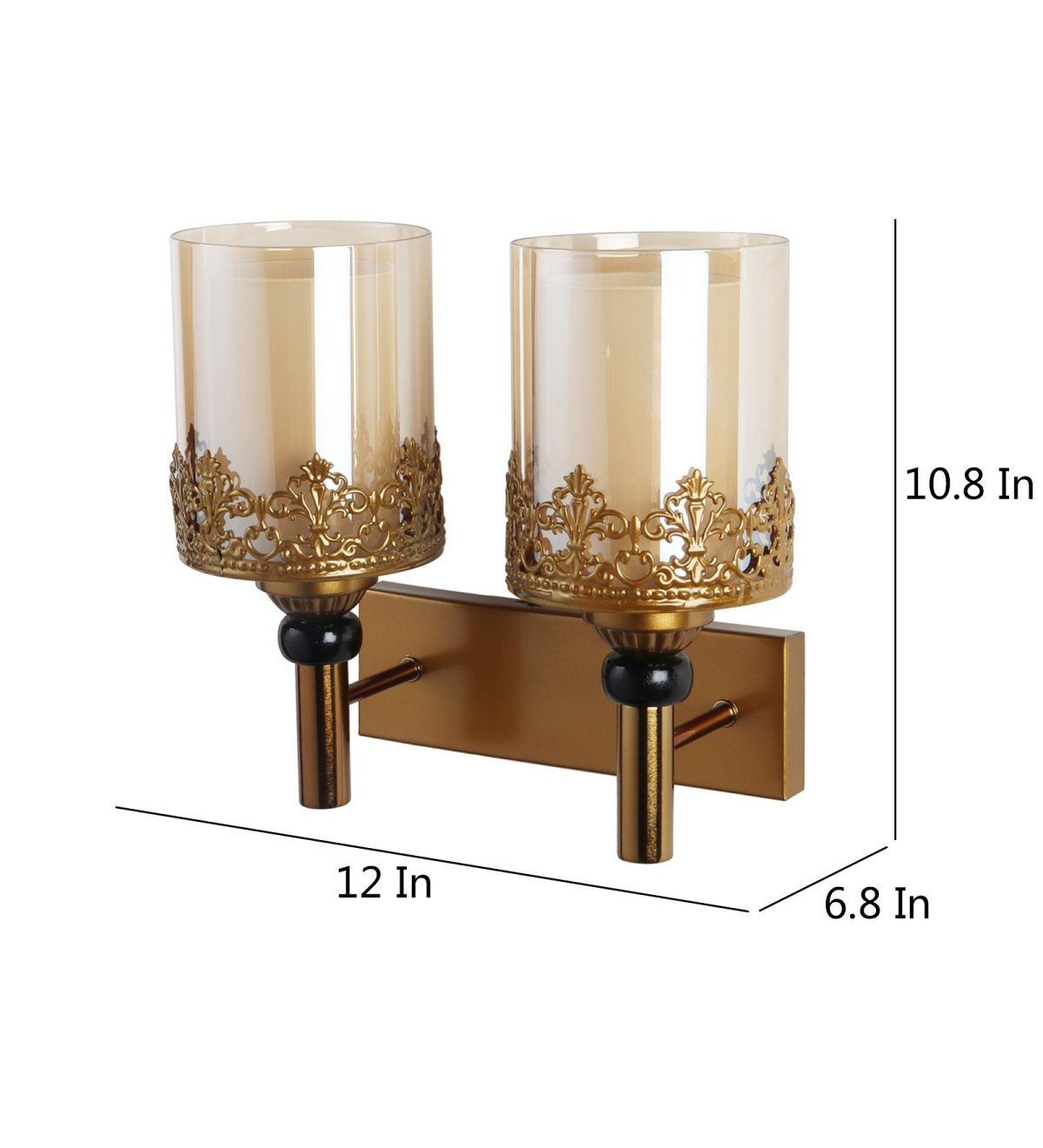 Antique gold finish double wall light having round, cylindrical two layered champaign coloured glass. It is maintenance free, easy to remove glasses and wash them, comes with an E27 holder, only the change of lamp is required, which is available locally everywhere. Application includes both residential and commercial premises wherever it matches with your interiors. Matching single wall light code – WL2695. Can be customized as per requirement in case of bulk quantity, LAMP NOT INCLUDED.