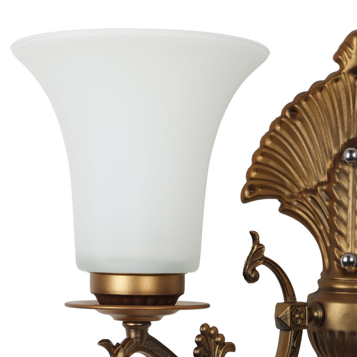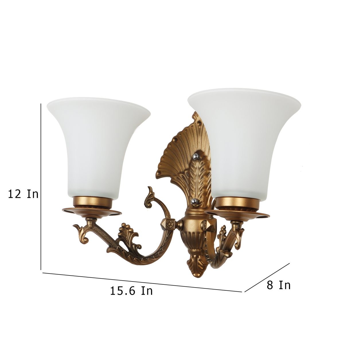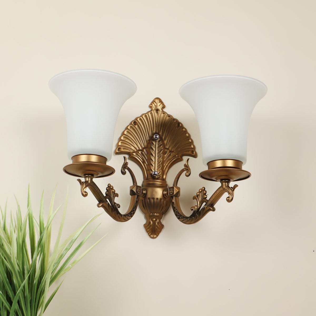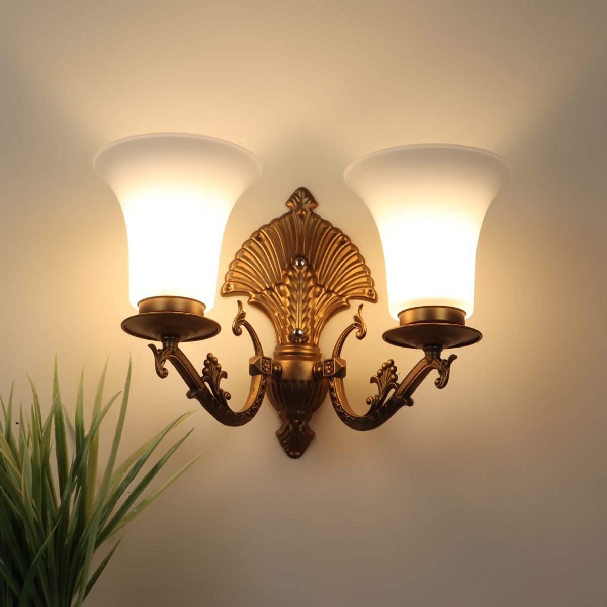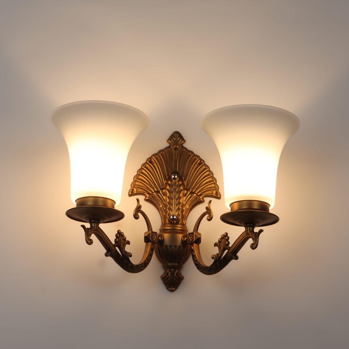 Antique brass finish double wall light having taper bell shaped white glass mounted on a designer frame made of mild steel. It is maintenance free. It is easy to remove glasses and wash them. Comes with an E27 holder, only the change of lamp is required, which is available locally everywhere. Application includes both residential and commercial premises wherever it matches with your interiors. Can be customized as per requirement. LAMP NOT INCLUDED.