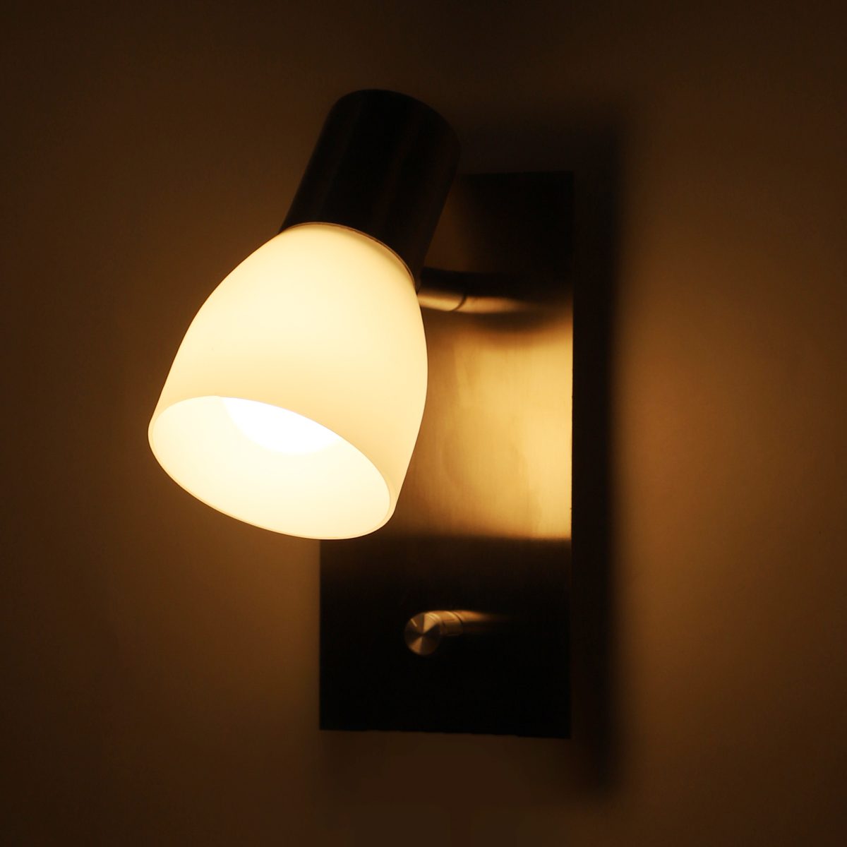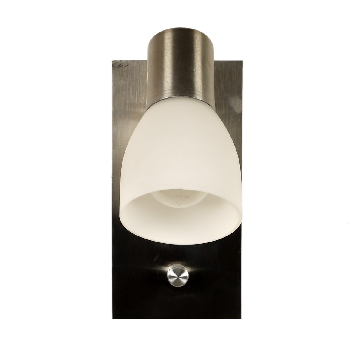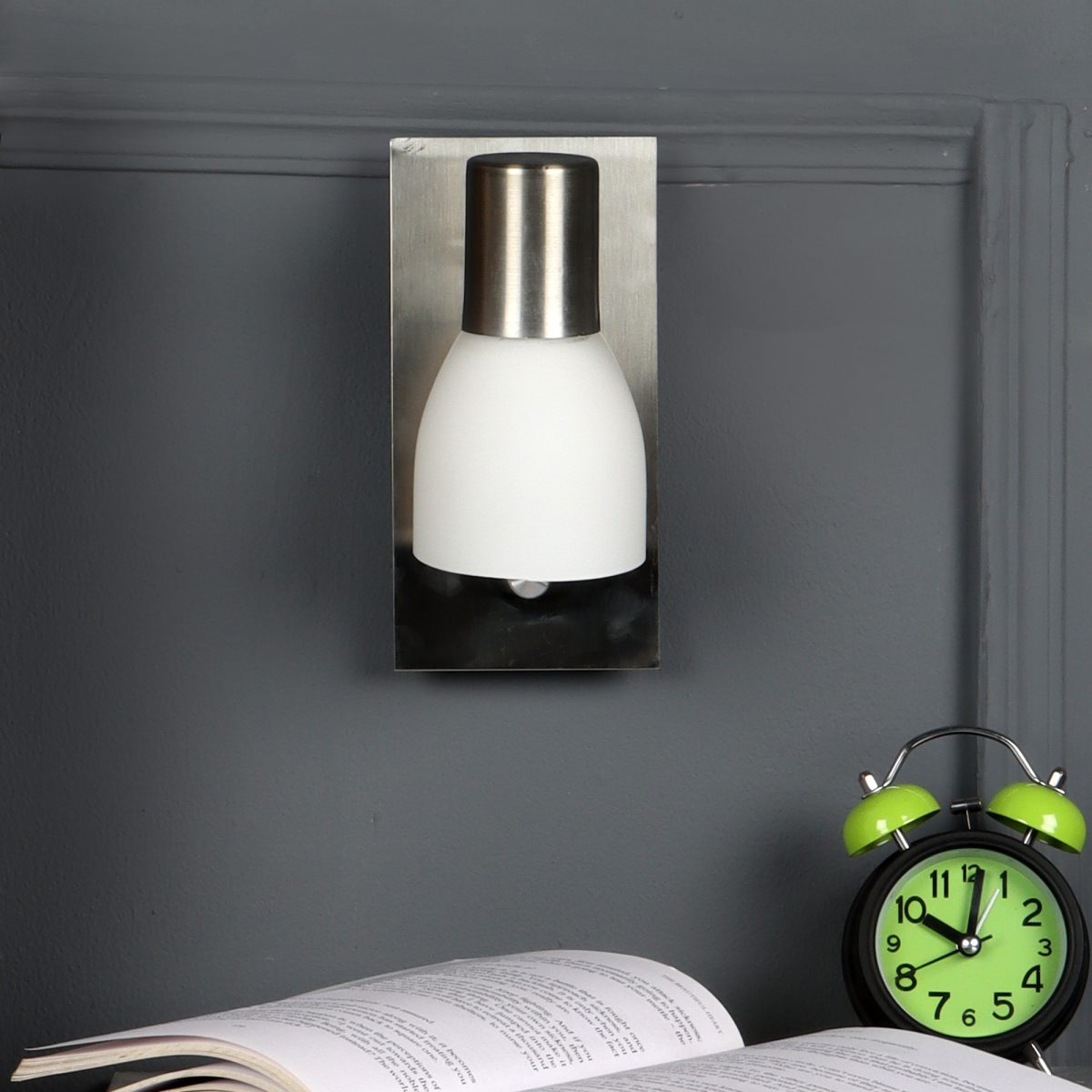Silver bed side adjustable wall light with dimmer. The lighting head is mounted on a neck which can be rotated in all the directions. Brightness can be adjusted using the dimmer.