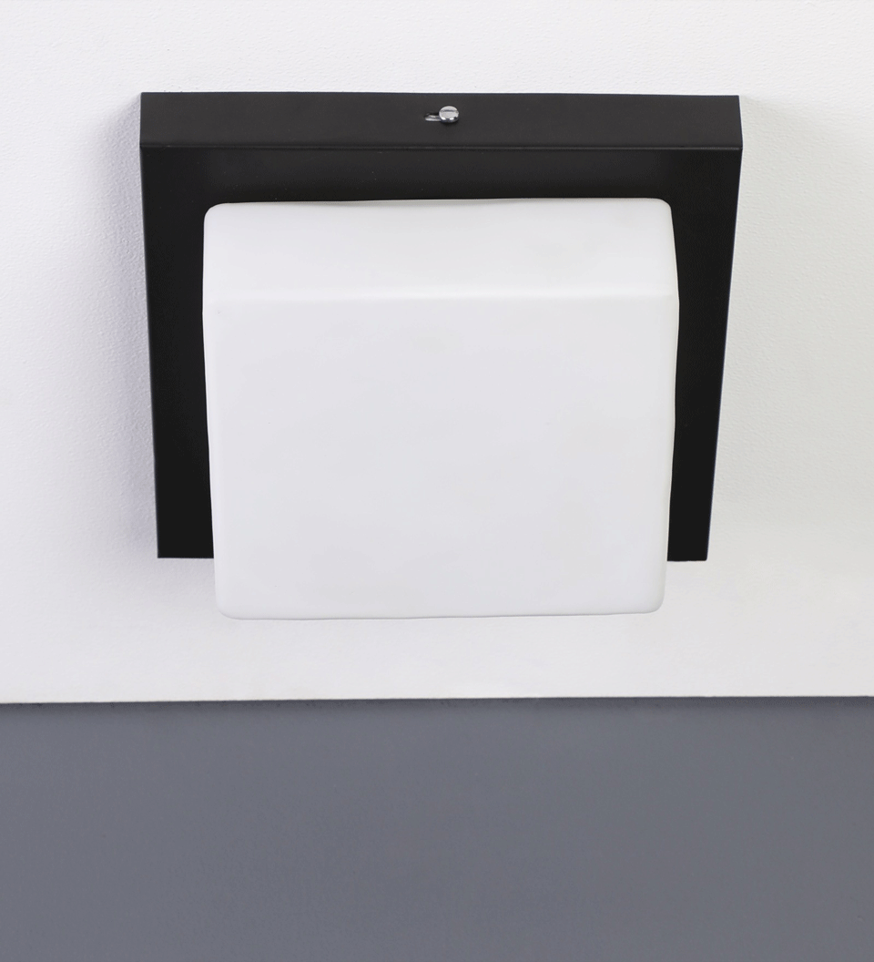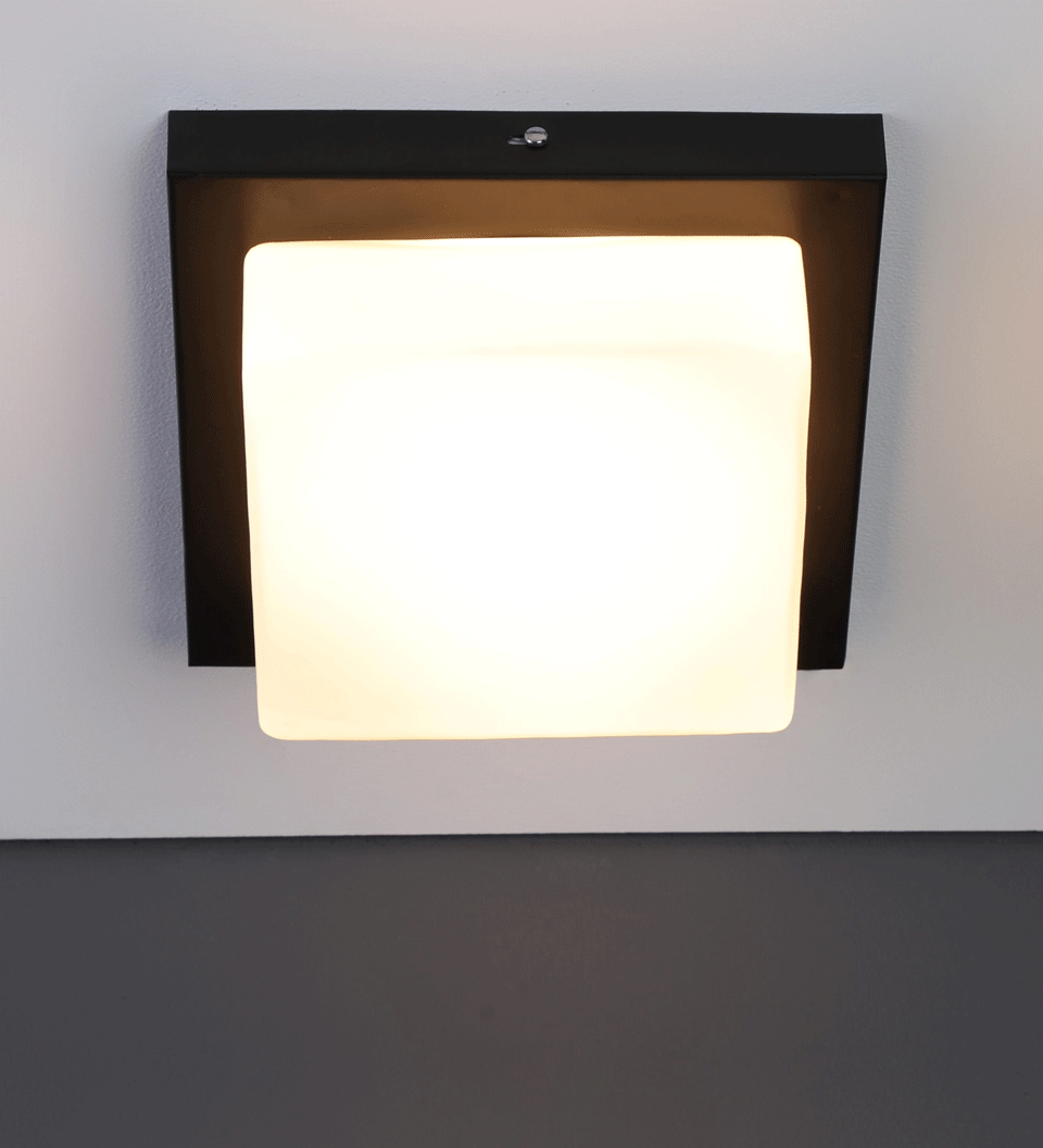 Square aluminium sheet / mild steel powder coated outdoor ceiling light having one lamp in dark brown finish providing light in 360 degree. It is maintenance free, comes with an E27 holder, only the change of lamp is required, which is available locally everywhere You can of course swap out the bulb for one that is dimmable, has a higher light output or a different colour temperature. Application areas include porch,entrance, patio, verandah, balcony, bathroom, staircase ceiling, terrace, stilt parking, basement parking. Have a bigger size with two lamp option with code CL450-M.