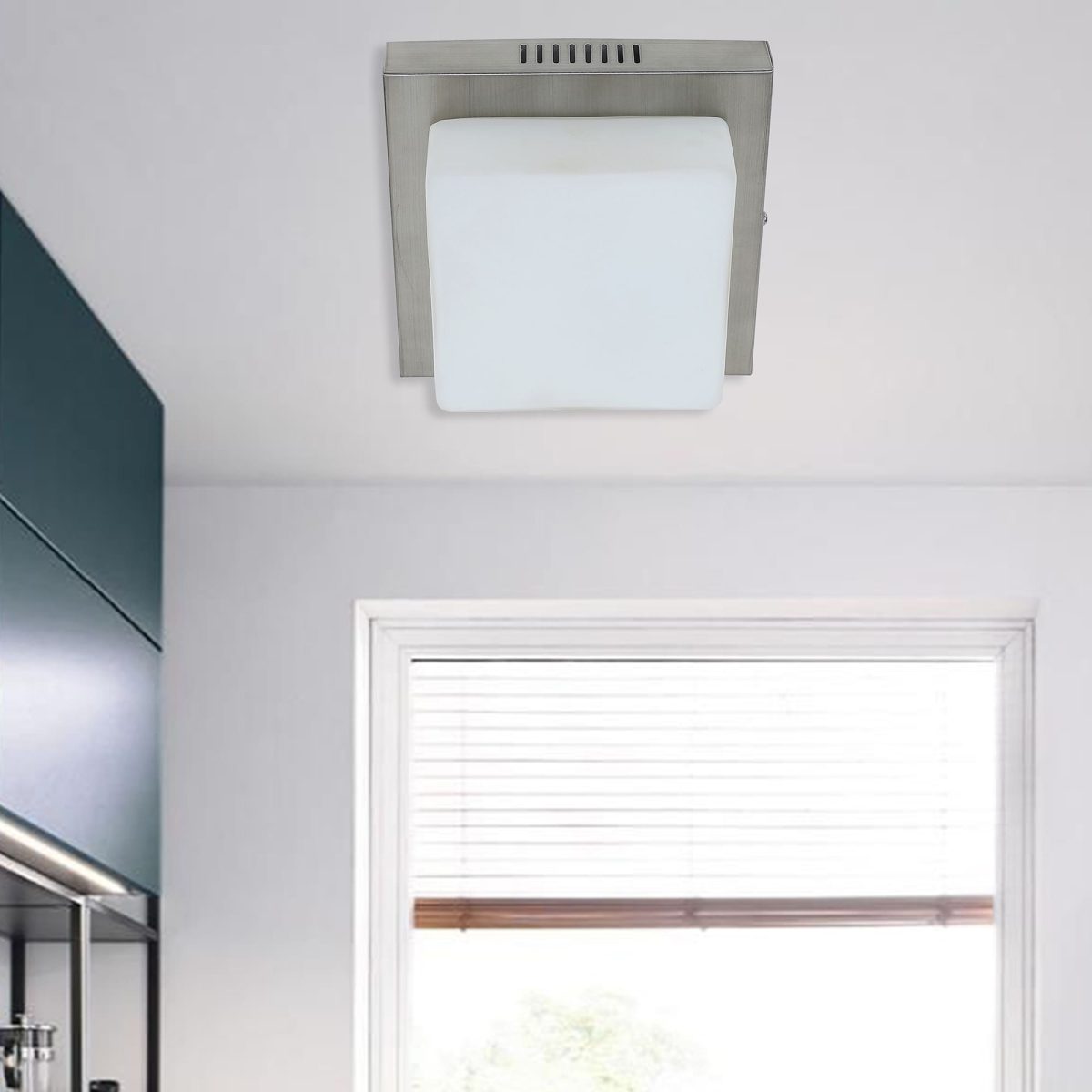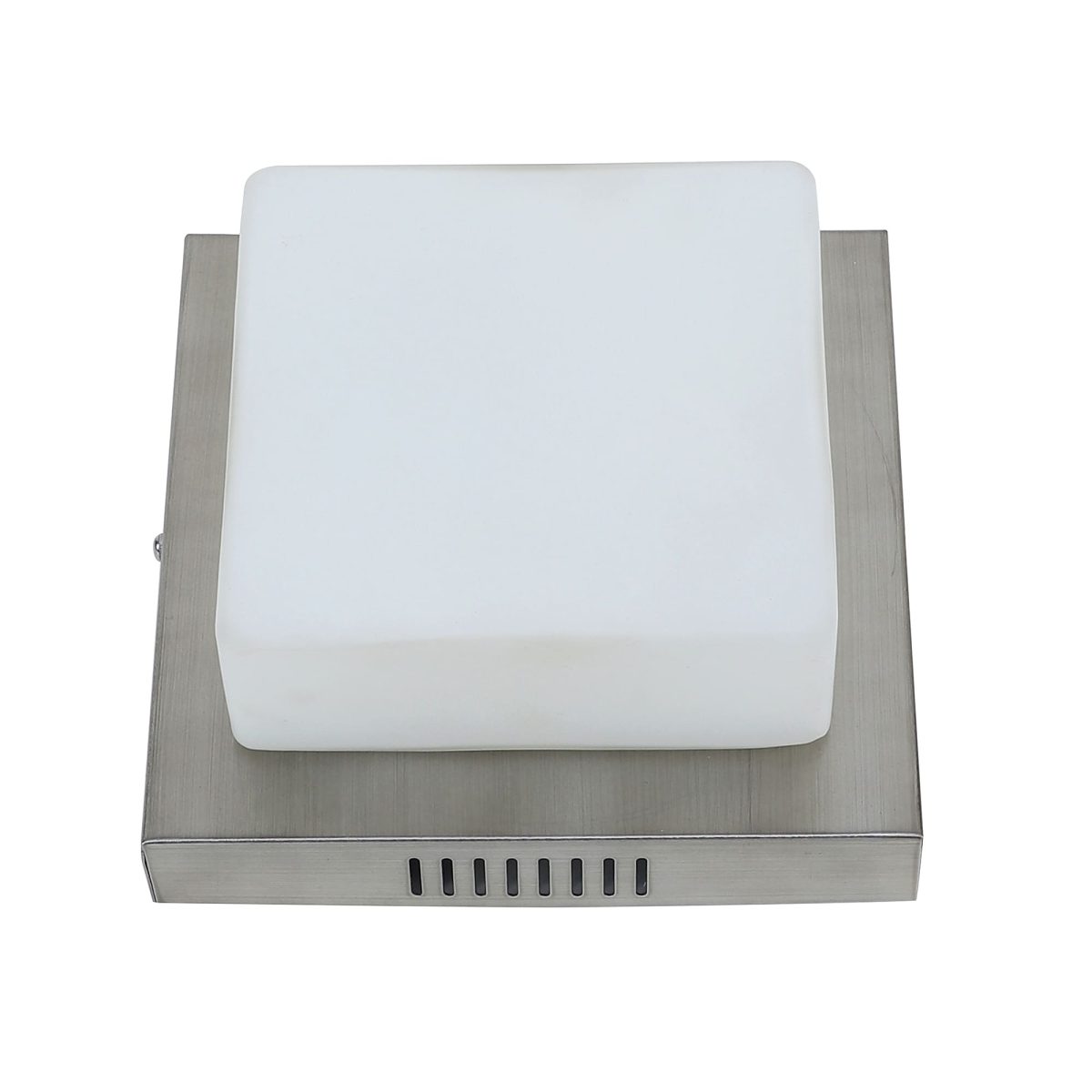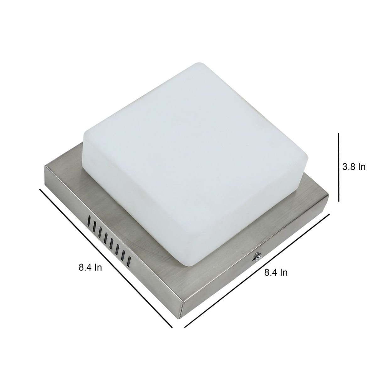 Square aluminium sheet / mild steel powder coated outdoor ceiling light having one lamp in silver (satin nickel) finish providing light in 360 degree. It is maintenance free, comes with an E27 holder, only the change of lamp is required, which is available locally everywhere You can of course swap out the bulb for one that is dimmable, has a higher light output or a different colour temperature. Application areas include porche, enterance, patio, verandah, balcony, bathroom, staircase ceiling, terrace, stilt parking, basement parking Have a bigger size with two lamp option with code CL451-M. LAMP NOT INCLUDED.
