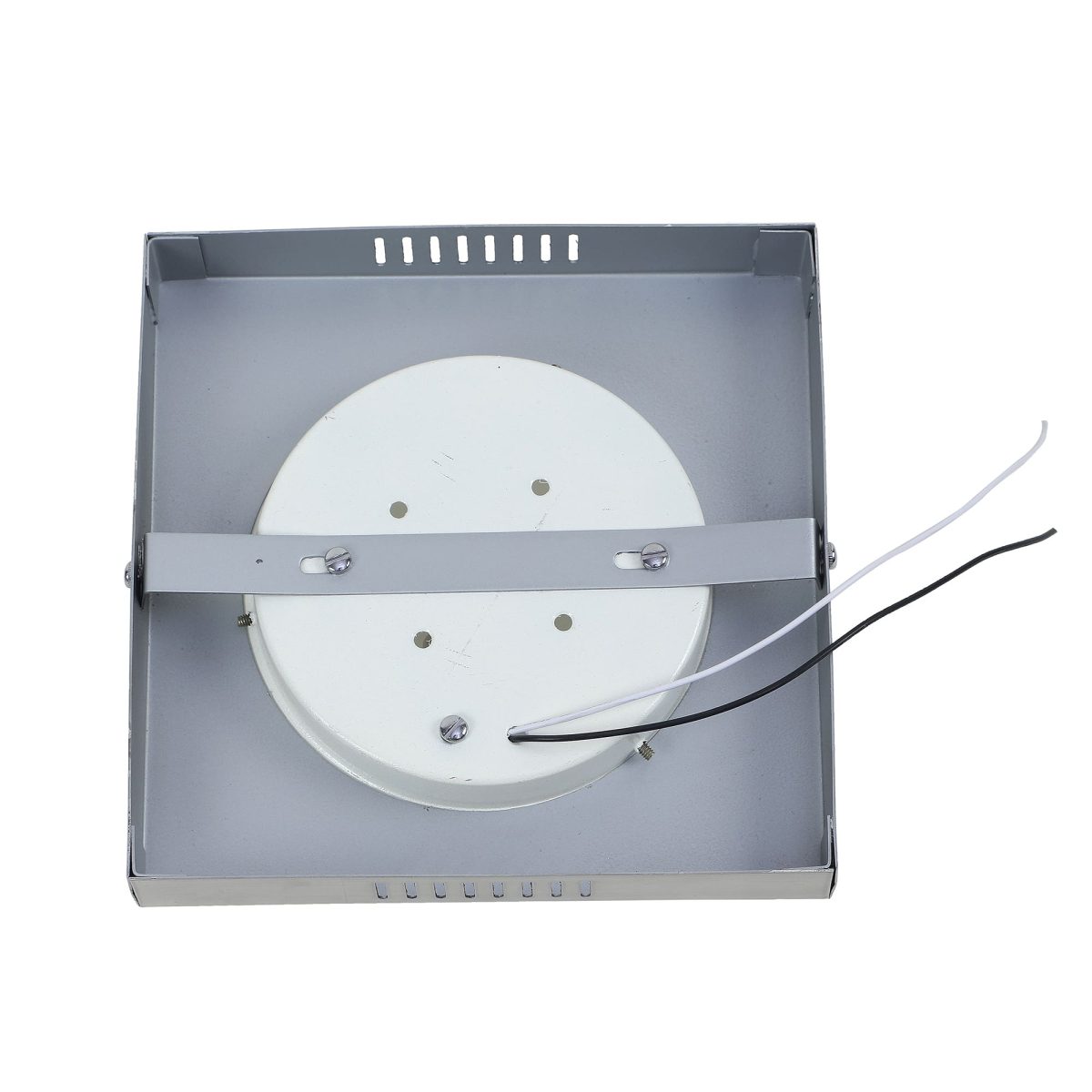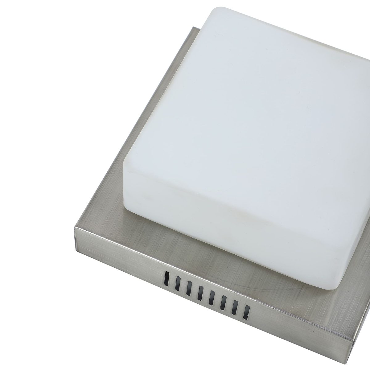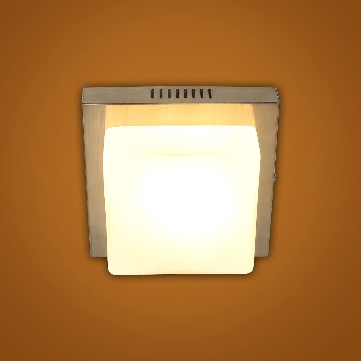 Square aluminium sheet / mild steel powder coated outdoor ceiling light having one lamp in silver (satin nickel) finish providing light in 360 degree. It is maintenance free, comes with an E27 holder, only the change of lamp is required, which is available locally everywhere You can of course swap out the bulb for one that is dimmable, has a higher light output or a different colour temperature. Application areas include porche, enterance, patio, verandah, balcony, bathroom, staircase ceiling, terrace, stilt parking, basement parking Have a bigger size with two lamp option with code CL451-M. LAMP NOT INCLUDED.