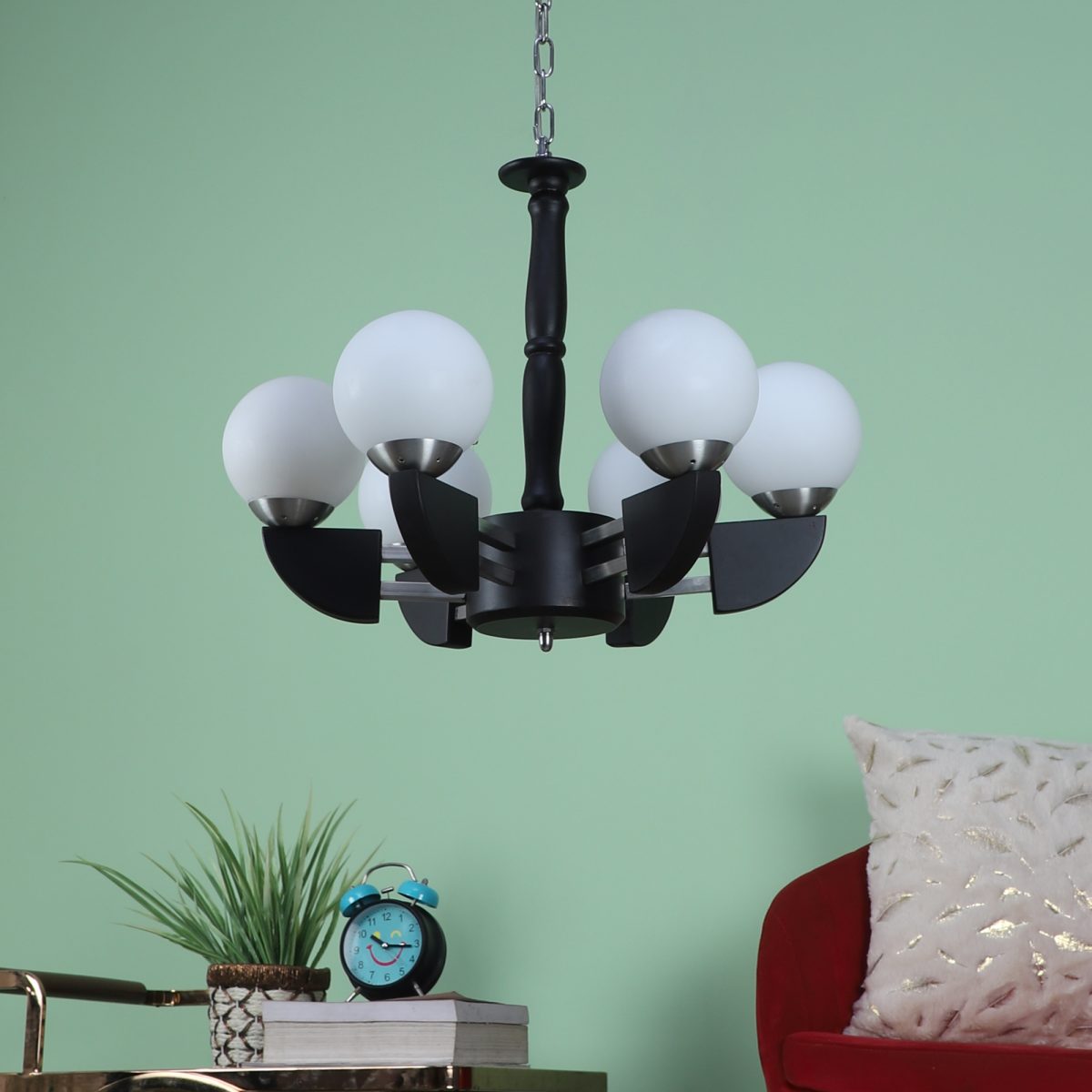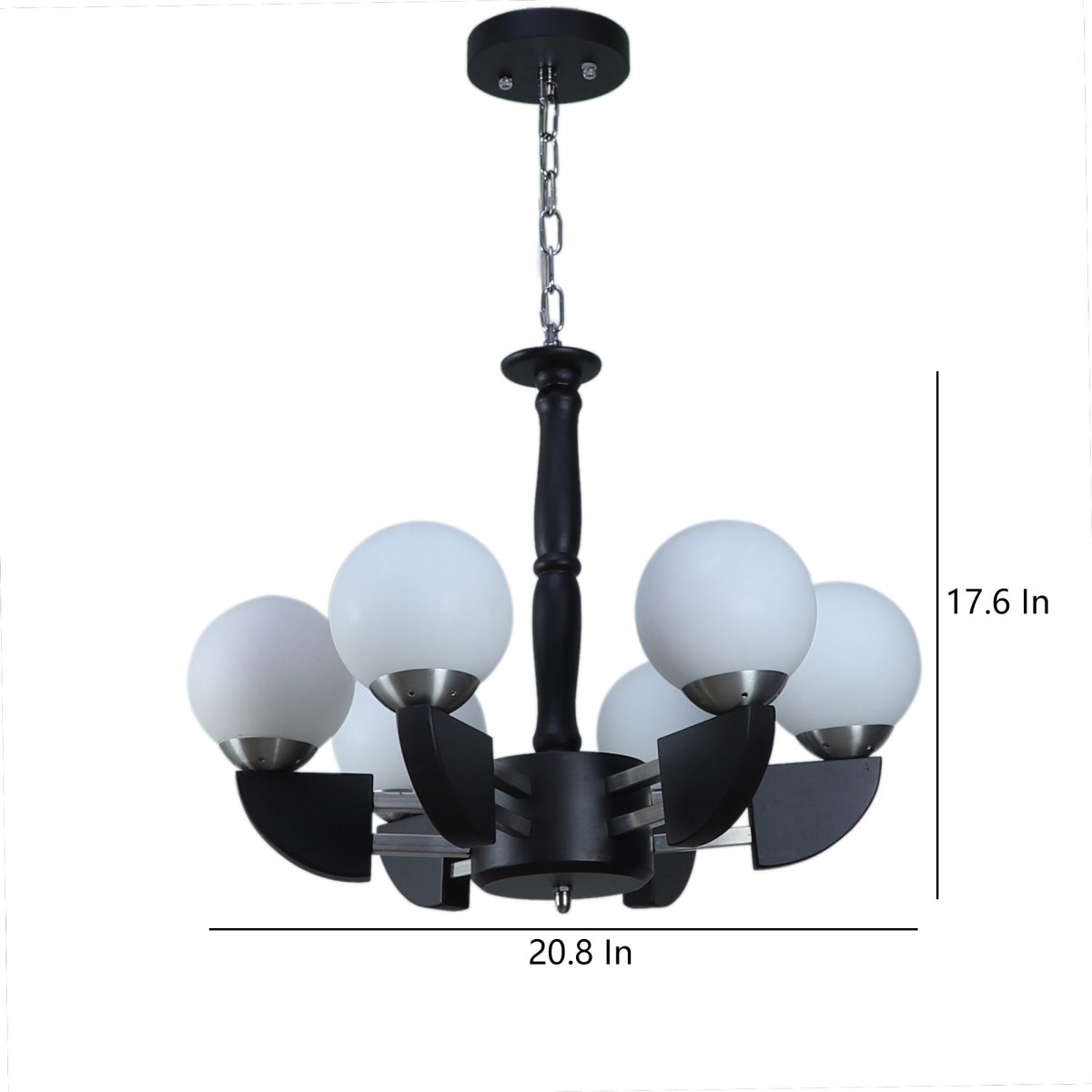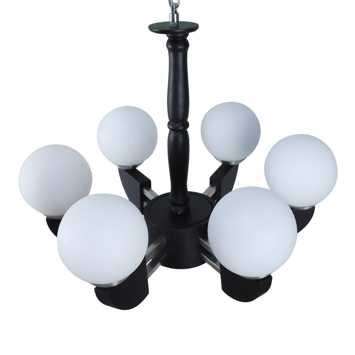 Dark brown (wood), silver (satin nickel) finish, small, round globe (doom) white glass mounted on a designer frame made of mild steel and wood having six lights. This is a hanging type chandelier in which the base plate is fixed to the ceiling with the help of straight clamp and screws. The suspension can be adjusted at time of installation to the desired height. It is maintenance free, easy to remove glass and wash them, comes with an E27 holder, only the change of lamp is required, which is available locally everywhere. Application includes both residential and commercial premises wherever it matches with your interiors. Matching hanging variations – HL3672, HL3672S. Matching wall light code WL1537, WL1538. Can be customized as per requirement in case of bulk quantities. This along with its variants are the best selling products in our catalogue. LAMP NOT INCLUDED.