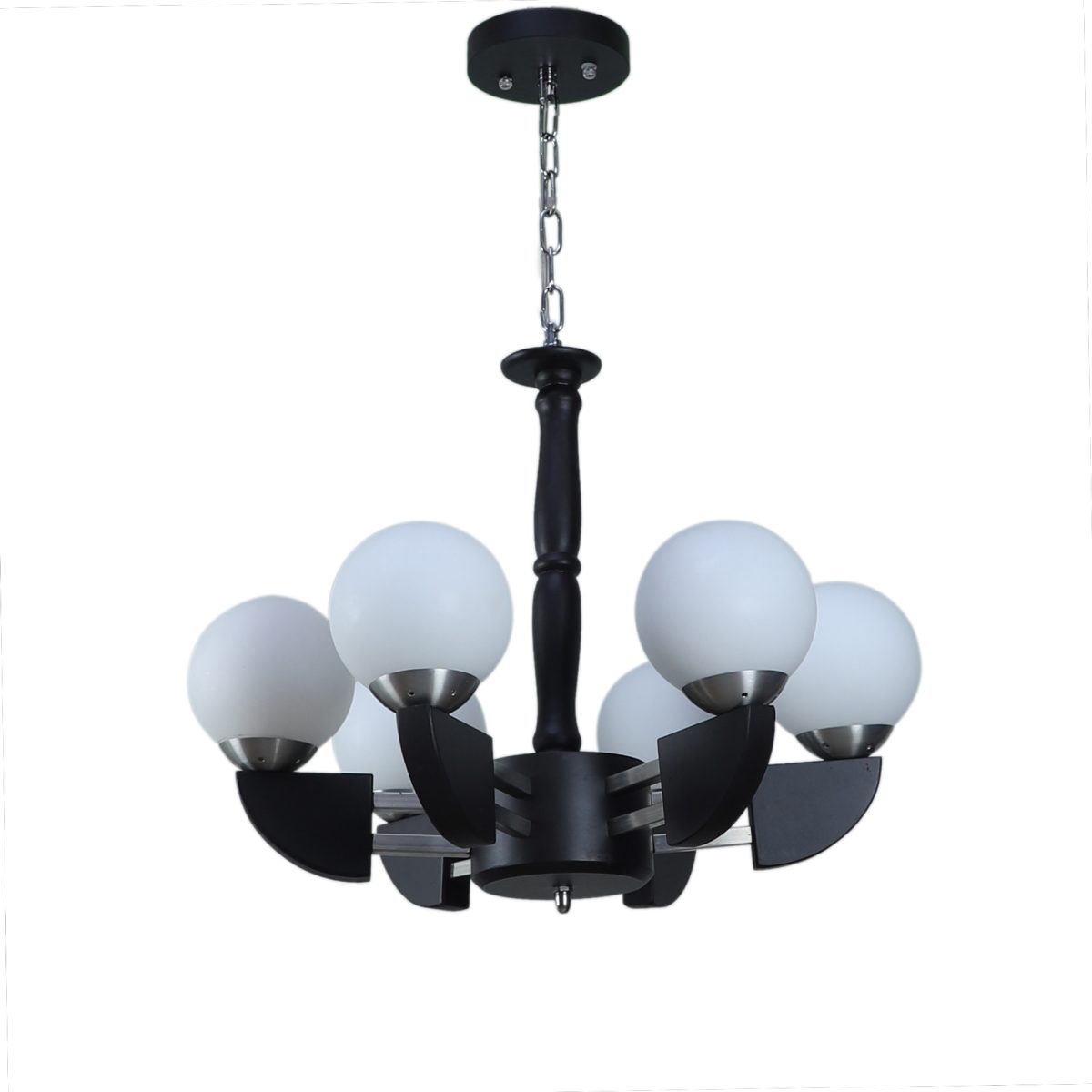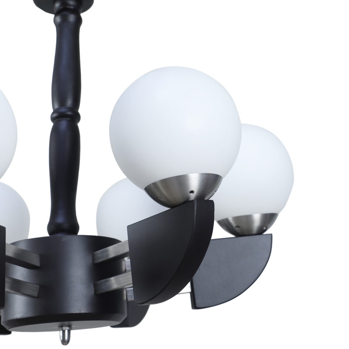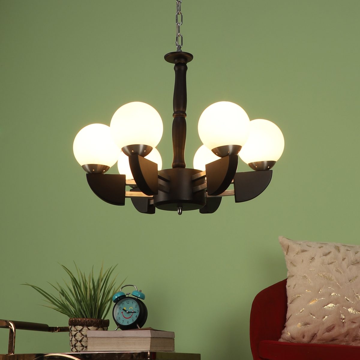 Dark brown (wood), silver (satin nickel) finish, small, round globe (doom) white glass mounted on a designer frame made of mild steel and wood having six lights. This is a hanging type chandelier in which the base plate is fixed to the ceiling with the help of straight clamp and screws. The suspension can be adjusted at time of installation to the desired height. It is maintenance free, easy to remove glass and wash them, comes with an E27 holder, only the change of lamp is required, which is available locally everywhere. Application includes both residential and commercial premises wherever it matches with your interiors. Matching hanging variations – HL3672, HL3672S. Matching wall light code WL1537, WL1538. Can be customized as per requirement in case of bulk quantities. This along with its variants are the best selling products in our catalogue. LAMP NOT INCLUDED.