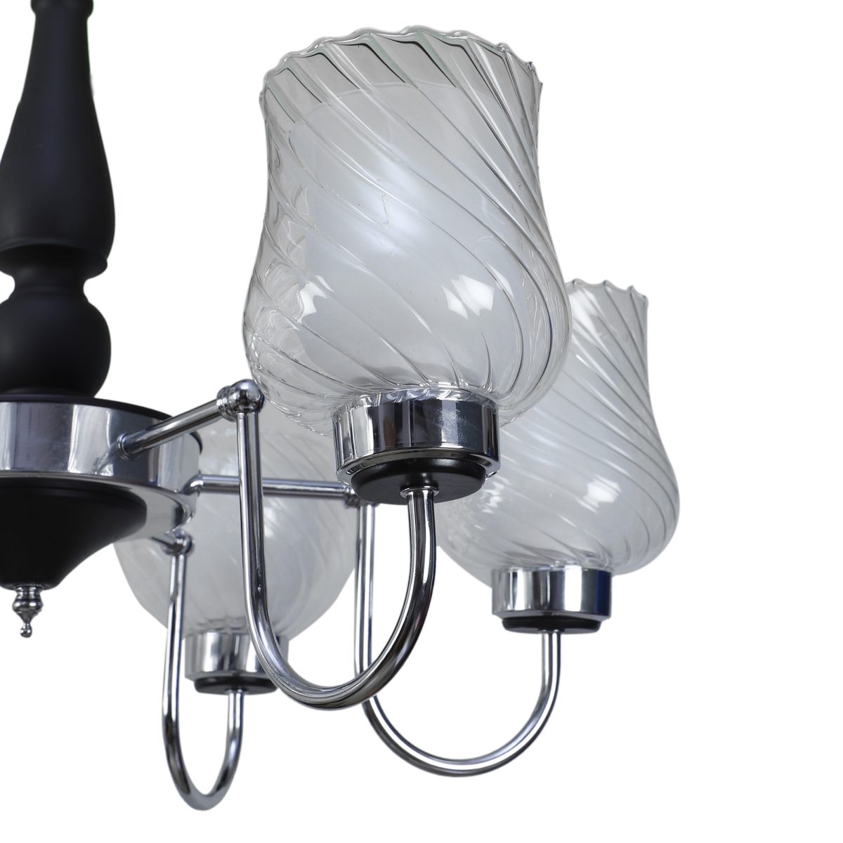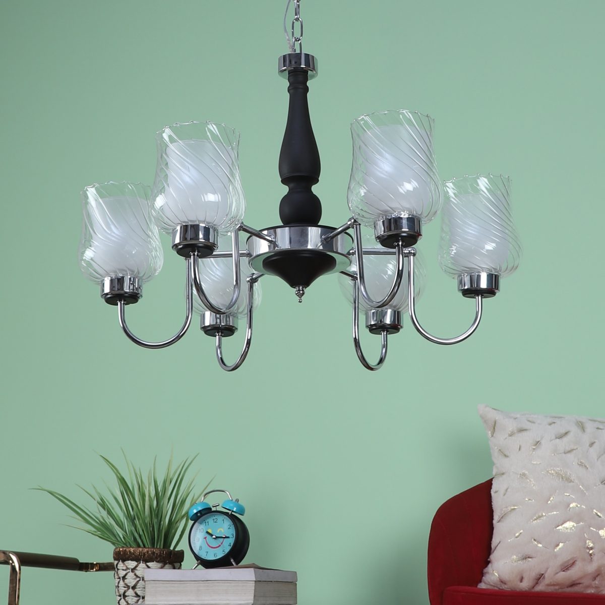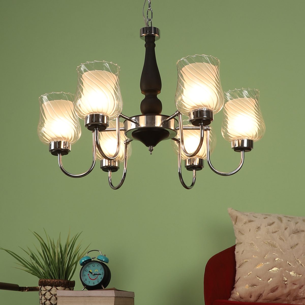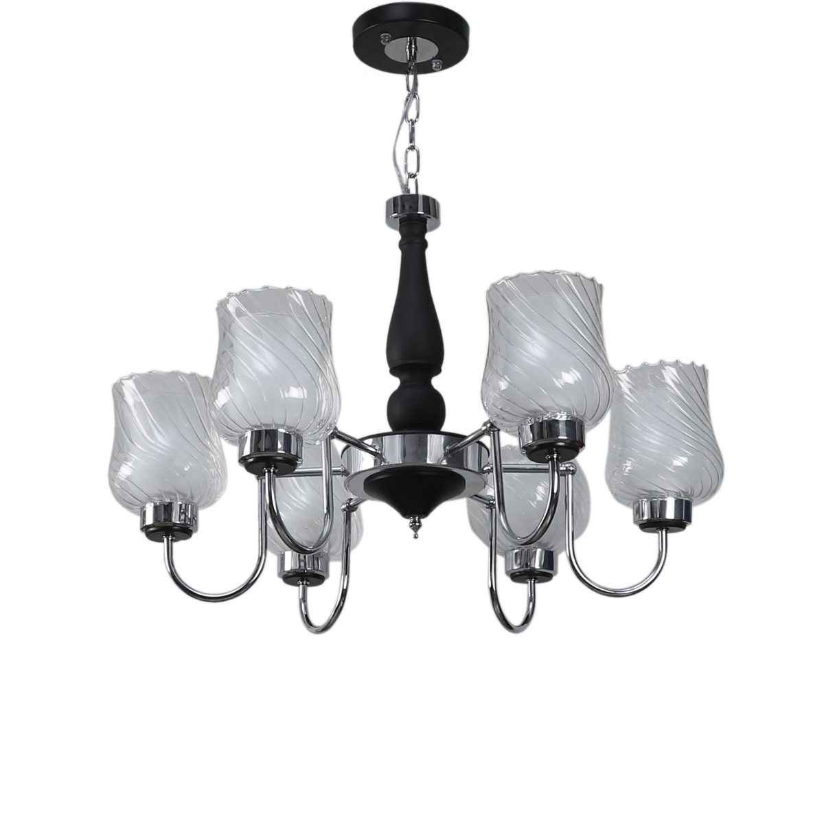 Dark brown (wood), chrome finish, bell shaped two layered glass mounted on a designer frame made of mild steel having six lights. This a a hanging type chandelier in which the base plate is fixed to the ceiling with the help of straight clamp and screws. The suspension can be adjusted at time of installation to the desired height. It is maintenance free, easy to remove glass and wash them Comes with an E27 holder, only the change of lamp is required, which is available locally everywhere. Application includes both residential and commercial premises wherever it matches with your interiors. Matching wall light code WL2085, WL2086. Matching hanging light code – HL3961-1, HL3961-3 Can be customized as per requirement in case of bulk quantities. LAMP NOT INCLUDED.