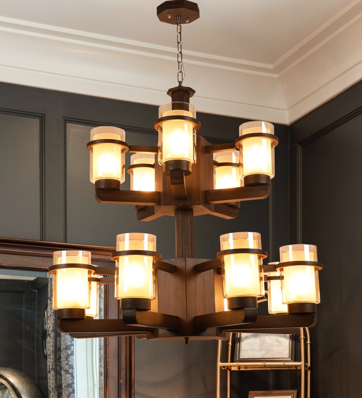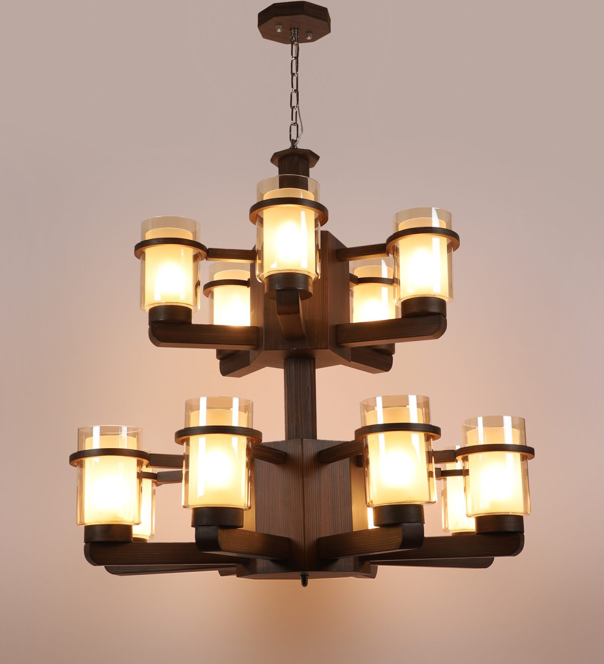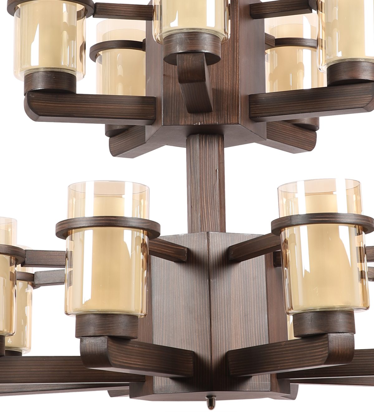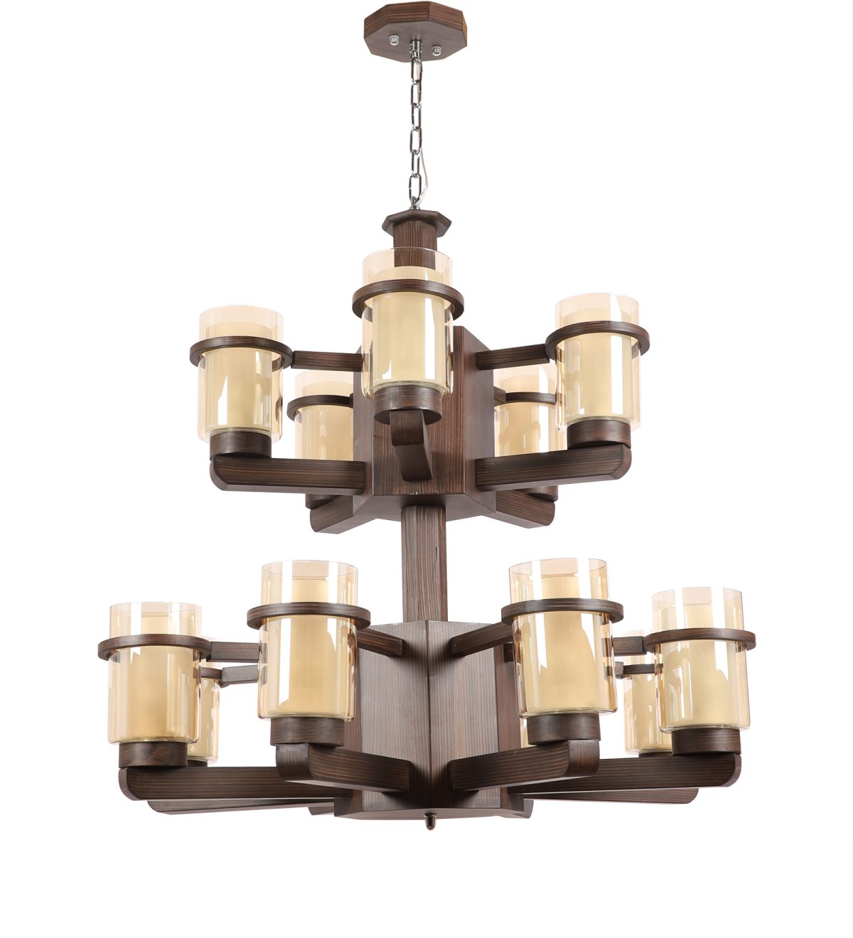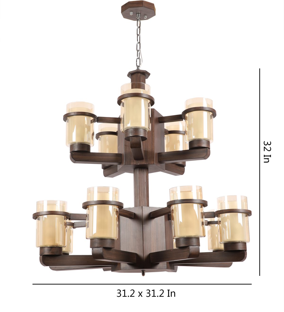 Dark brown (wood), round, cylindrical two layered champagne coloured glass mounted on a designer frame made of wood having thirteen lights. This is a hanging type chandelier in which the base plate is fixed to the ceiling with the help of straight clamp and screws. The suspension can be adjusted at time of installation to the desired height. It is maintenance free, easy to remove glass and wash them. Comes with an E27 holder, only the change of lamp is required, which is available locally everywhere. Application includes both residential and commercial premises wherever it matches with your interiors. Matching wall light code WL2079. WL2080. Also available in six and eight lights with code CH347 and CH429-8. Can be customized as per requirement in case of bulk quantities. This along with its variants are the best selling products in our catalogue. LAMP NOT INCLUDED.