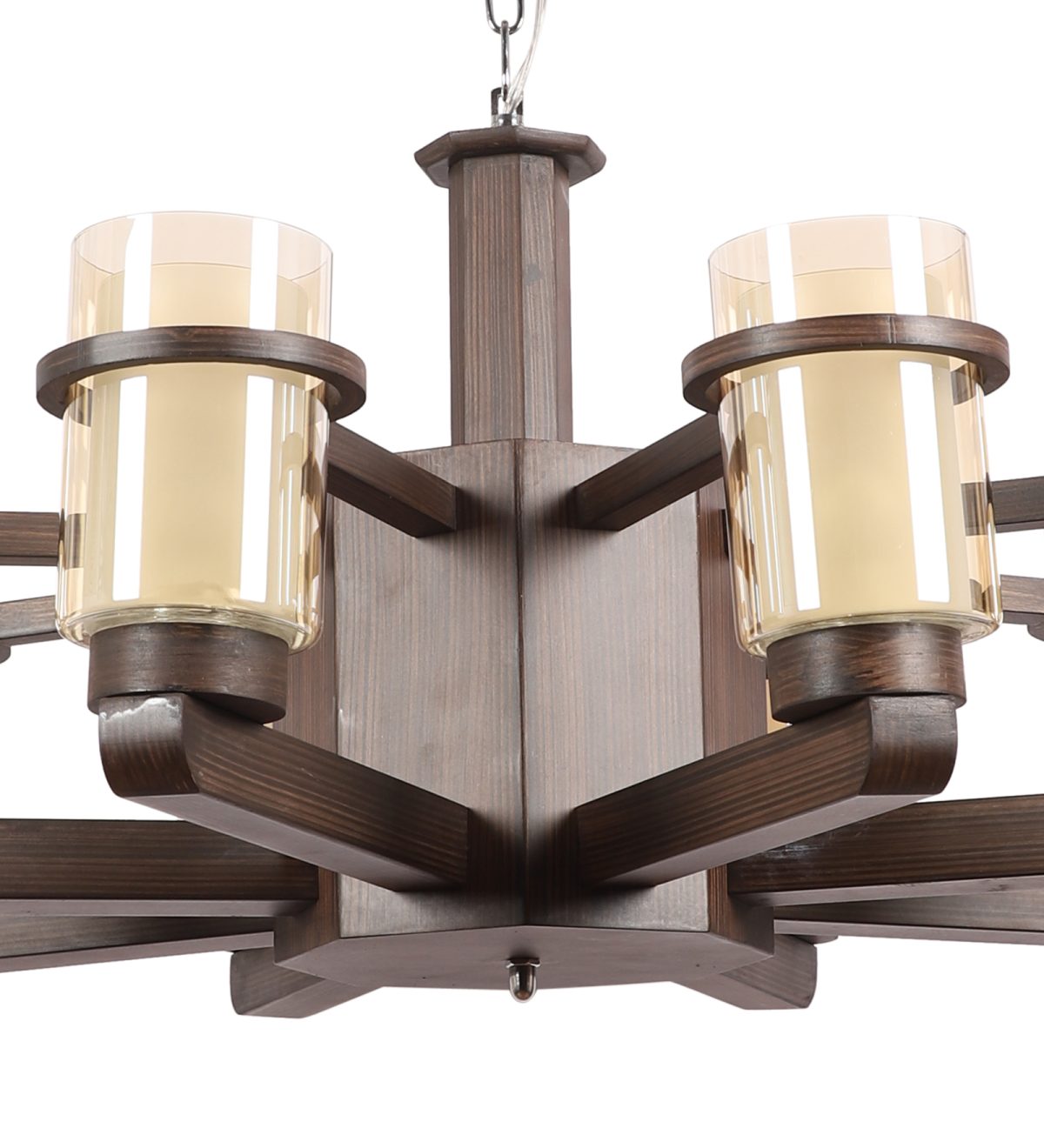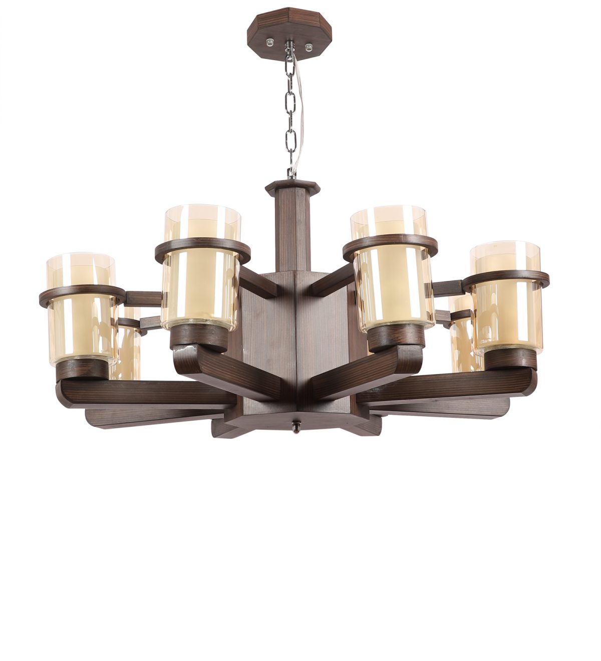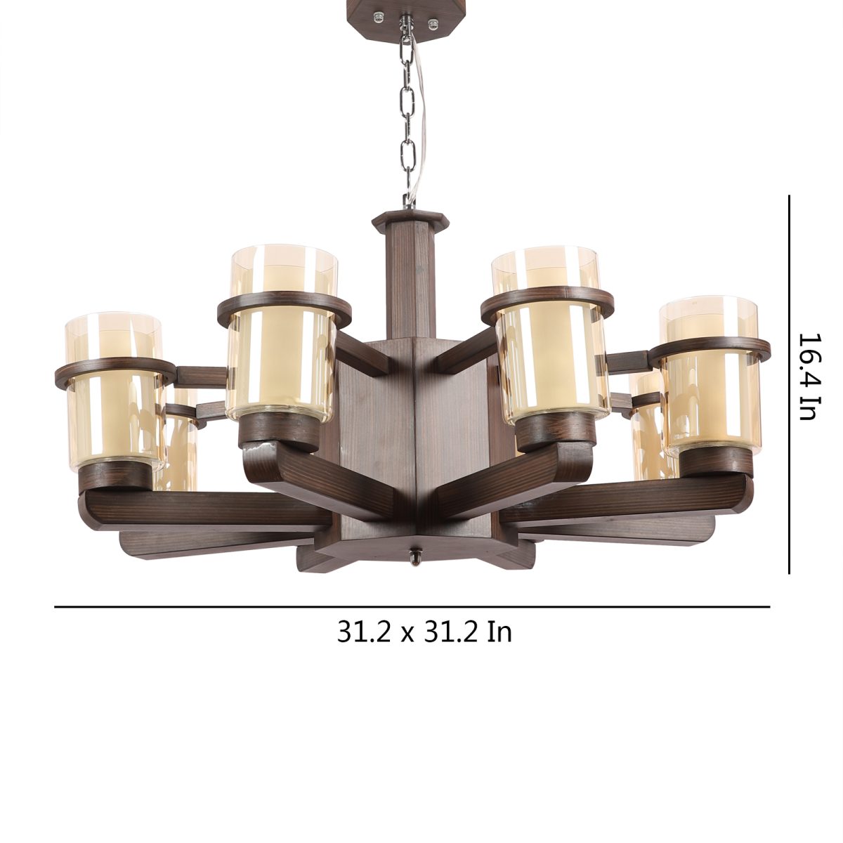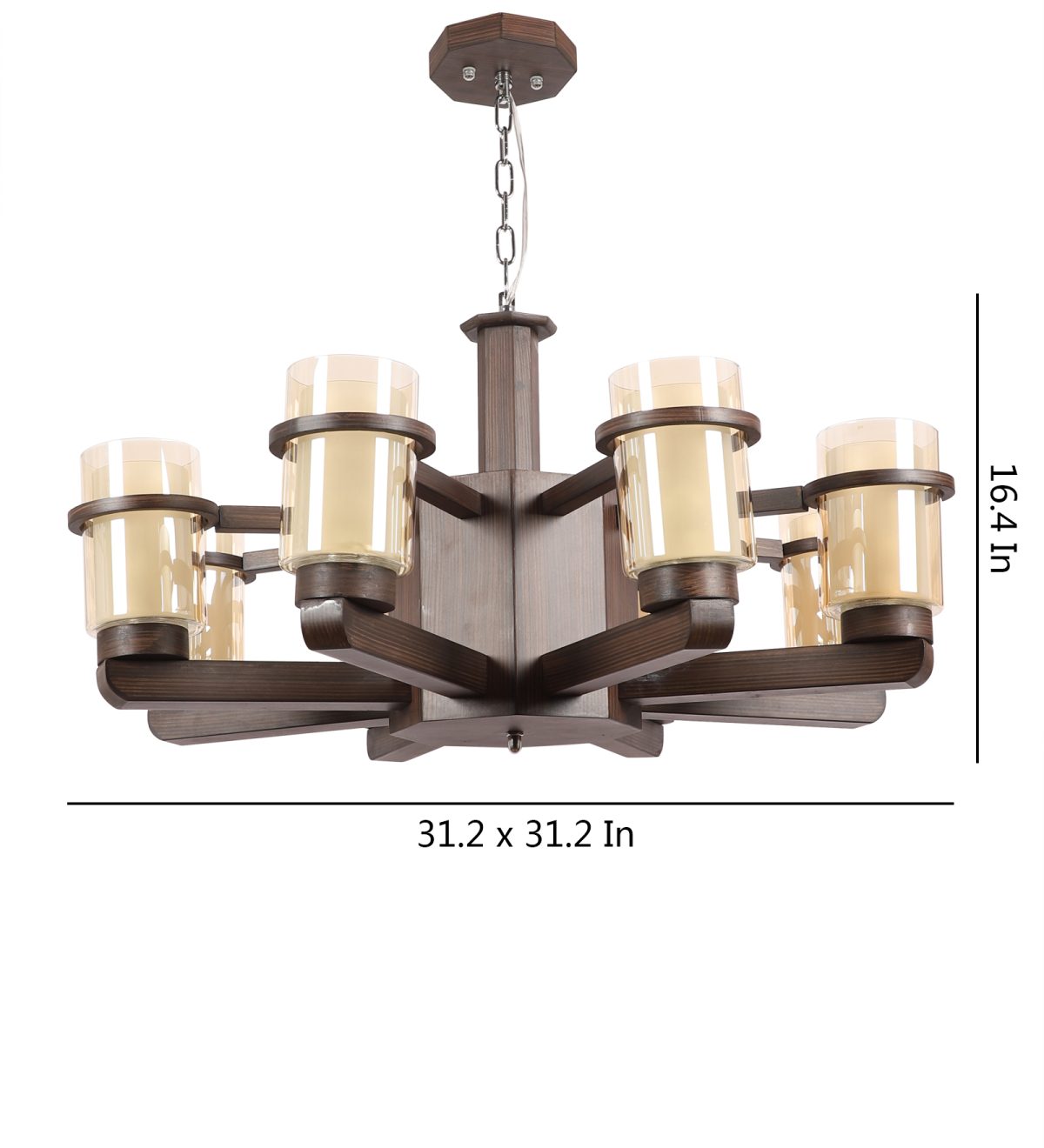 Dark brown (wood), round, cylindrical two layered champagne coloured glass mounted on a designer frame made of wood having eight lights. This is a hanging type chandelier in which the base plate is fixed to the ceiling with the help of straight clamp and screws. The suspension can be adjusted at time of installation to the desired height. It is maintenance free, easy to remove glass and wash them. Comes with an E27 holder, only the change of lamp is required, which is available locally everywhere. Application includes both residential and commercial premises wherever it matches with your interiors. Matching wall light code WL2079. WL2080. Also available in six and thirteen lights with code CH347 and CH429-13. Can be customized as per requirement in case of bulk quantities. This along with its variants are the best selling products in our catalogue. LAMP NOT INCLUDED.