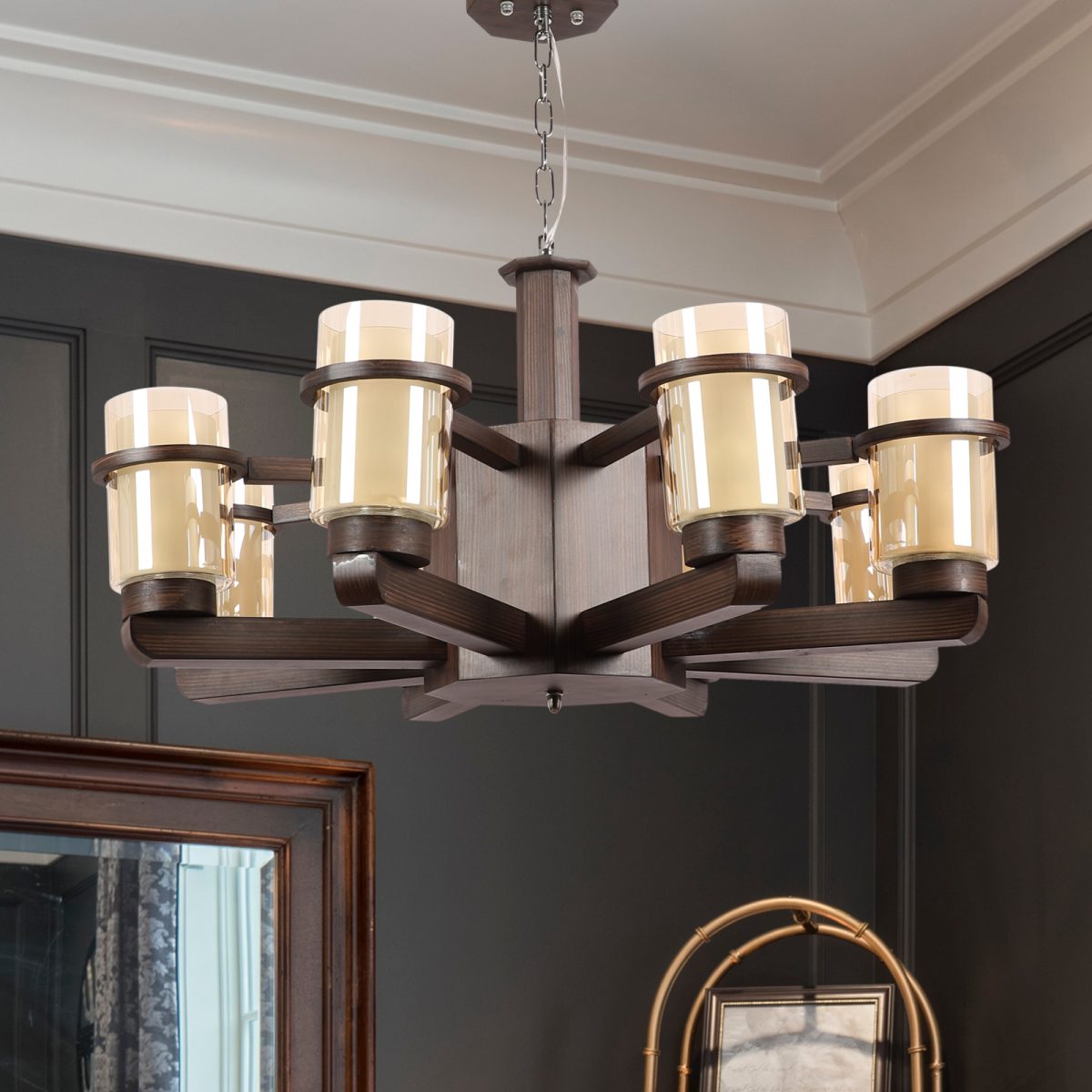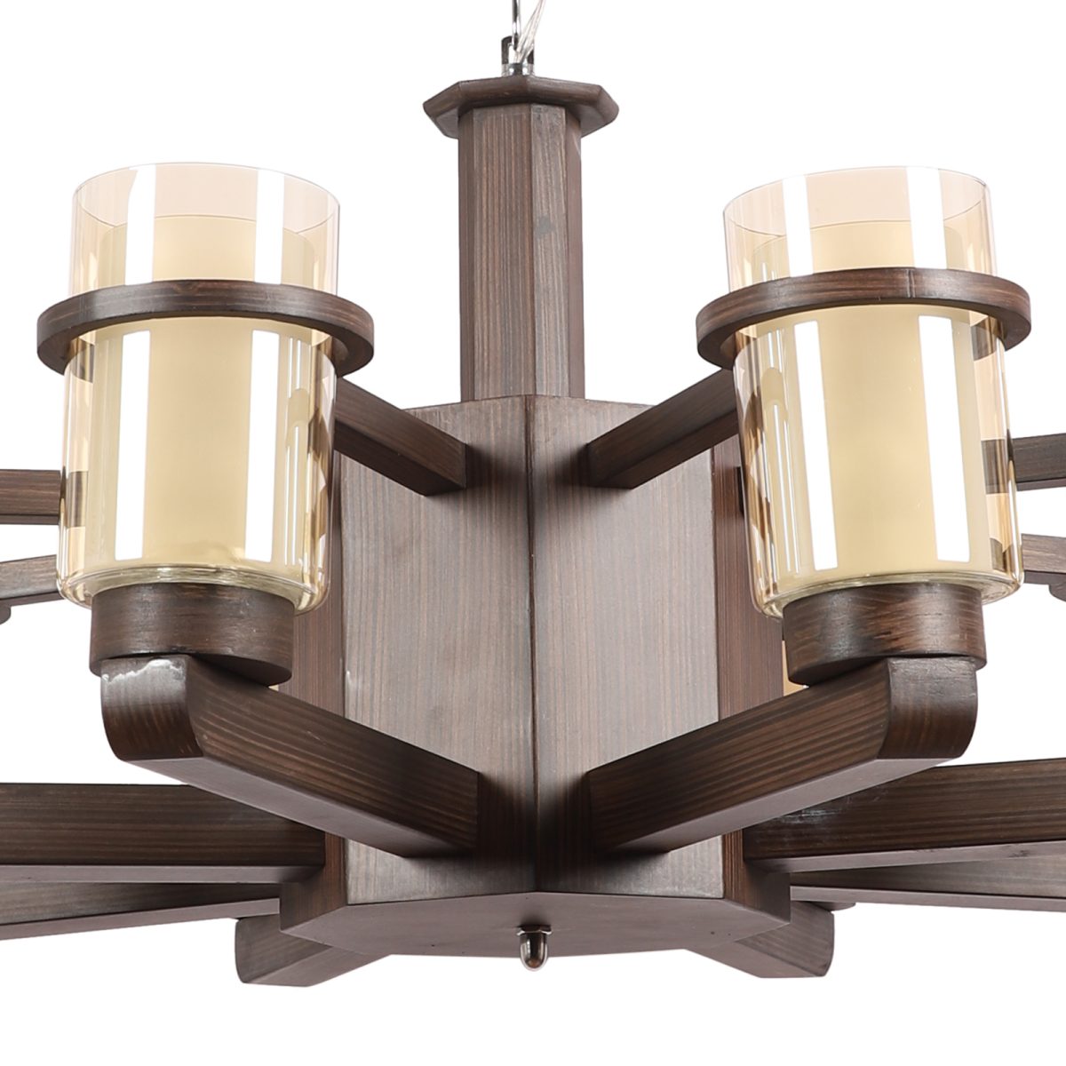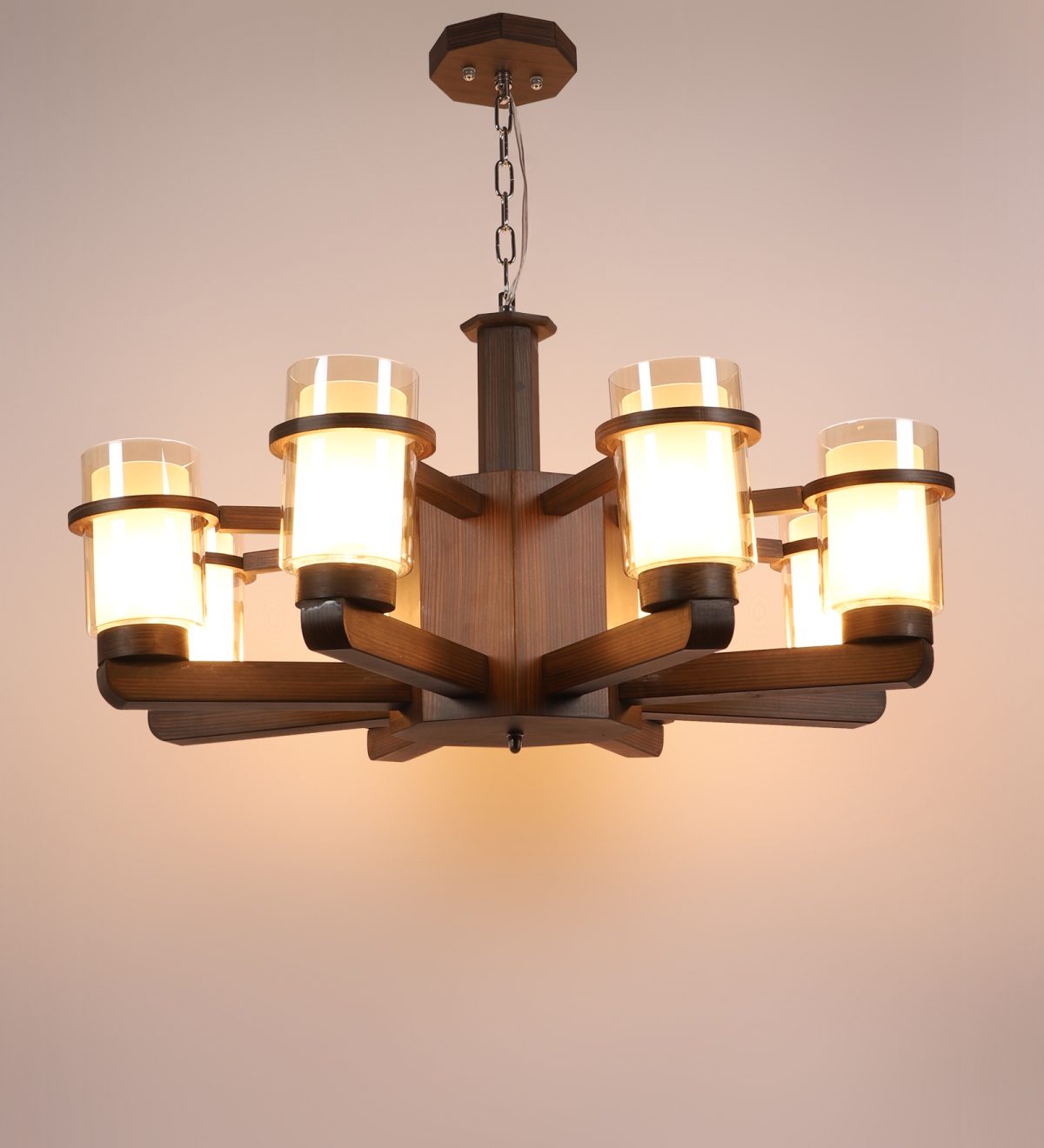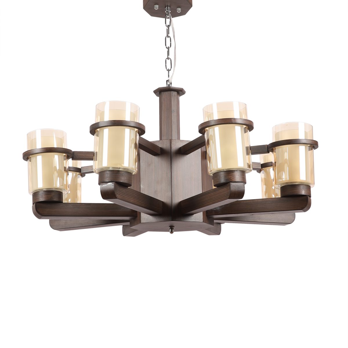 Dark brown (wood), round, cylindrical two layered champagne coloured glass mounted on a designer frame made of wood having eight lights. This is a hanging type chandelier in which the base plate is fixed to the ceiling with the help of straight clamp and screws. The suspension can be adjusted at time of installation to the desired height. It is maintenance free, easy to remove glass and wash them. Comes with an E27 holder, only the change of lamp is required, which is available locally everywhere. Application includes both residential and commercial premises wherever it matches with your interiors. Matching wall light code WL2079. WL2080. Also available in six and thirteen lights with code CH347 and CH429-13. Can be customized as per requirement in case of bulk quantities. This along with its variants are the best selling products in our catalogue. LAMP NOT INCLUDED.