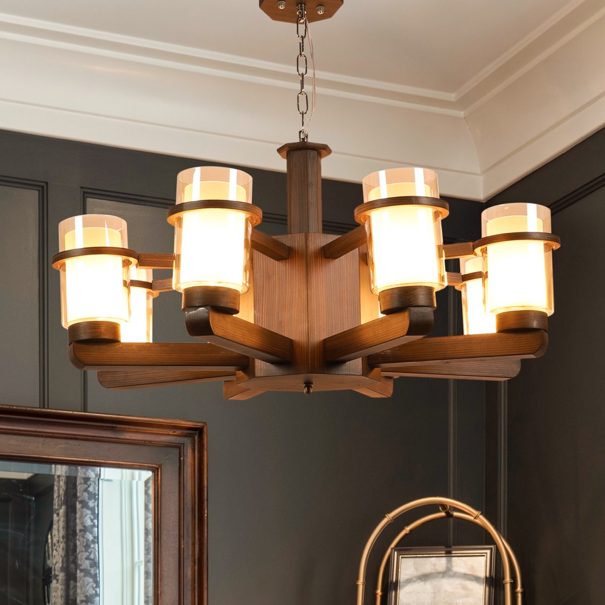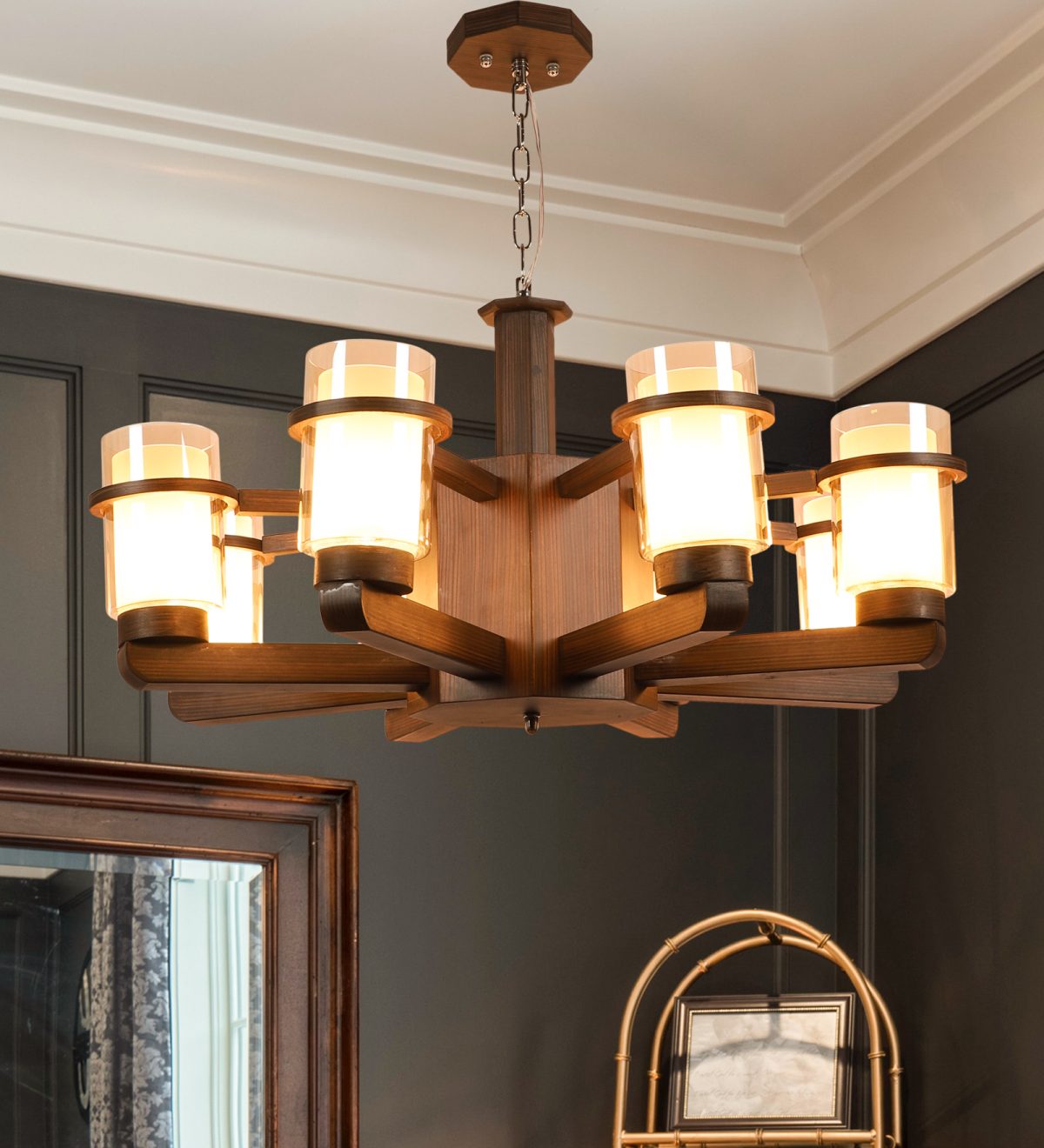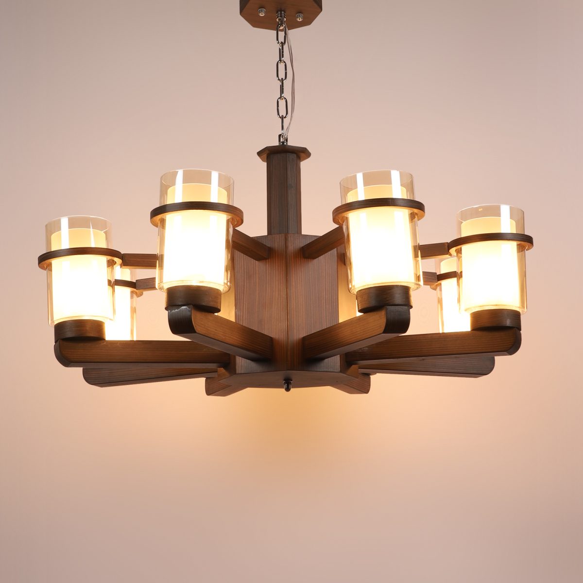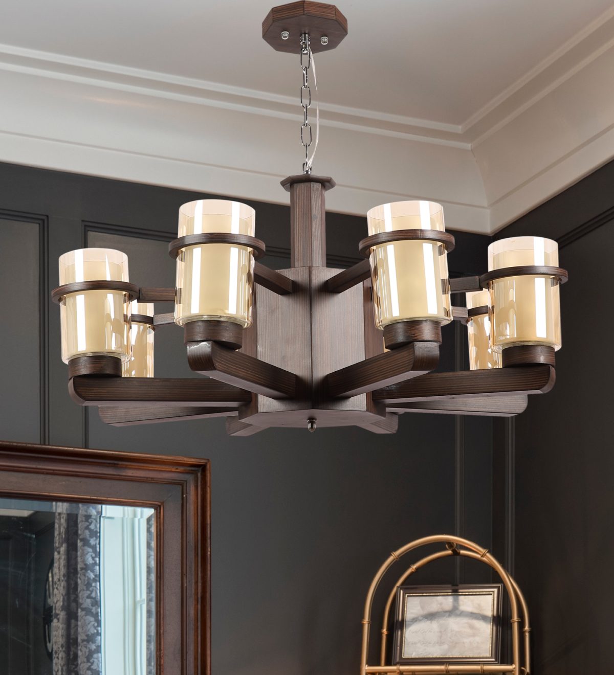 Dark brown (wood), round, cylindrical two layered champagne coloured glass mounted on a designer frame made of wood having eight lights. This is a hanging type chandelier in which the base plate is fixed to the ceiling with the help of straight clamp and screws. The suspension can be adjusted at time of installation to the desired height. It is maintenance free, easy to remove glass and wash them. Comes with an E27 holder, only the change of lamp is required, which is available locally everywhere. Application includes both residential and commercial premises wherever it matches with your interiors. Matching wall light code WL2079. WL2080. Also available in six and thirteen lights with code CH347 and CH429-13. Can be customized as per requirement in case of bulk quantities. This along with its variants are the best selling products in our catalogue. LAMP NOT INCLUDED.