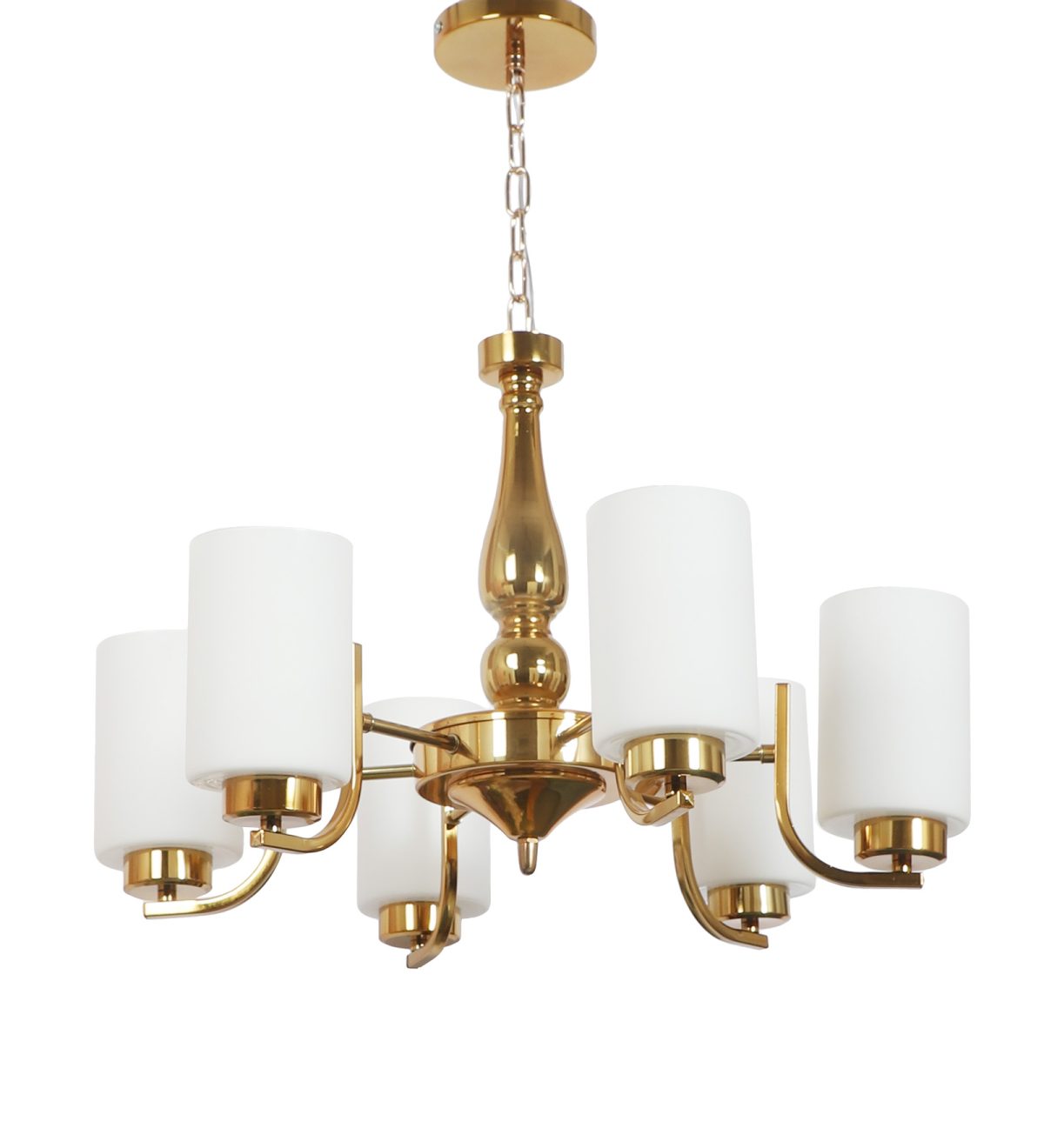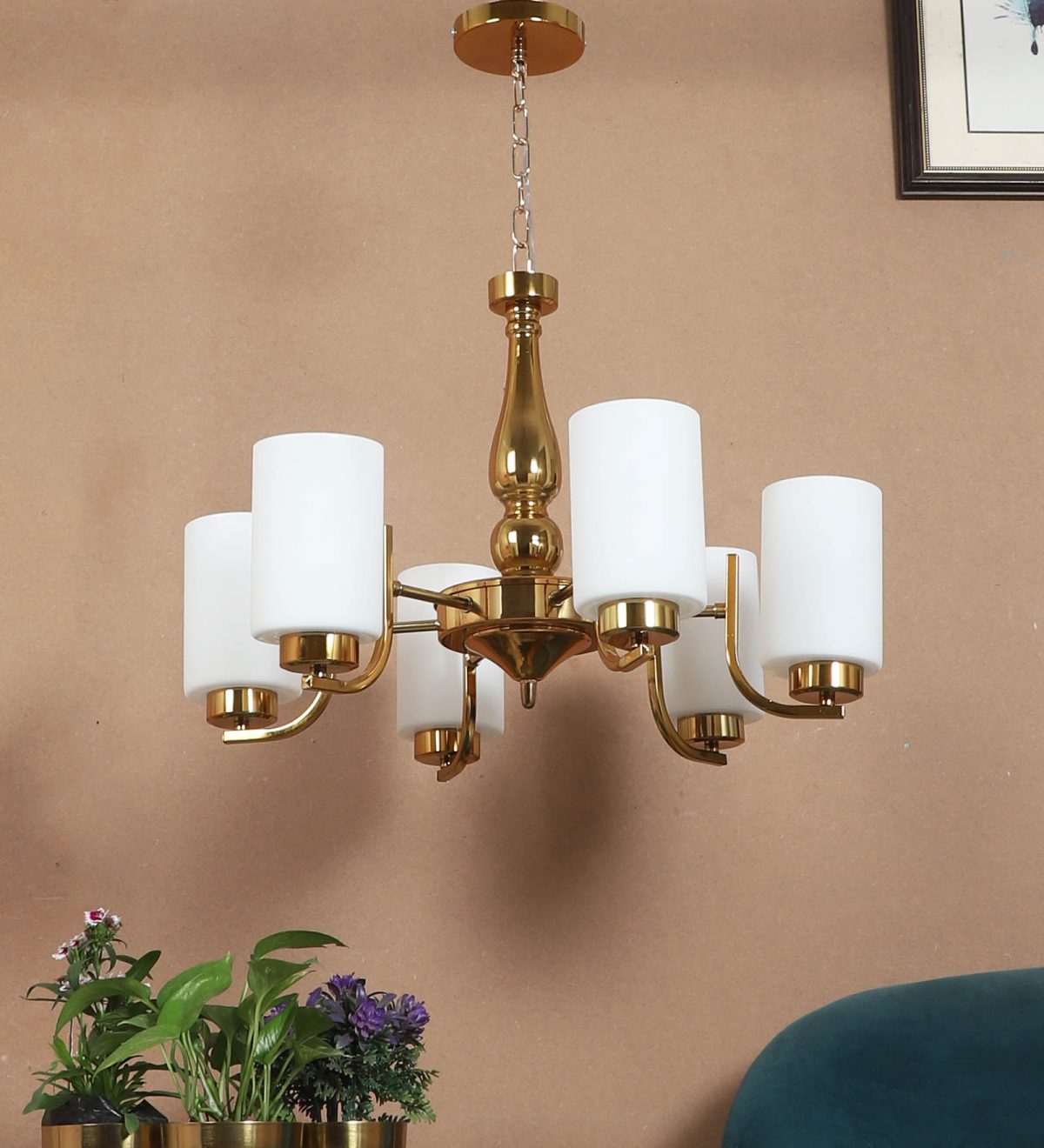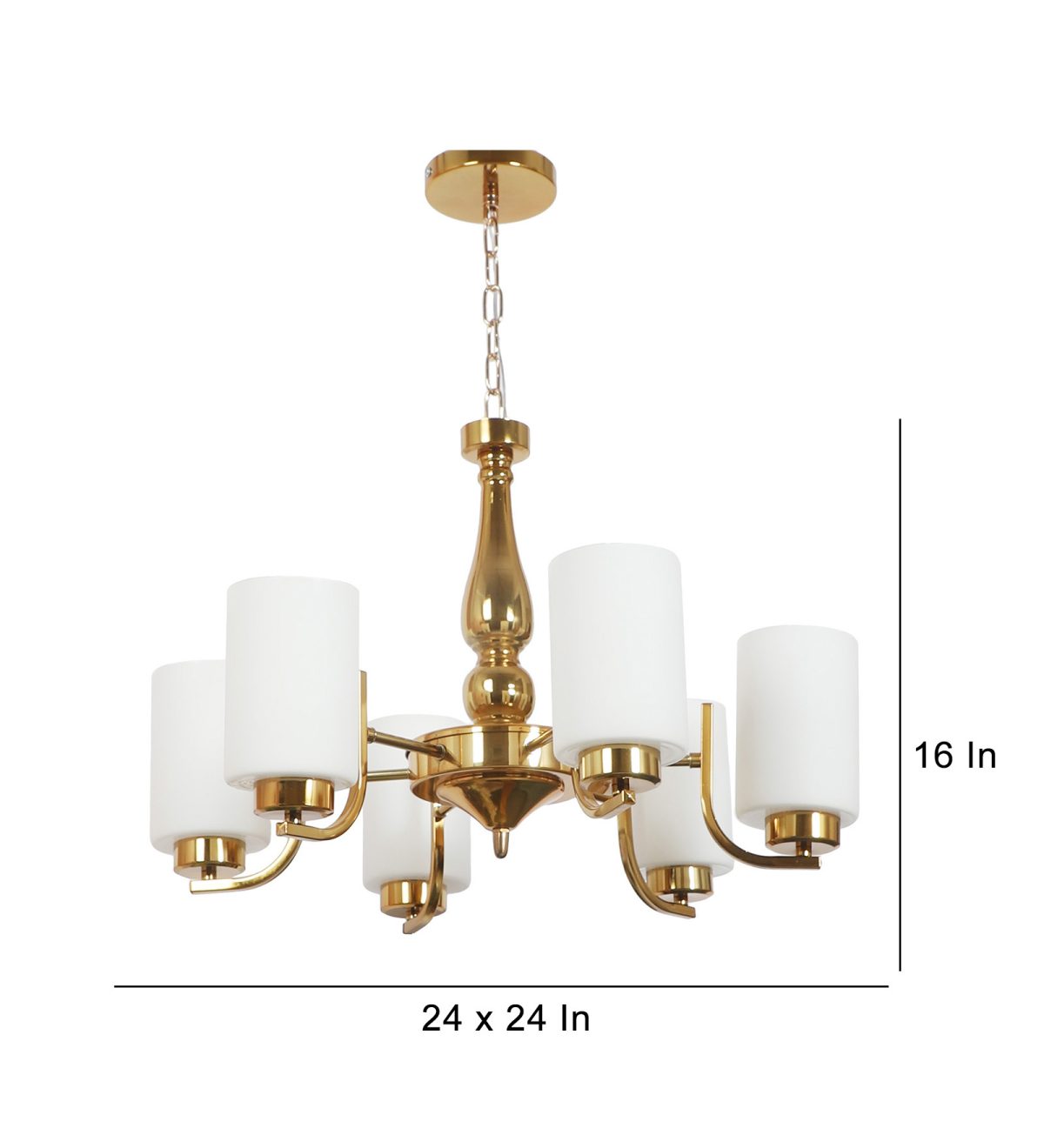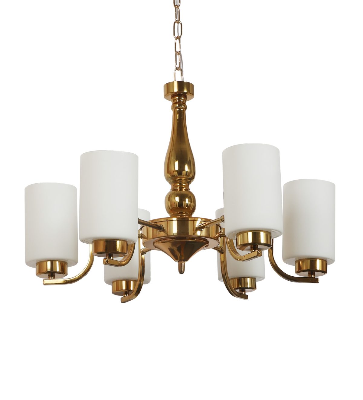 Gold finish chandellier having six lights.The suspension can be adjusted at time of installation to the desired height. It is maintenance free, it is easy to remove glasses and wash them. Comes with an E27 holder. Can be customized as per requirement. Other sizes can be made as per requirement. LAMP NOT INCLUDED.