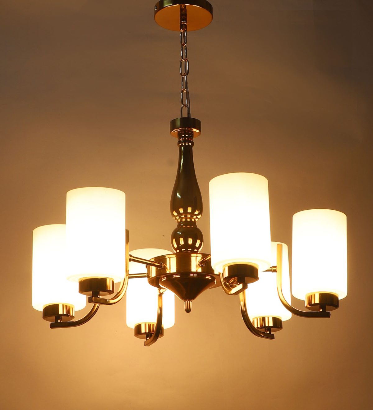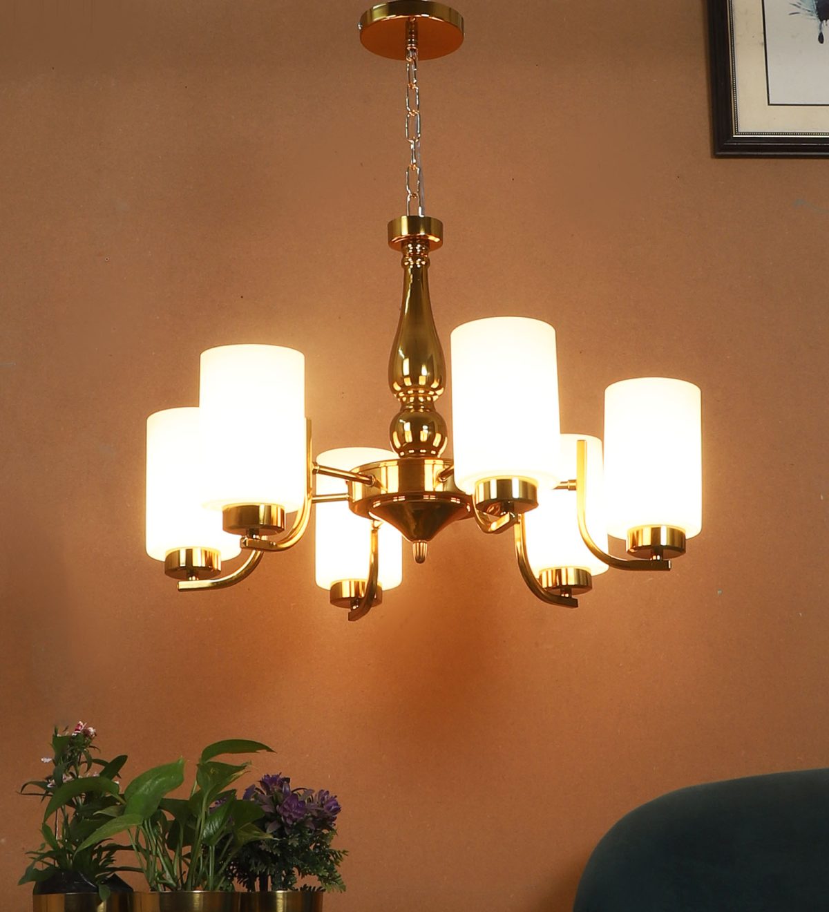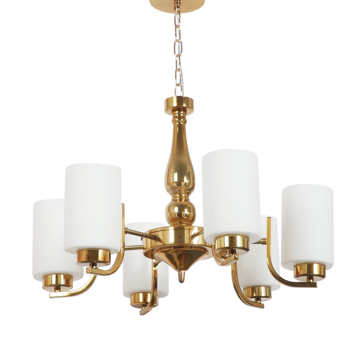 Gold finish chandellier having six lights.The suspension can be adjusted at time of installation to the desired height. It is maintenance free, it is easy to remove glasses and wash them. Comes with an E27 holder. Can be customized as per requirement. Other sizes can be made as per requirement. LAMP NOT INCLUDED.