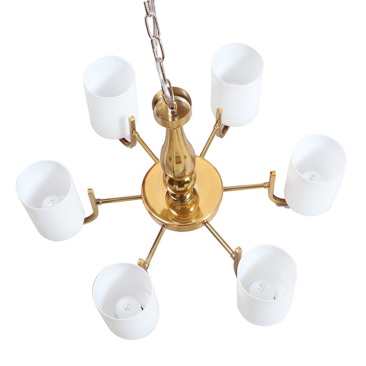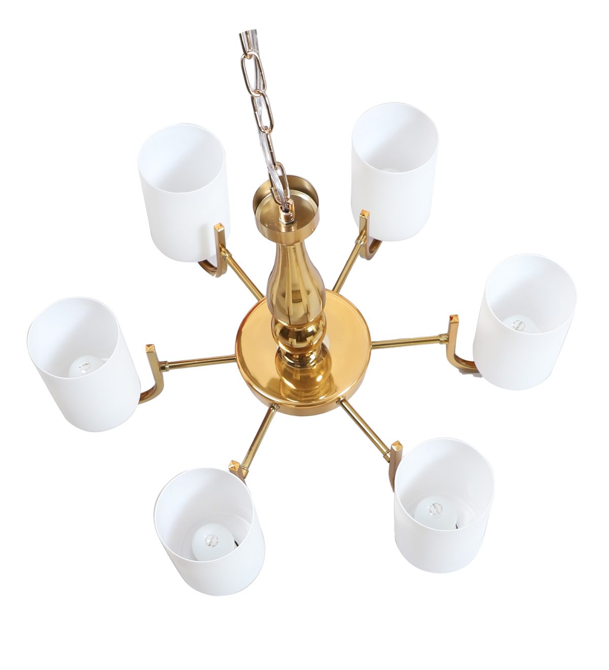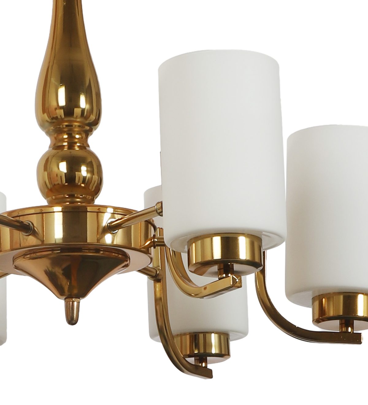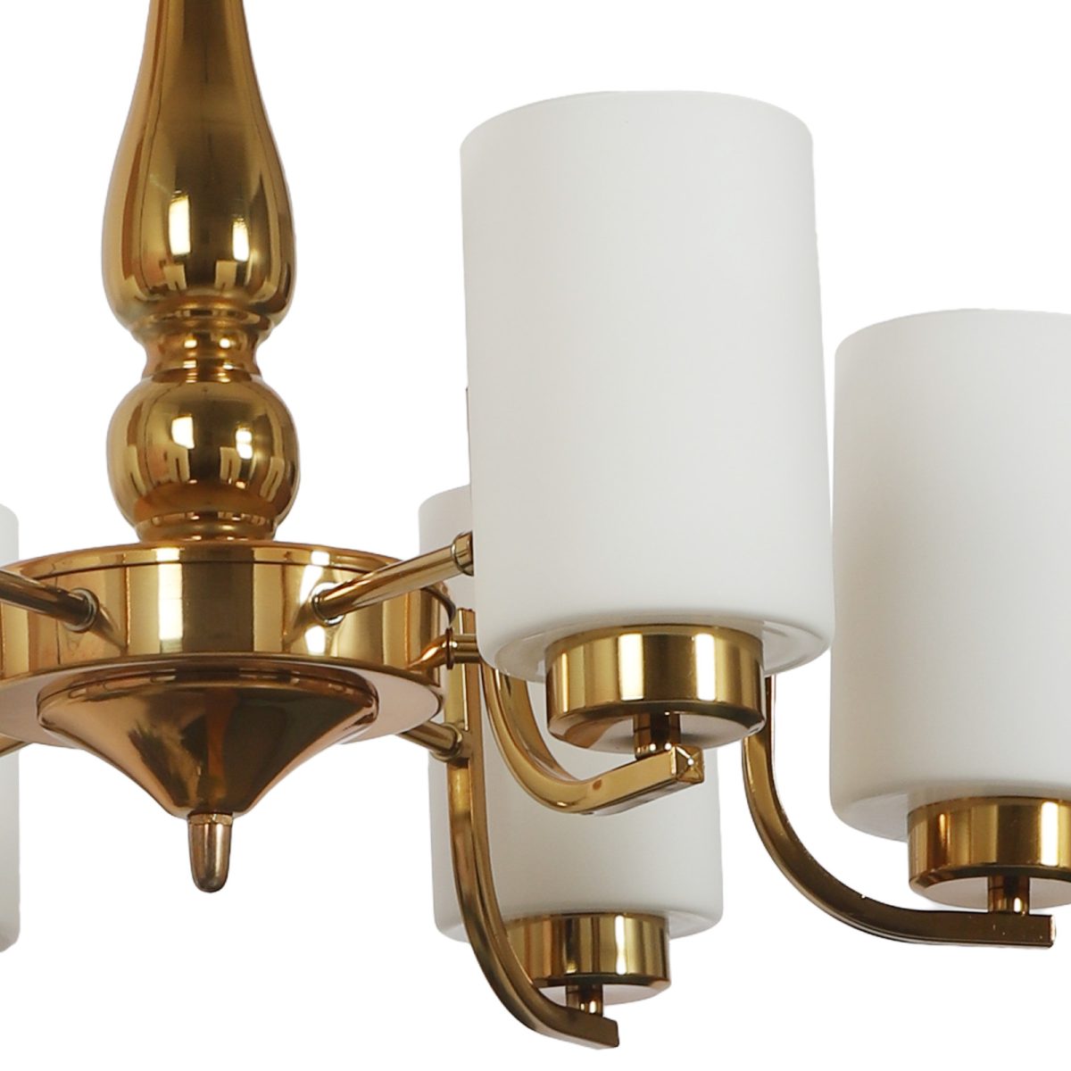 Gold finish chandellier having six lights.The suspension can be adjusted at time of installation to the desired height. It is maintenance free, it is easy to remove glasses and wash them. Comes with an E27 holder. Can be customized as per requirement. Other sizes can be made as per requirement. LAMP NOT INCLUDED.