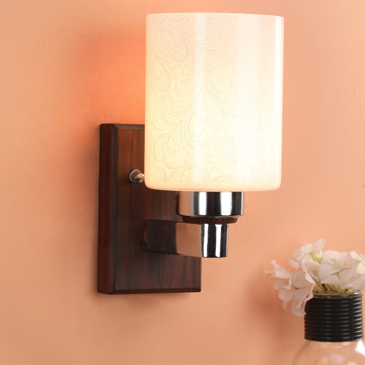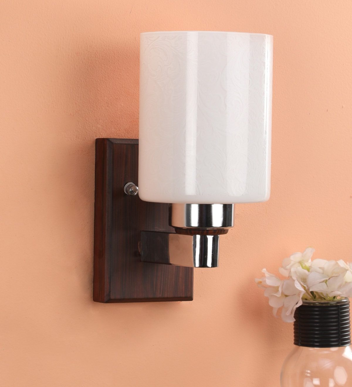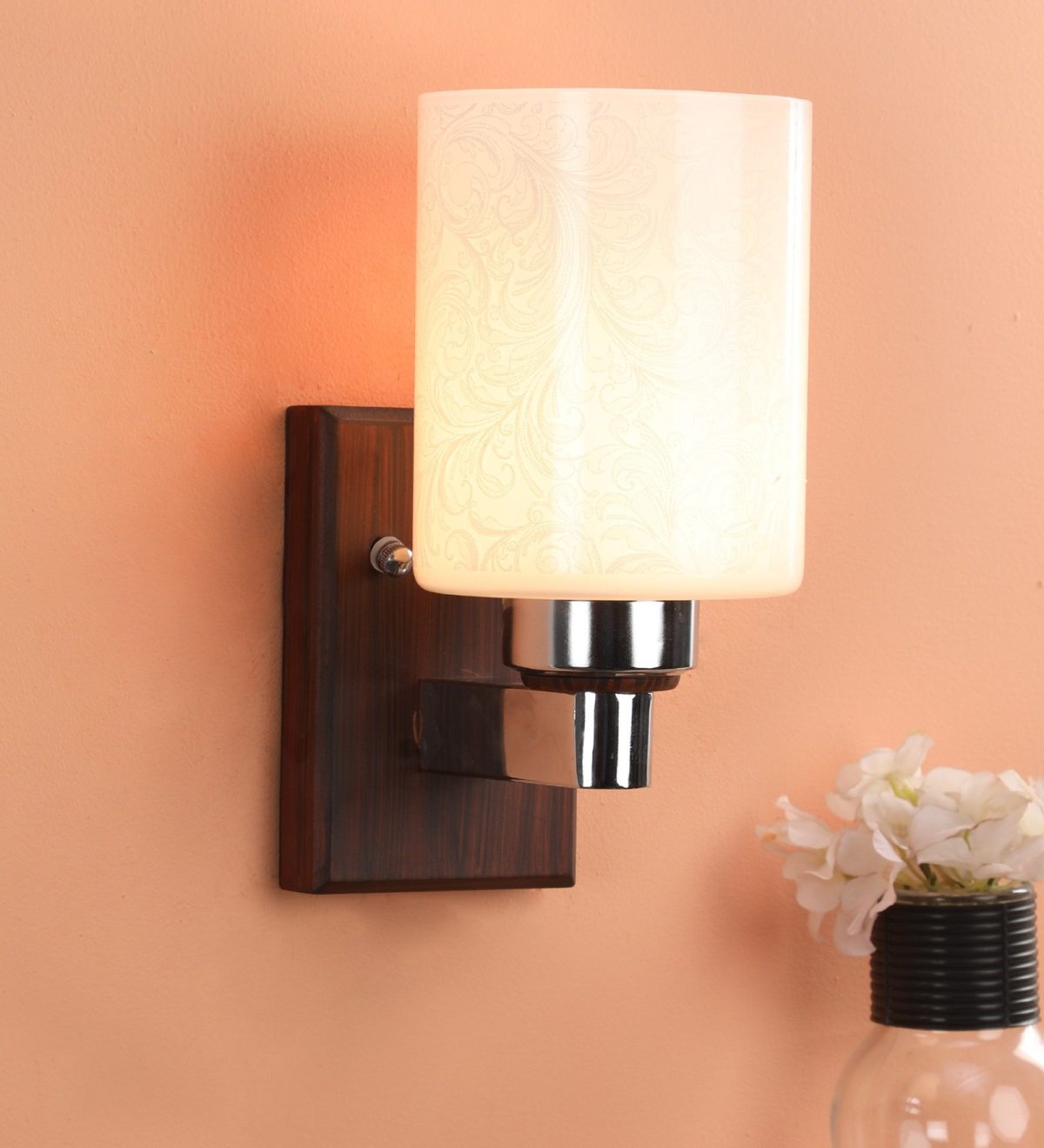 Modern dark brown. silver (wood – chrome) finish single wall light made of wood and mild steel, with a round cylindrical long white glass with a floral design. Looks amazing when lit. It is maintenance free, easy to remove glass and wash it, comes with an E27 holder, only the change of lamp is required, which is available locally everywhere. You can of course swap out the bulb for one that is dimmable, has a higher light output or a different color temperature. Application includes both residential and commercial premises wherever it matches with your interiors. Matching double wall light code – WL1942. Can be customized as per requirement in case of bulk quantities. Lamp not included.