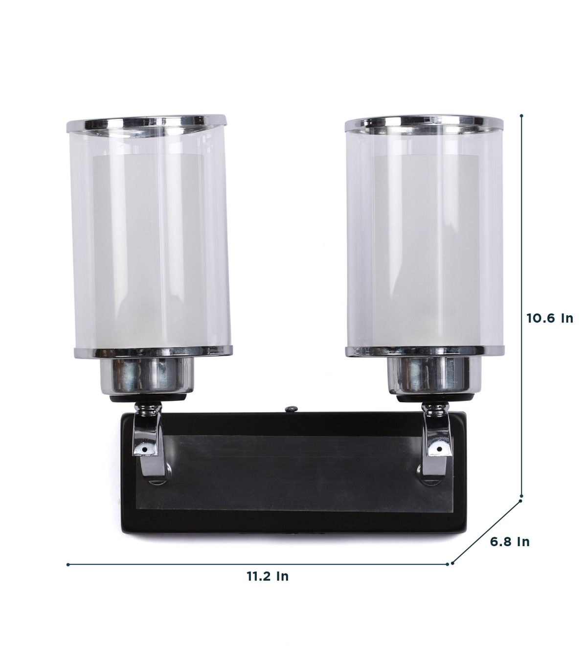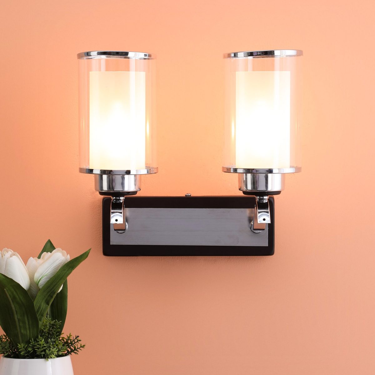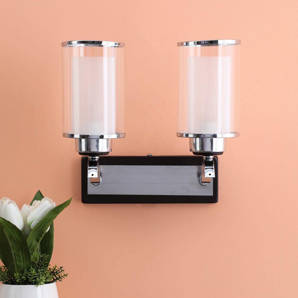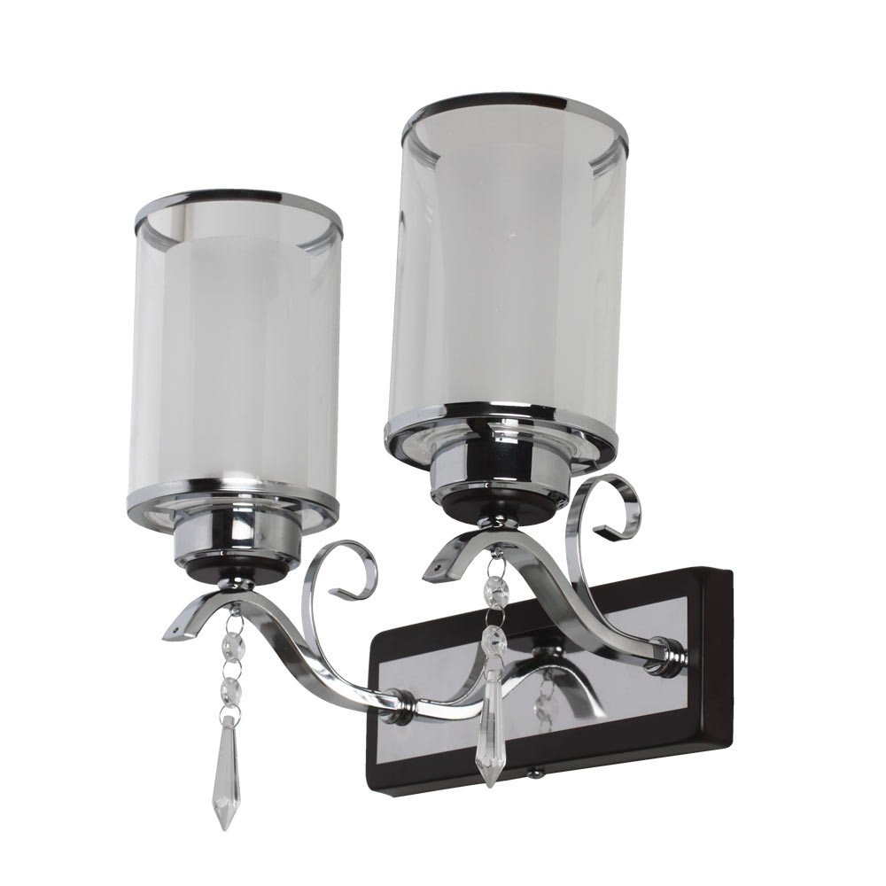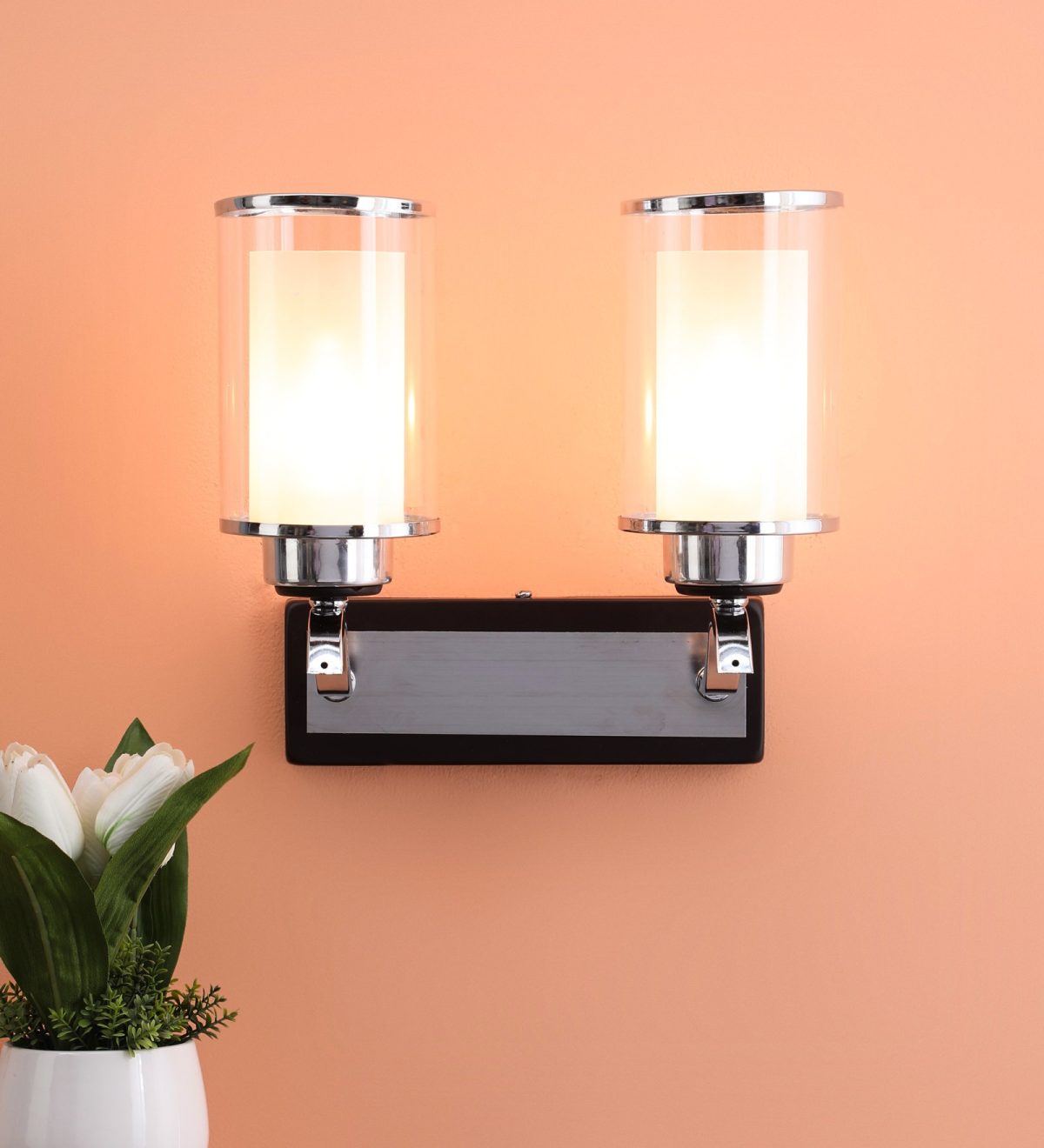 Dark brown, silver (wood – chrome) finish, round cylindrical double layered glass with chrome ring at both the edges, double wall light. It is maintenance free, easy to remove glass and wash them. Comes with an E27 holder, only the change of lamp is required, which is available locally everywhere. Application includes both residential and commercial premises wherever it matches with your interiors. Matching single wall light code WL2103. Matching chandelier code – CH323. Can be customized as per requirement in case of bulk quantities. Lamp not included.