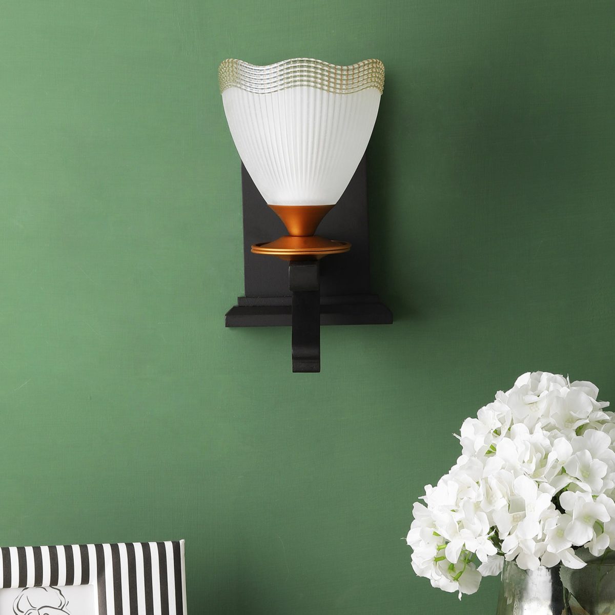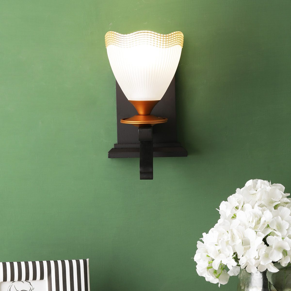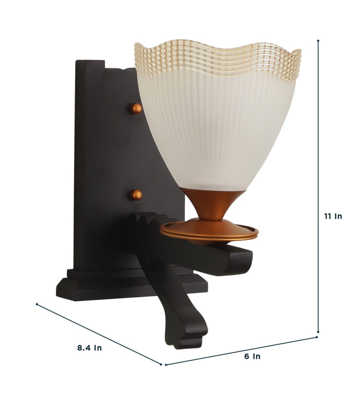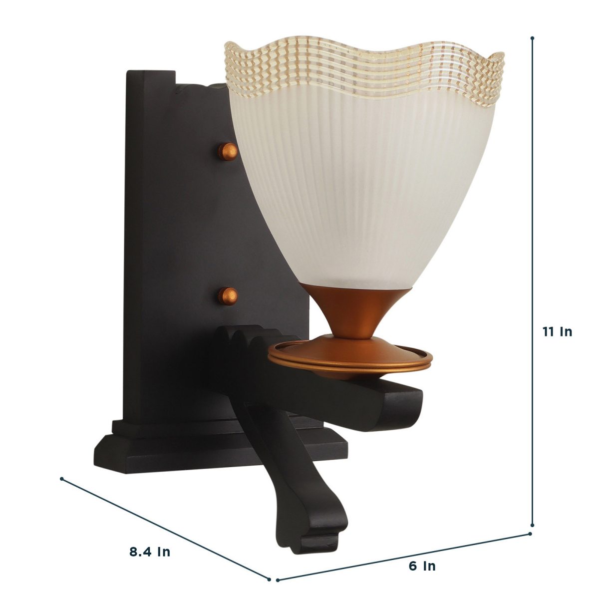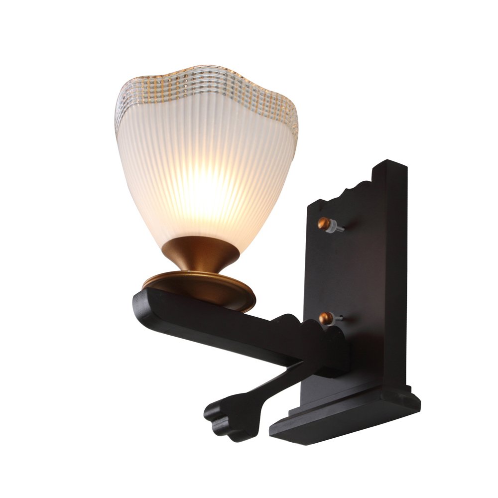 Dark brown (wood), gold finish, taper frosted glass with golden border single wall light made of wood and mild steel. It is maintenance free, easy to remove glass and wash them. Comes with an E27 holder, only the change of lamp is required, which is available locally everywhere. Application includes both residential and commercial premises wherever it matches with your interiors. Matching double wall light code WL2366. Matching hanging light code- HL4142-4. Can be customized as per requirement in case of bulk quantities. Lamp not included.