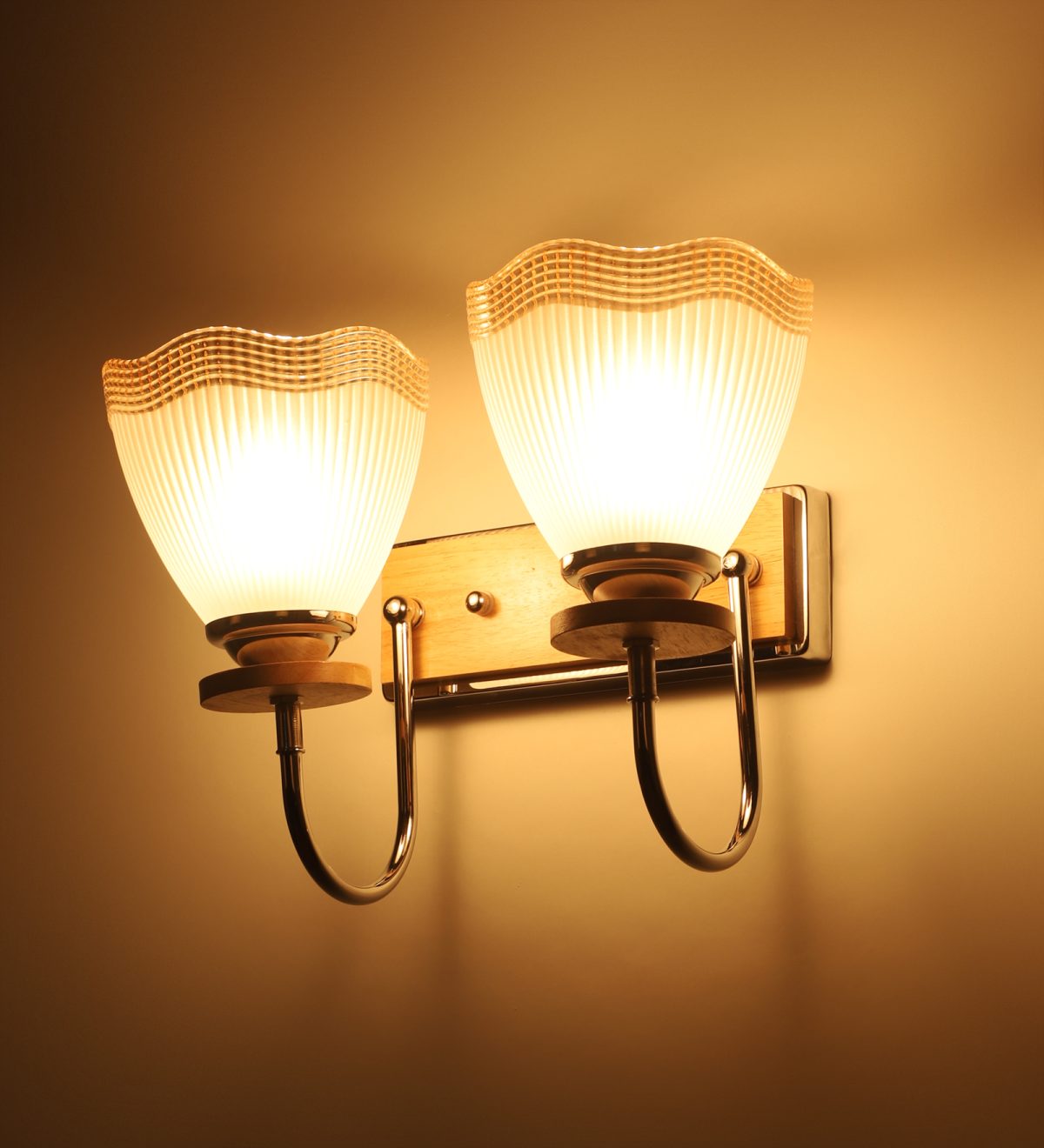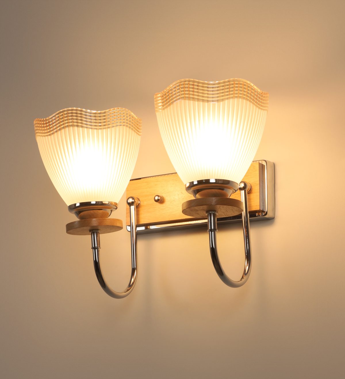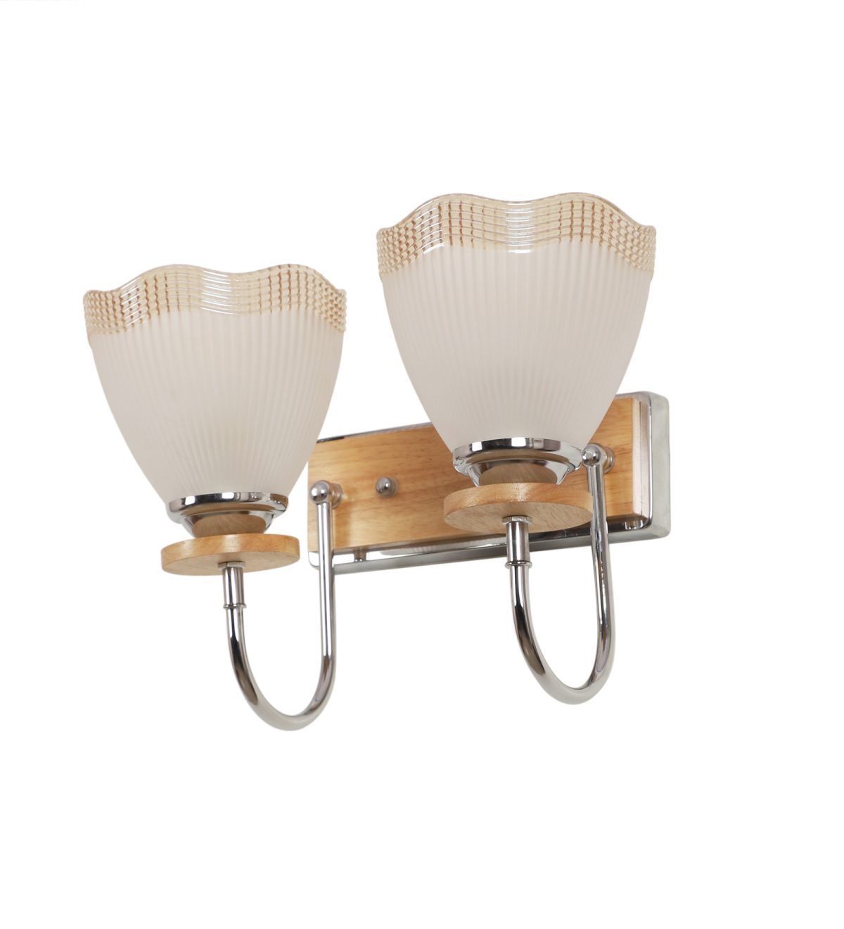 Modern light brown, silver (wood – chrome) finish double wall light made of wood and mild steel having taper frosted glasses with golden border. It is maintenance free, easy to remove glass and wash it, comes with an E27 holder, only the change of lamp is required, which is available locally everywhere. You can of course swap out the bulb for one that is dimmable, has a higher light output or a different color temperature. Application includes both residential and commercial premises wherever it matches with your interiors. Matching single wall light code – WL2369. Can be customized as per requirement in case of bulk quantities. Lamp not included.