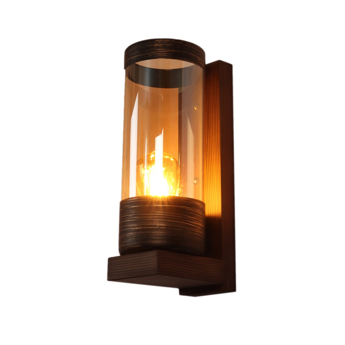 Modern dark brown (wood) finish single wall light made of wood, with a long cylinderical champaign coloured glass. It is maintenance free, easy to remove glass and wash it, comes with an E27 holder, only the change of lamp is required, which is available locally everywhere. You can of course swap out the bulb for one that is dimmable, has a higher light output or a different color temperature. Application includes both residential and commercial premises wherever it matches with your interiors. Looks amazing with LED filament lamp. Lamp not included.