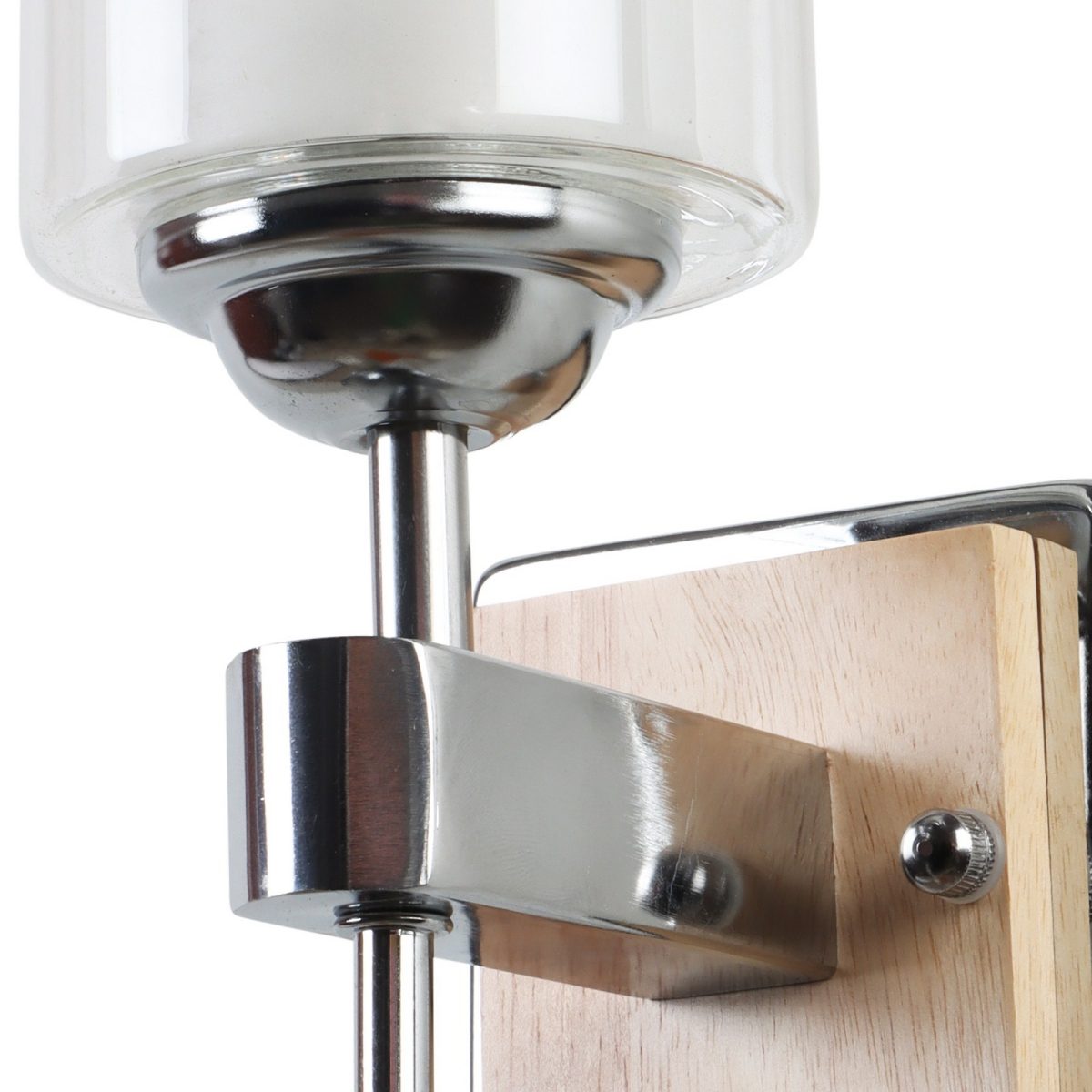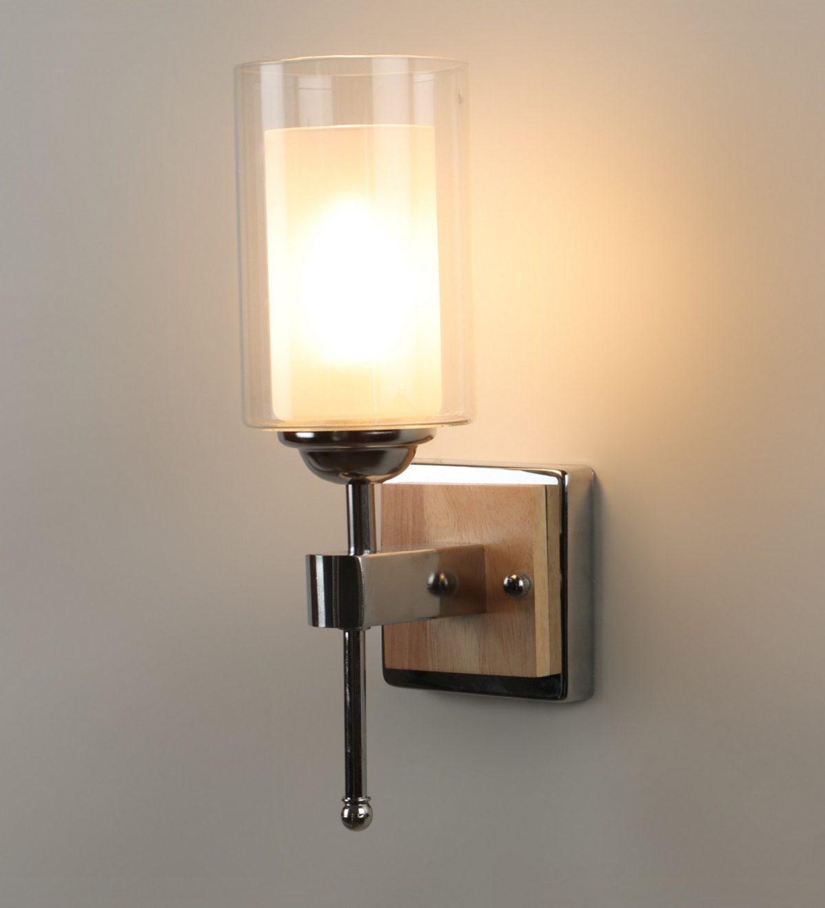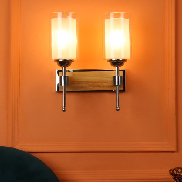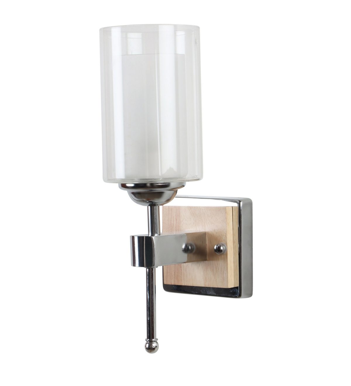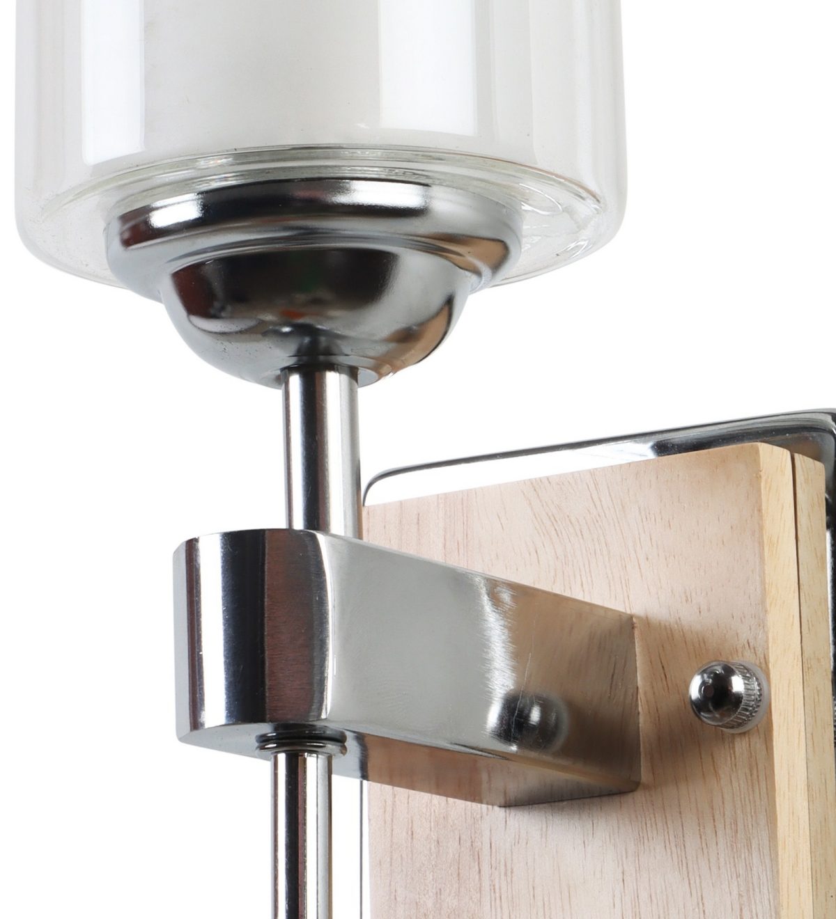 Modern light brown, silver (wood – chrome) finish single wall light made of wood and mild steel, with a cylinderical long white two layered glass. It is maintenance free, easy to remove glass and wash it, comes with an E27 holder, only the change of lamp is required, which is available locally everywhere. You can of course swap out the bulb for one that is dimmable, has a higher light output or a different color temperature. Application includes both residential and commercial premises wherever it matches with your interiors. Matching double wall light code – WL2702. Can be customized as per requirement in case of bulk quantities. LAMP NOT INCLUDED.
