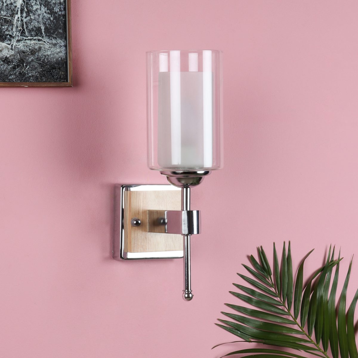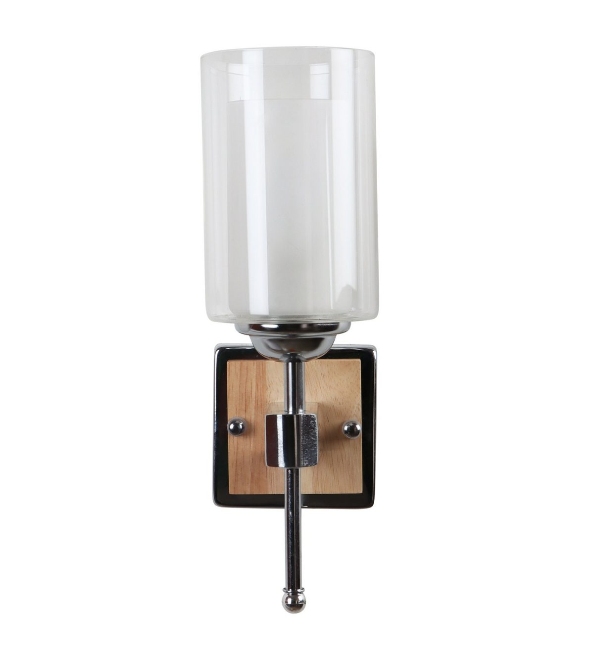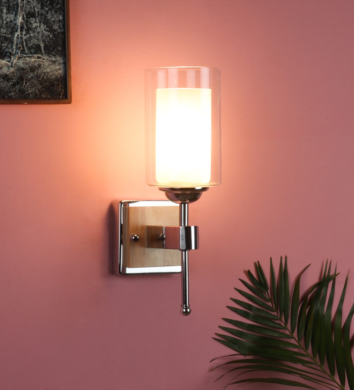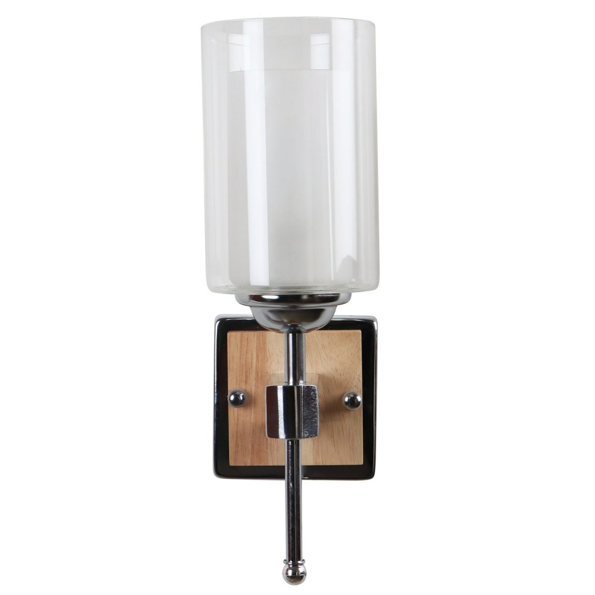 Modern light brown, silver (wood – chrome) finish single wall light made of wood and mild steel, with a cylinderical long white two layered glass. It is maintenance free, easy to remove glass and wash it, comes with an E27 holder, only the change of lamp is required, which is available locally everywhere. You can of course swap out the bulb for one that is dimmable, has a higher light output or a different color temperature. Application includes both residential and commercial premises wherever it matches with your interiors. Matching double wall light code – WL2702. Can be customized as per requirement in case of bulk quantities. LAMP NOT INCLUDED.