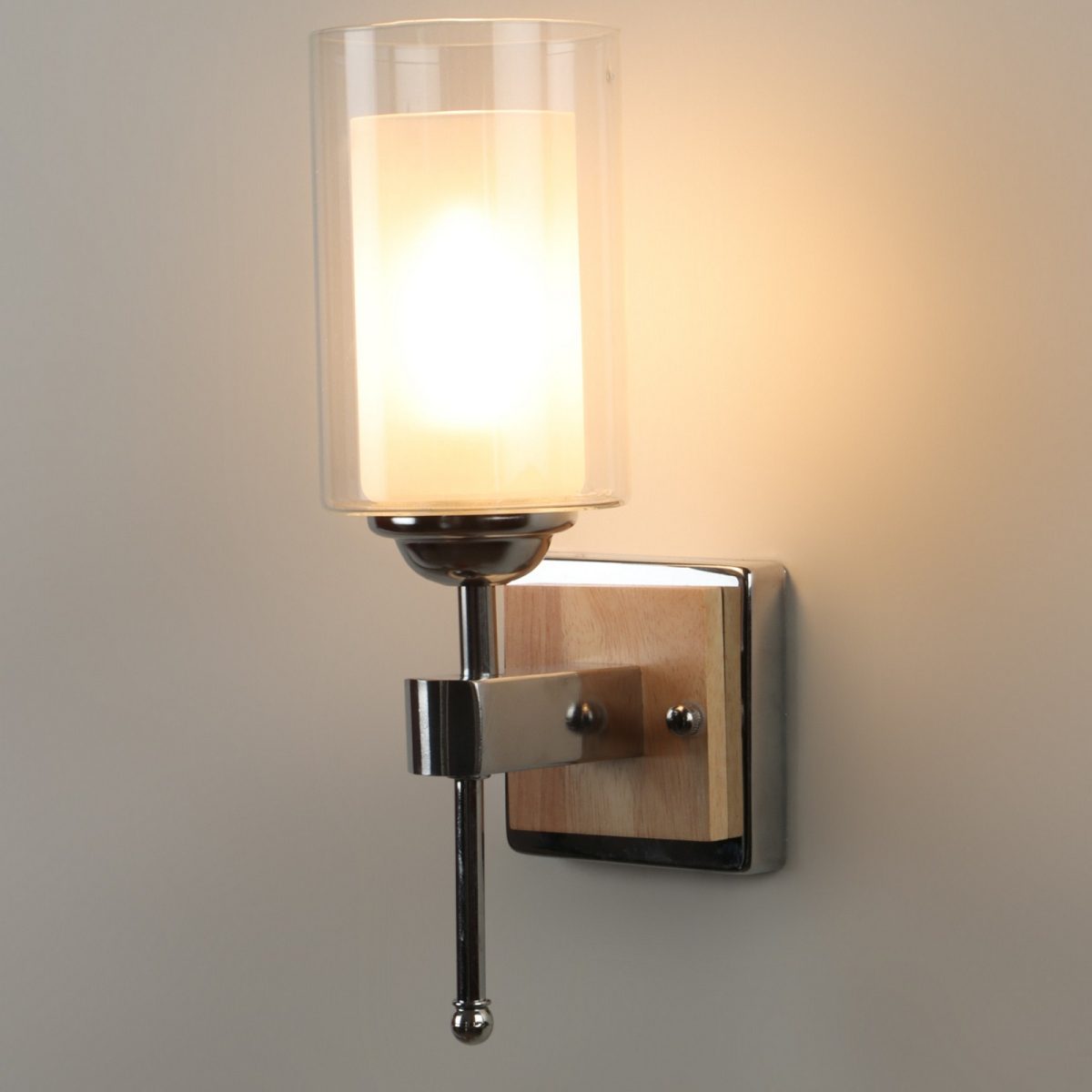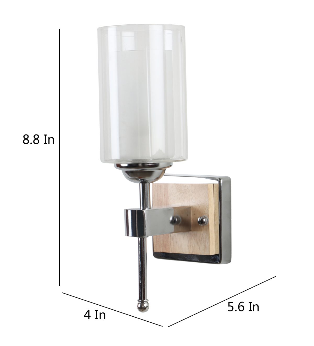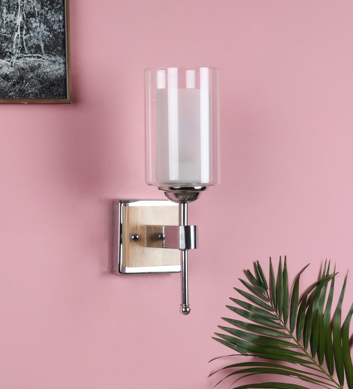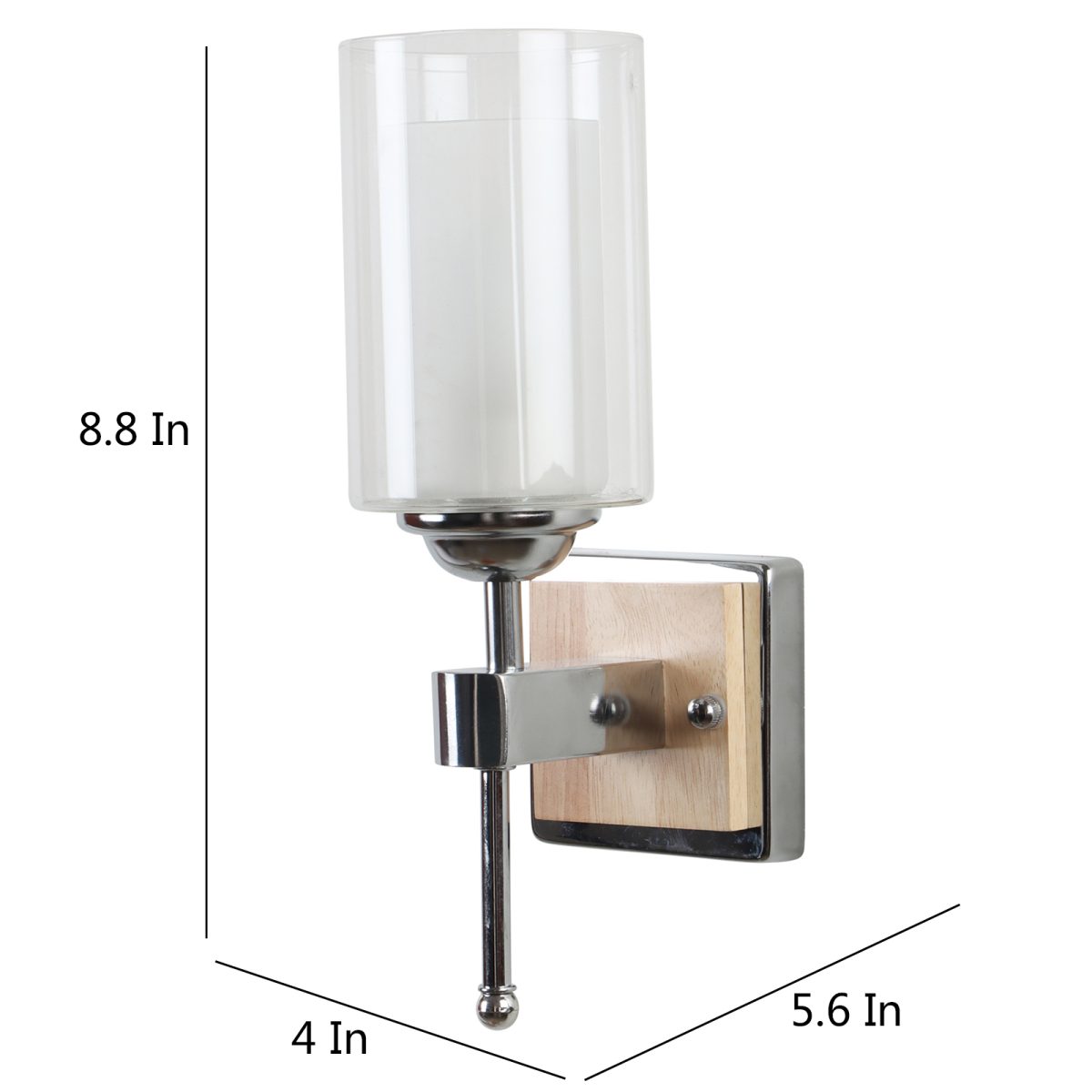 Modern light brown, silver (wood – chrome) finish single wall light made of wood and mild steel, with a cylinderical long white two layered glass. It is maintenance free, easy to remove glass and wash it, comes with an E27 holder, only the change of lamp is required, which is available locally everywhere. You can of course swap out the bulb for one that is dimmable, has a higher light output or a different color temperature. Application includes both residential and commercial premises wherever it matches with your interiors. Matching double wall light code – WL2702. Can be customized as per requirement in case of bulk quantities. LAMP NOT INCLUDED.
