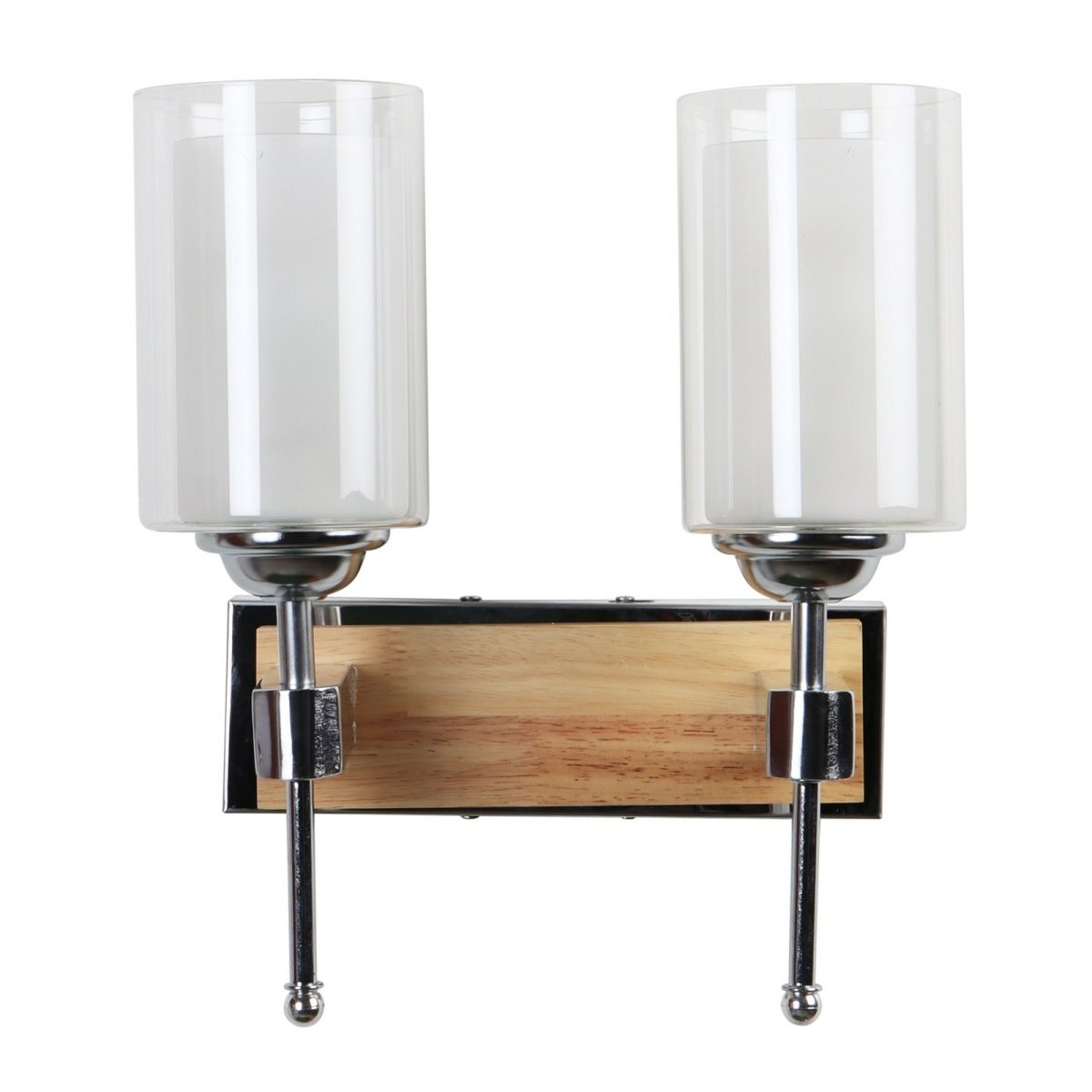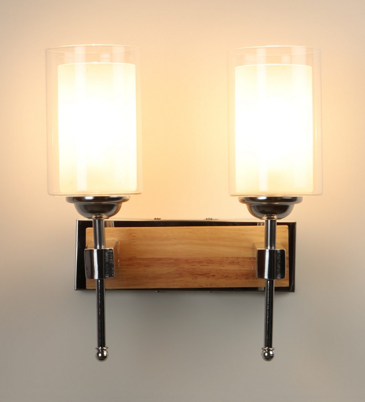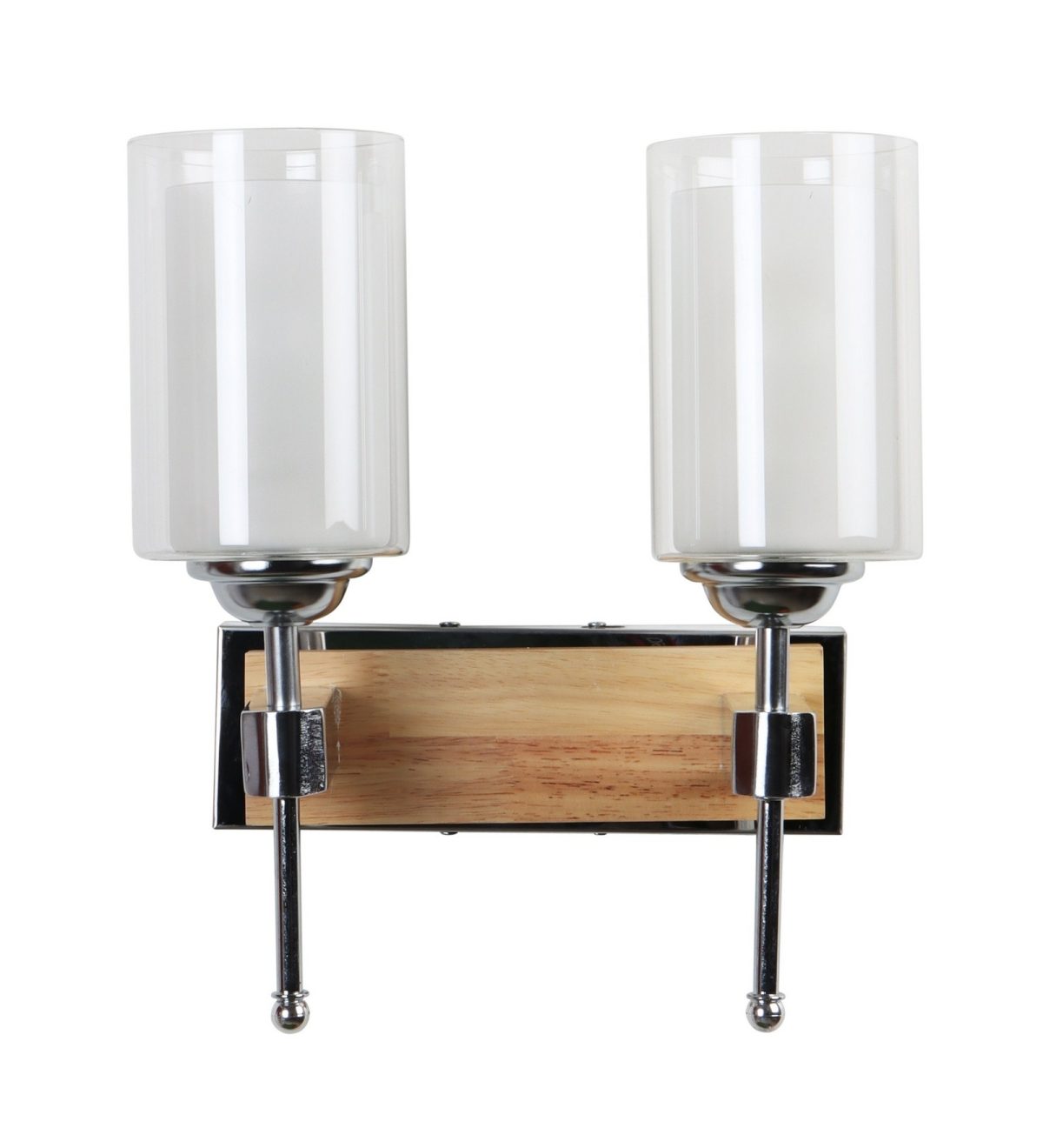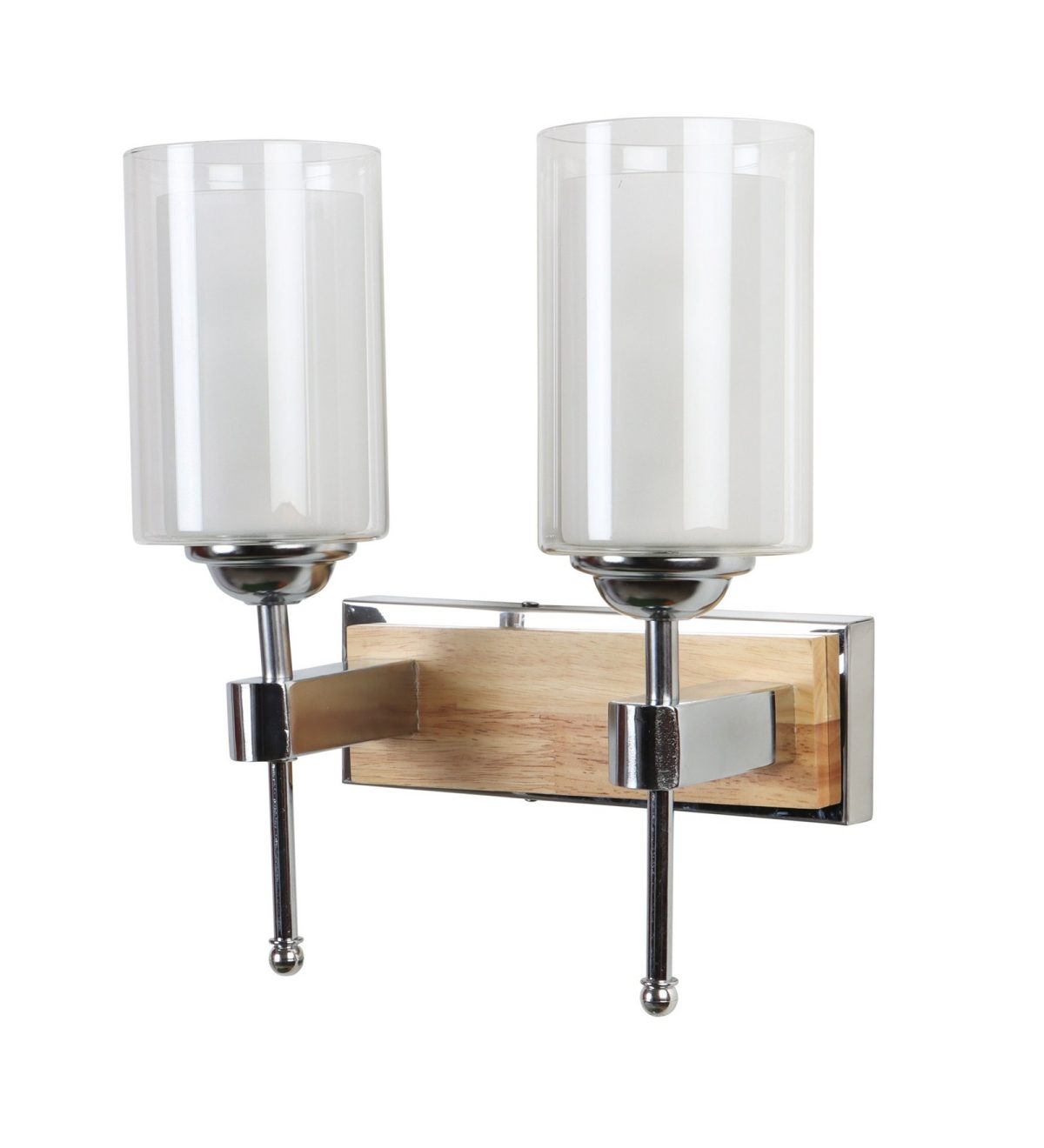 Modern light brown, silver (wood – chrome) finish double wall light made of wood and mild steel, with a cylinderical long white two layered glass. It is maintenance free, easy to remove glass and wash it, comes with an E27 holder, only the change of lamp is required, which is available locally everywhere. You can of course swap out the bulb for one that is dimmable, has a higher light output or a different color temperature. Application includes both residential and commercial premises wherever it matches with your interiors. Matching single wall light code – WL2701. Can be customized as per requirement in case of bulk quantities. LAMP NOT INCLUDED.