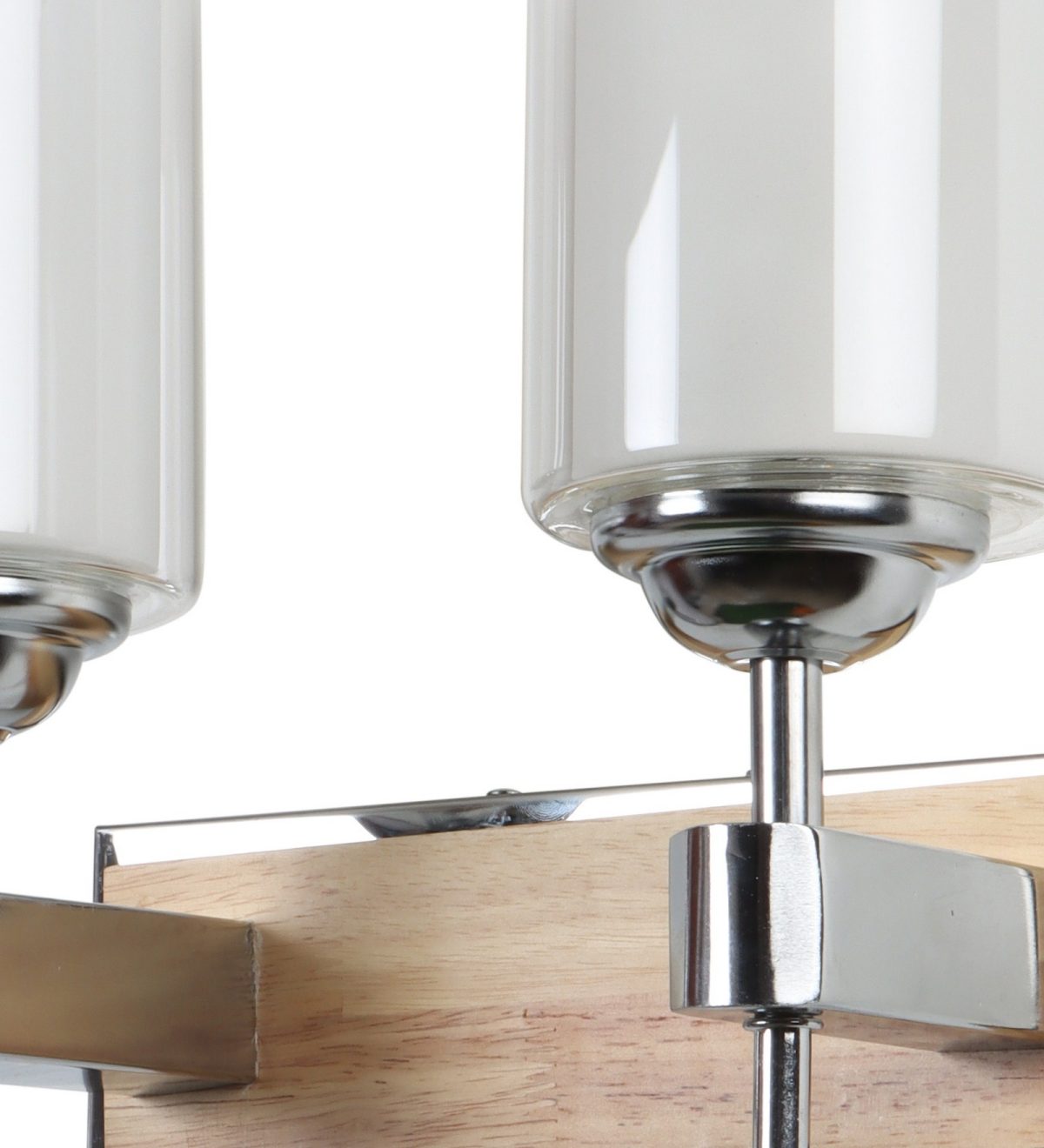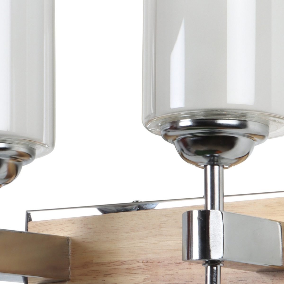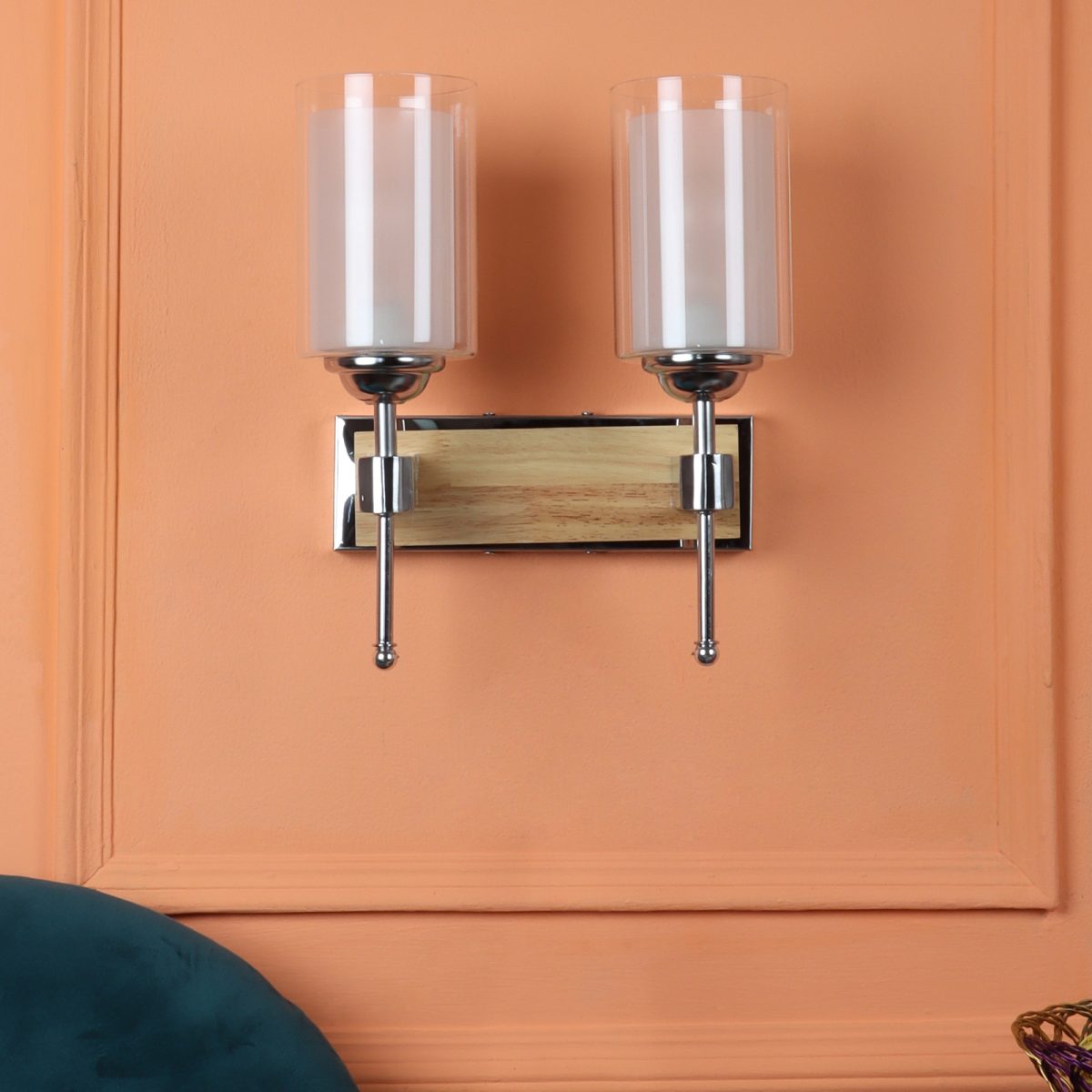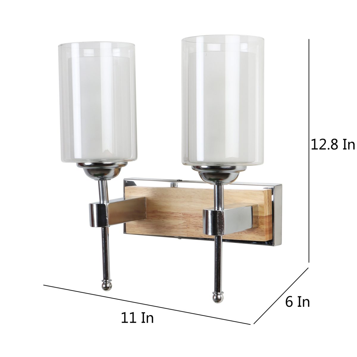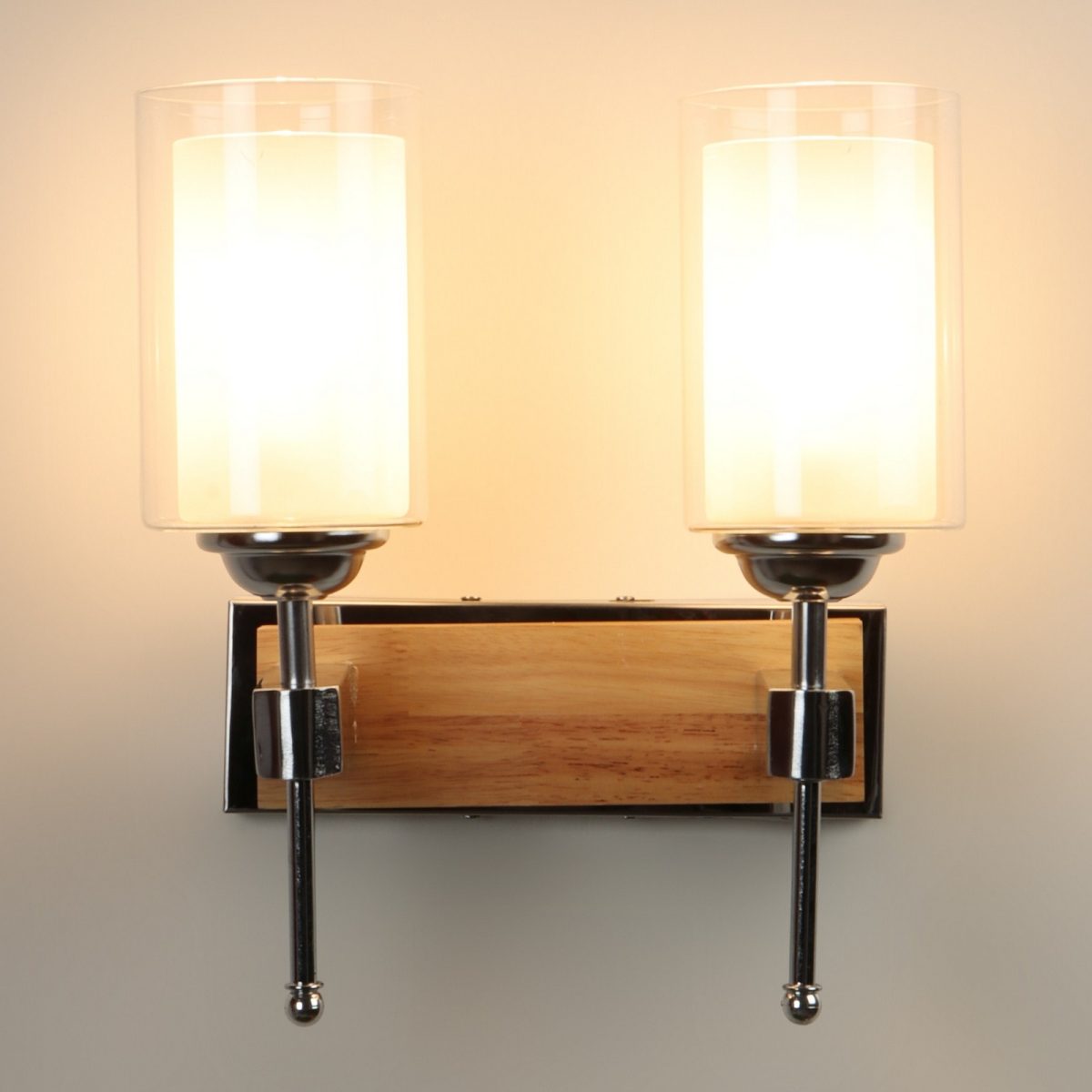 Modern light brown, silver (wood – chrome) finish double wall light made of wood and mild steel, with a cylinderical long white two layered glass. It is maintenance free, easy to remove glass and wash it, comes with an E27 holder, only the change of lamp is required, which is available locally everywhere. You can of course swap out the bulb for one that is dimmable, has a higher light output or a different color temperature. Application includes both residential and commercial premises wherever it matches with your interiors. Matching single wall light code – WL2701. Can be customized as per requirement in case of bulk quantities. LAMP NOT INCLUDED.