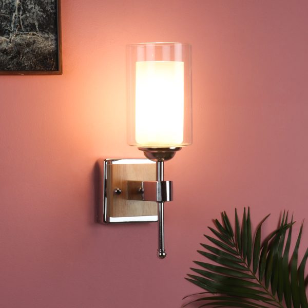 Modern light brown, silver (wood – chrome) finish double wall light made of wood and mild steel, with a cylinderical long white two layered glass. It is maintenance free, easy to remove glass and wash it, comes with an E27 holder, only the change of lamp is required, which is available locally everywhere. You can of course swap out the bulb for one that is dimmable, has a higher light output or a different color temperature. Application includes both residential and commercial premises wherever it matches with your interiors. Matching single wall light code – WL2701. Can be customized as per requirement in case of bulk quantities. LAMP NOT INCLUDED.