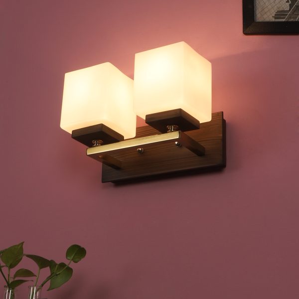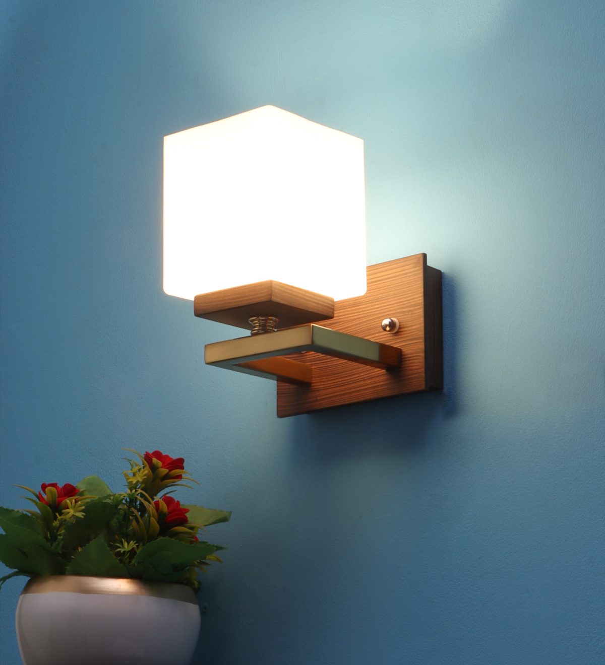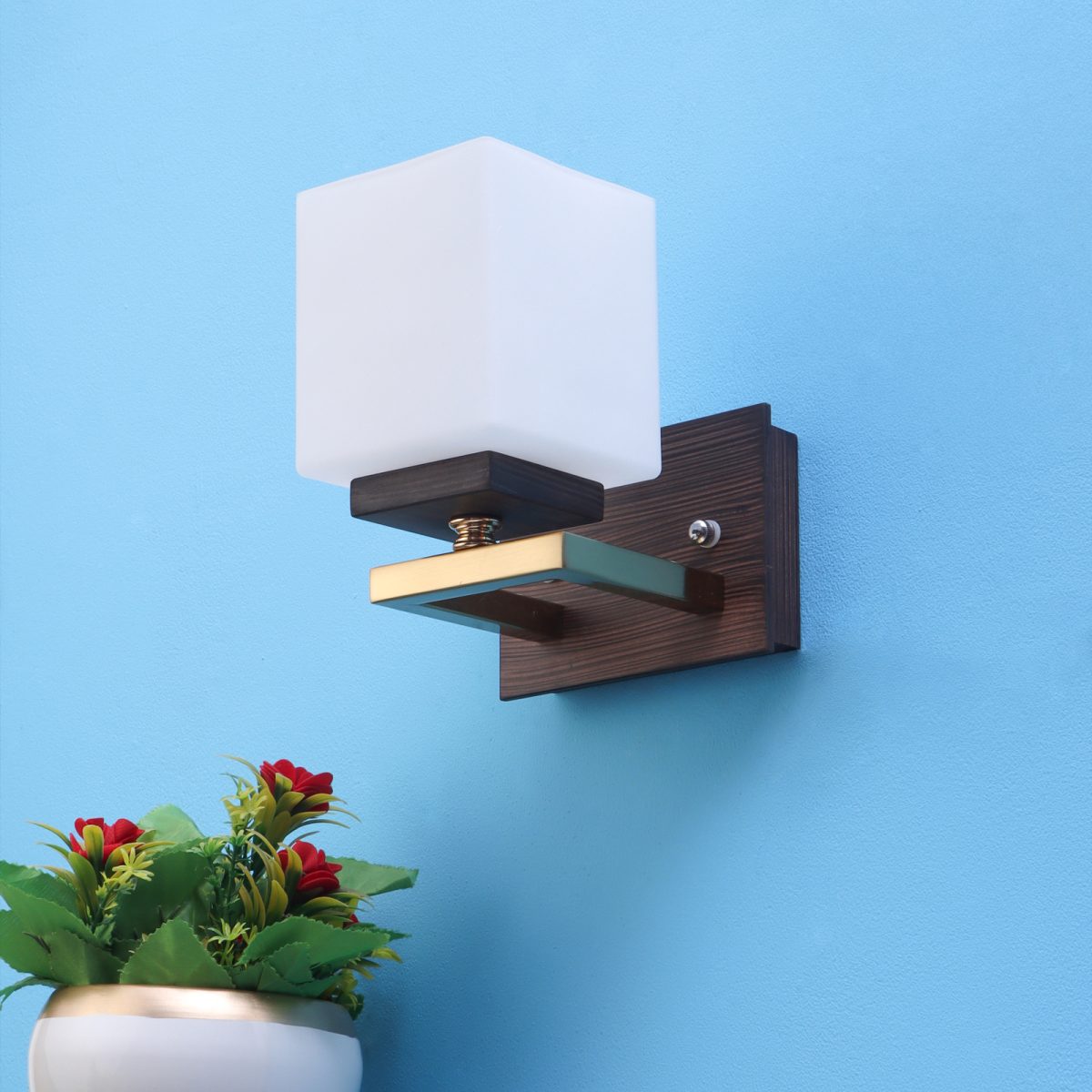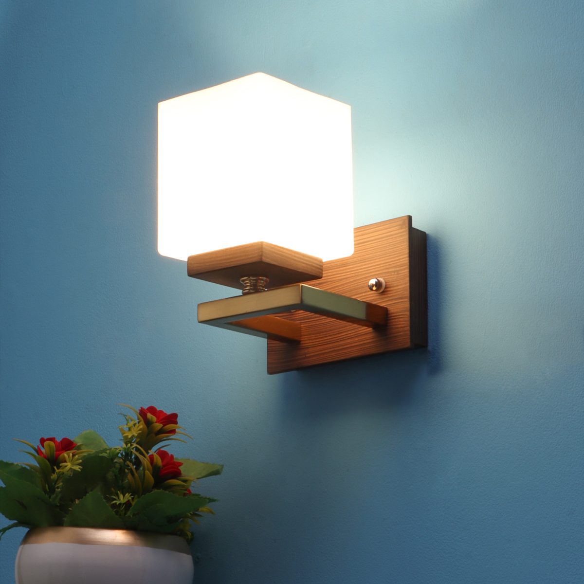 Modern dark brown (wood) finish single wall light made of wood, with a square cubical white glass. It is maintenance free, easy to remove glass and wash it, comes with an E27 holder, only the change of lamp is required, which is available locally everywhere. You can of course swap out the bulb for one that is dimmable, has a higher light output or a different color temperature. Application includes both residential and commercial premises wherever it matches with your interiors. Can be customized as per requirement. LAMPS NOT INCLUDED.