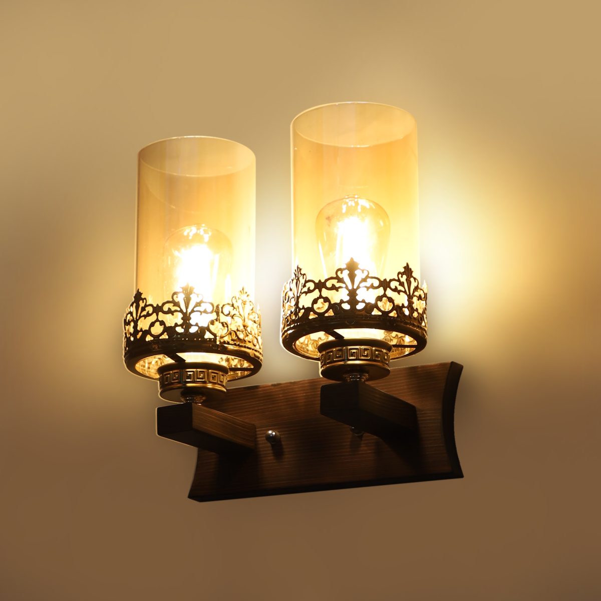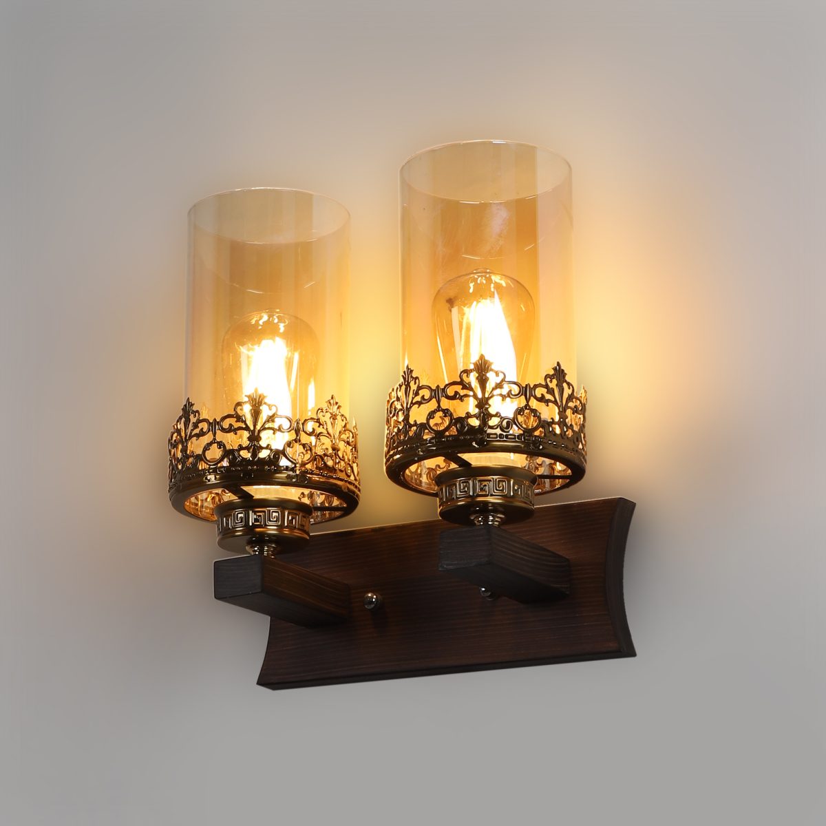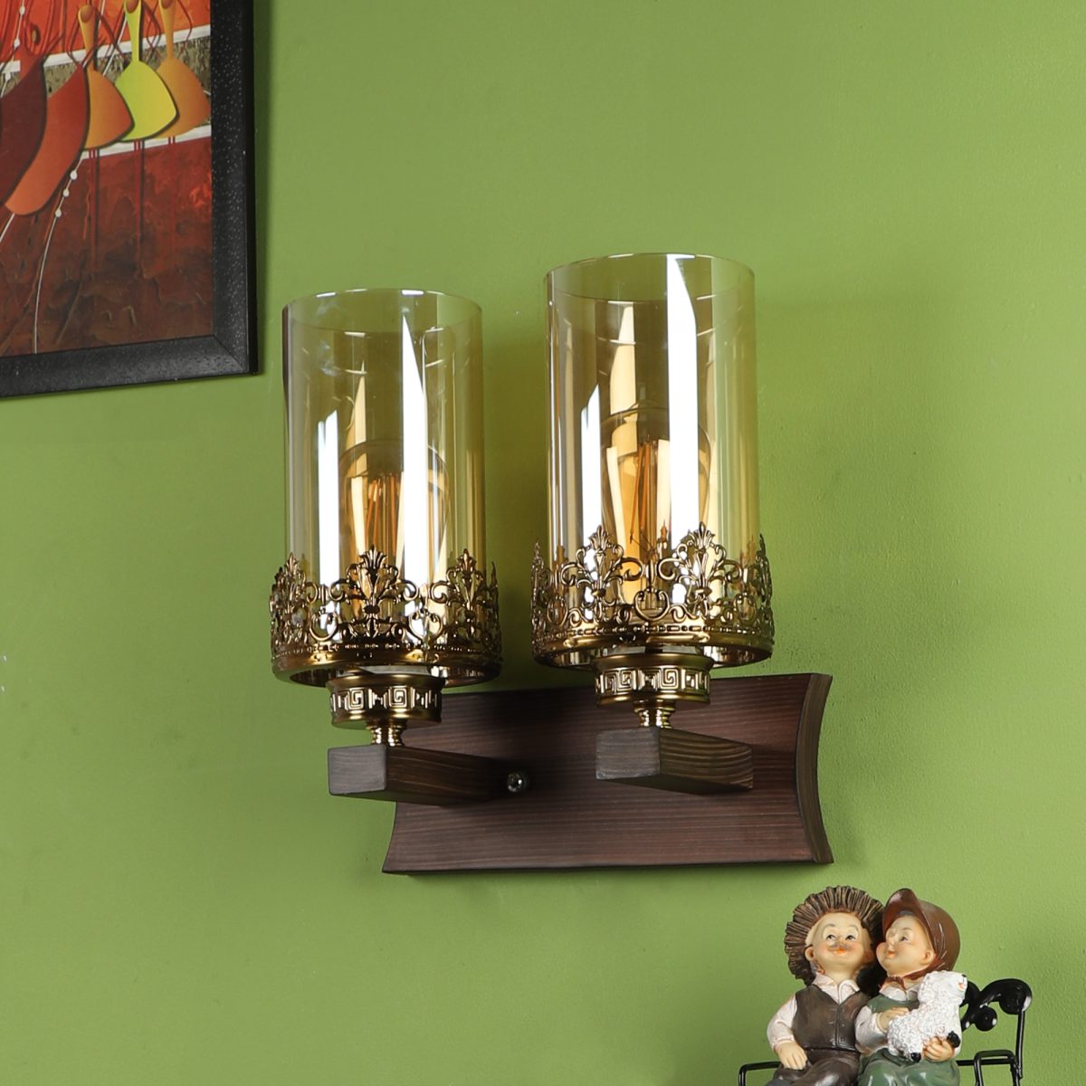 Dark brown finish double wall light having cylinderical champaign coloured glass mounted on a designer frame made of wood and mild steel.. It is maintenance free. It is easy to remove glass and wash it. Comes with an E27 holder, only the change of lamp is required, which is available locally everywhere. Looks amazing with LED filament lamp. Application includes both residential and commercial premises wherever it matches with your interiors. Can be customized as per requirement, LAMP NOT INCLUDED.