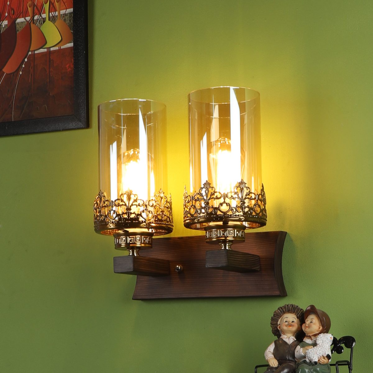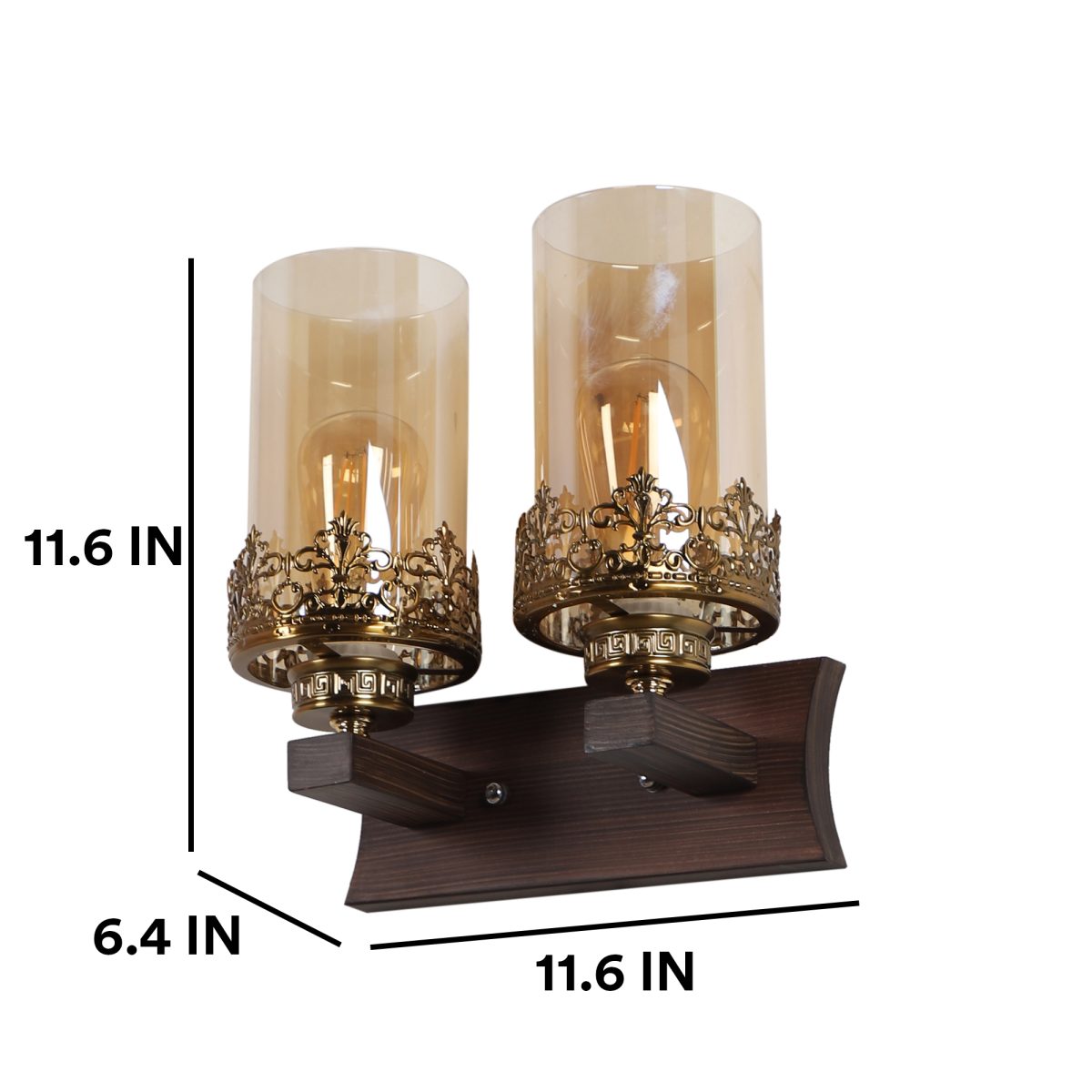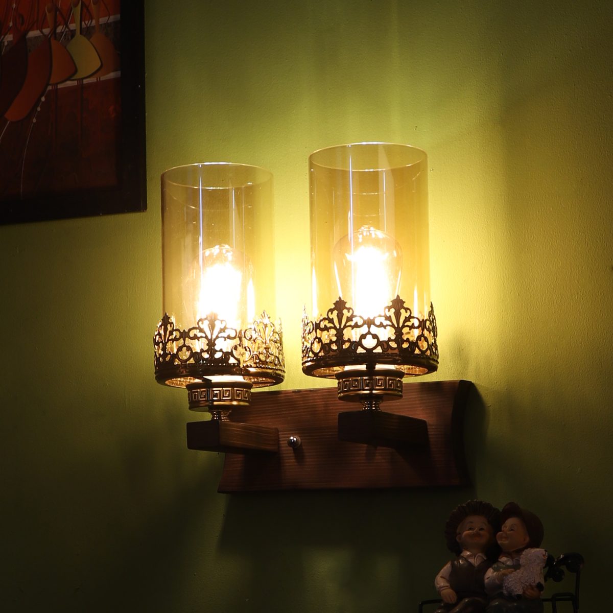 Dark brown finish double wall light having cylinderical champaign coloured glass mounted on a designer frame made of wood and mild steel.. It is maintenance free. It is easy to remove glass and wash it. Comes with an E27 holder, only the change of lamp is required, which is available locally everywhere. Looks amazing with LED filament lamp. Application includes both residential and commercial premises wherever it matches with your interiors. Can be customized as per requirement, LAMP NOT INCLUDED.
