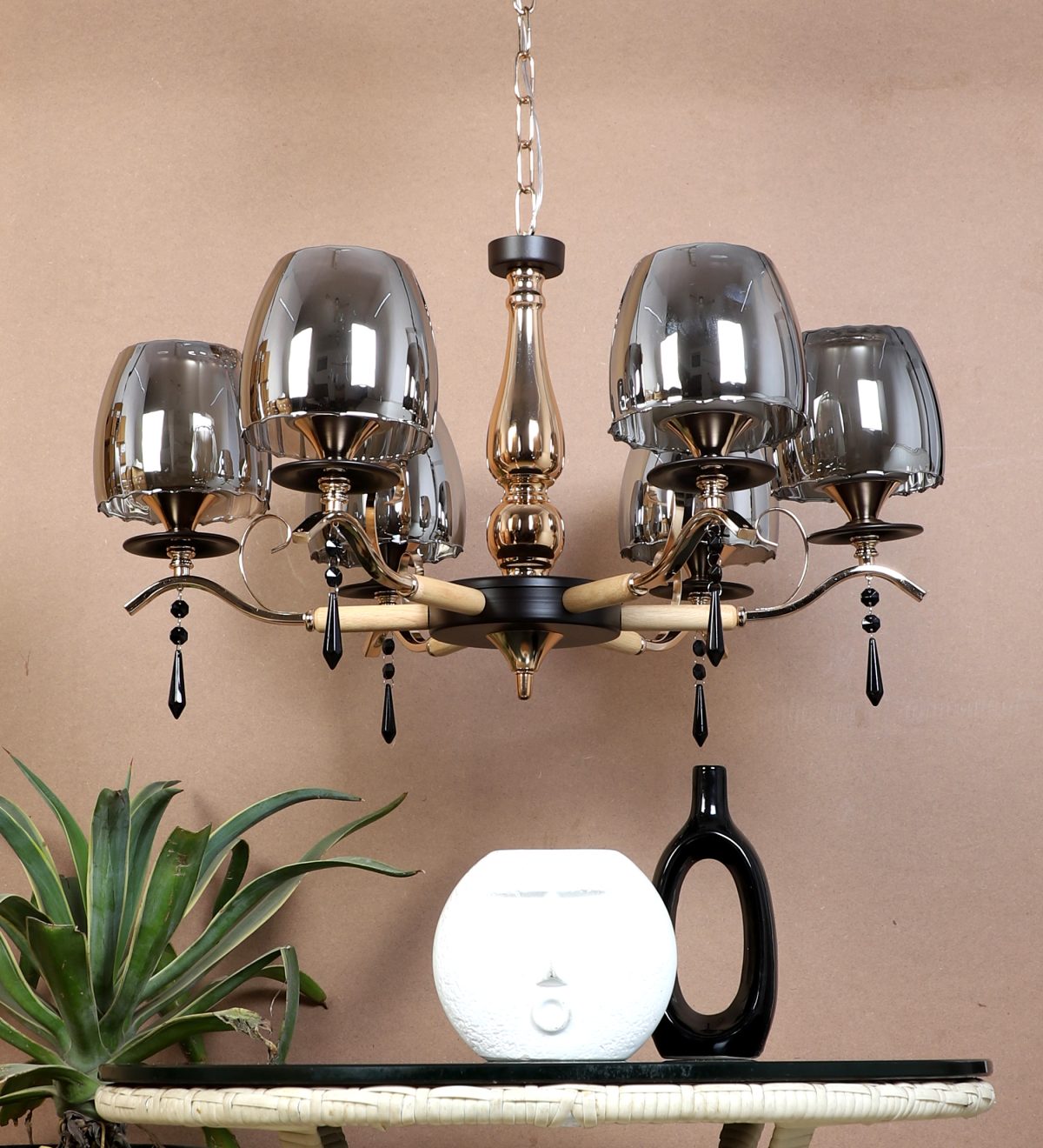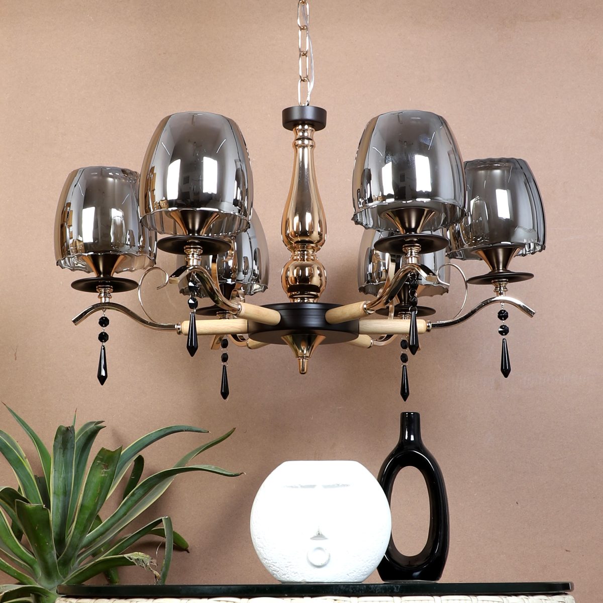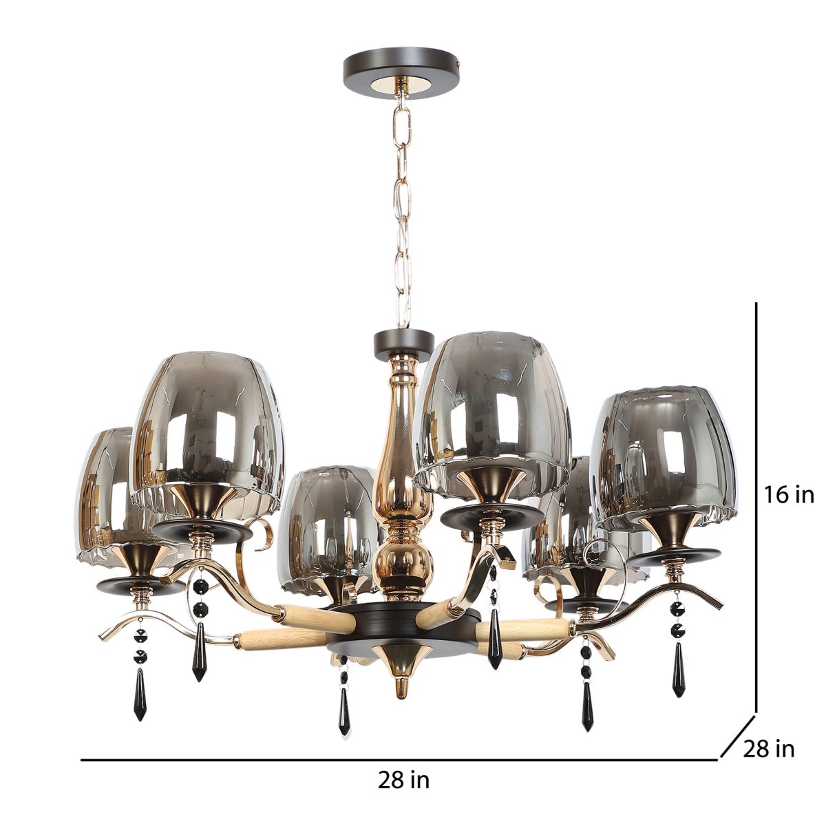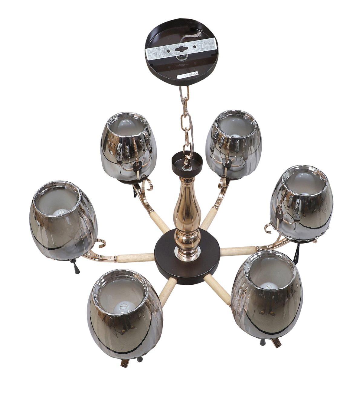 Gold and wood finish chandellier having six lights.The suspension can be adjusted at time of installation to the desired height. It is maintenance free, it is easy to remove glasses and wash them. Comes with an E27 holder.Can be customized as per requirement. Other sizes can be made as per requirement. LAMP NOT INCLUDED.