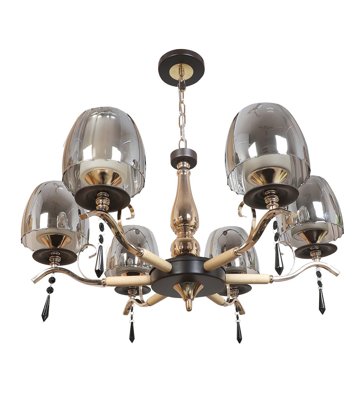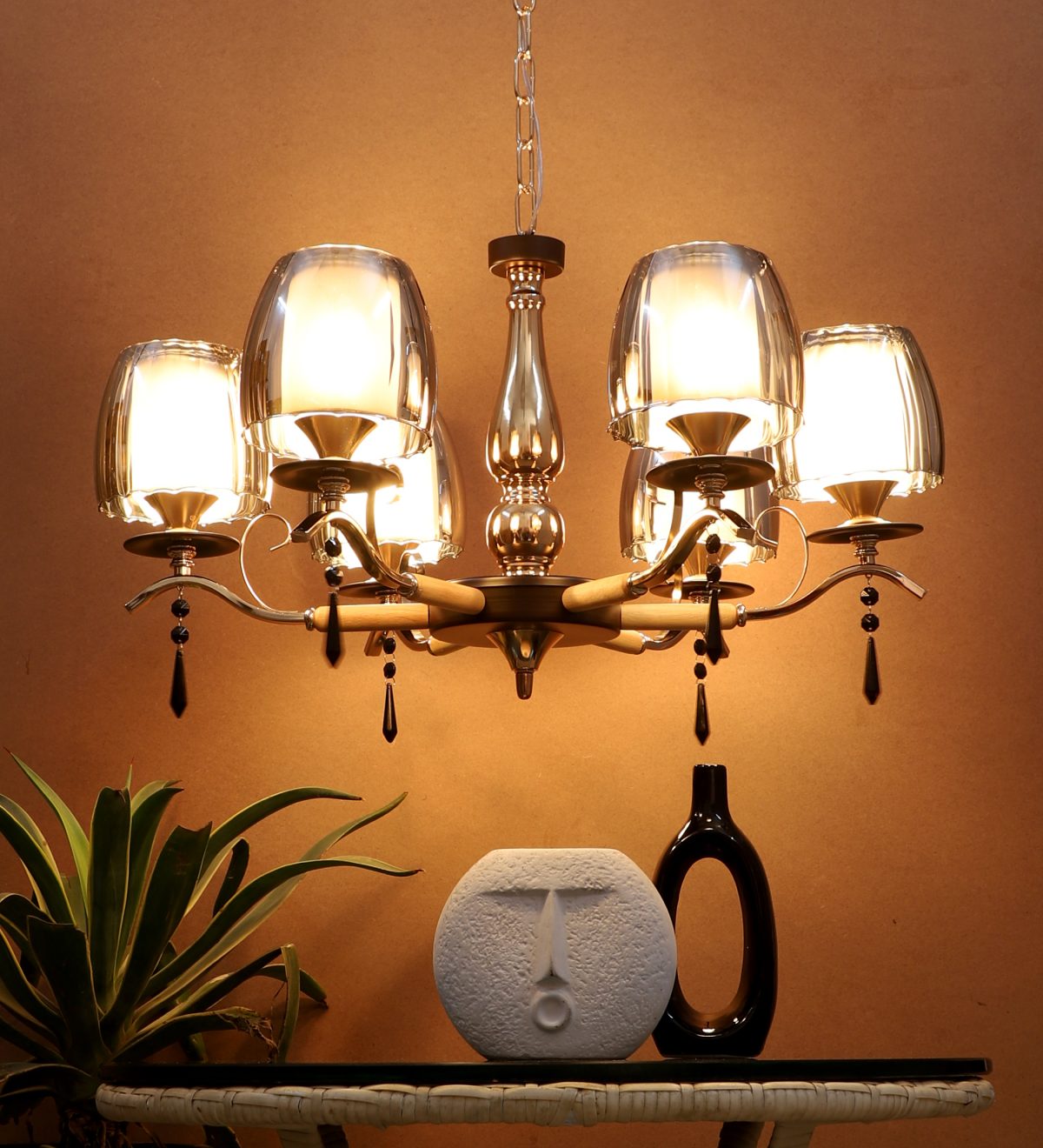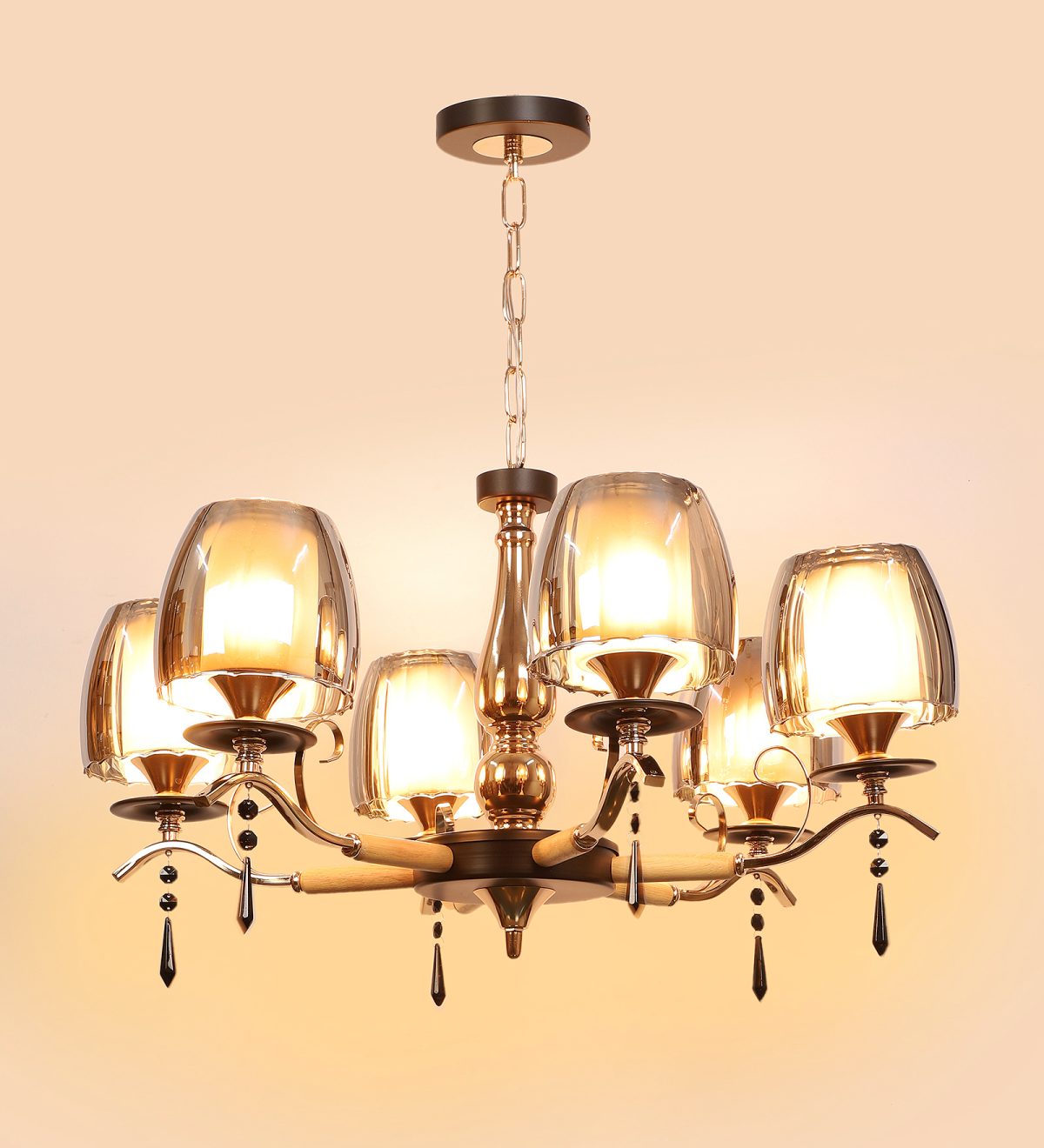 Gold and wood finish chandellier having six lights.The suspension can be adjusted at time of installation to the desired height. It is maintenance free, it is easy to remove glasses and wash them. Comes with an E27 holder.Can be customized as per requirement. Other sizes can be made as per requirement. LAMP NOT INCLUDED.