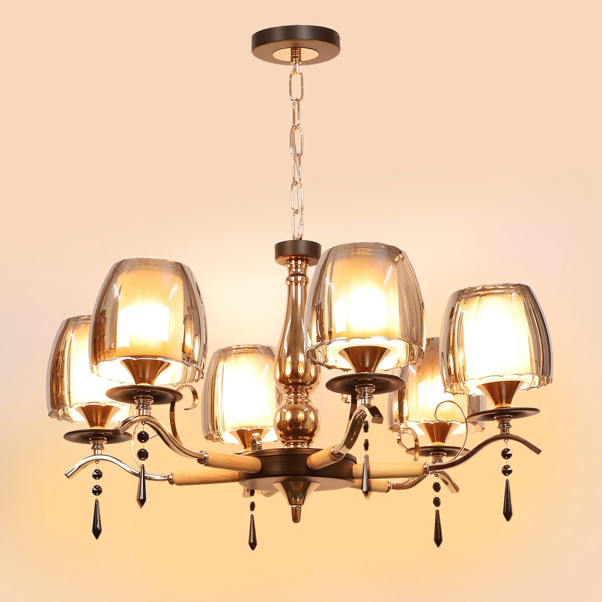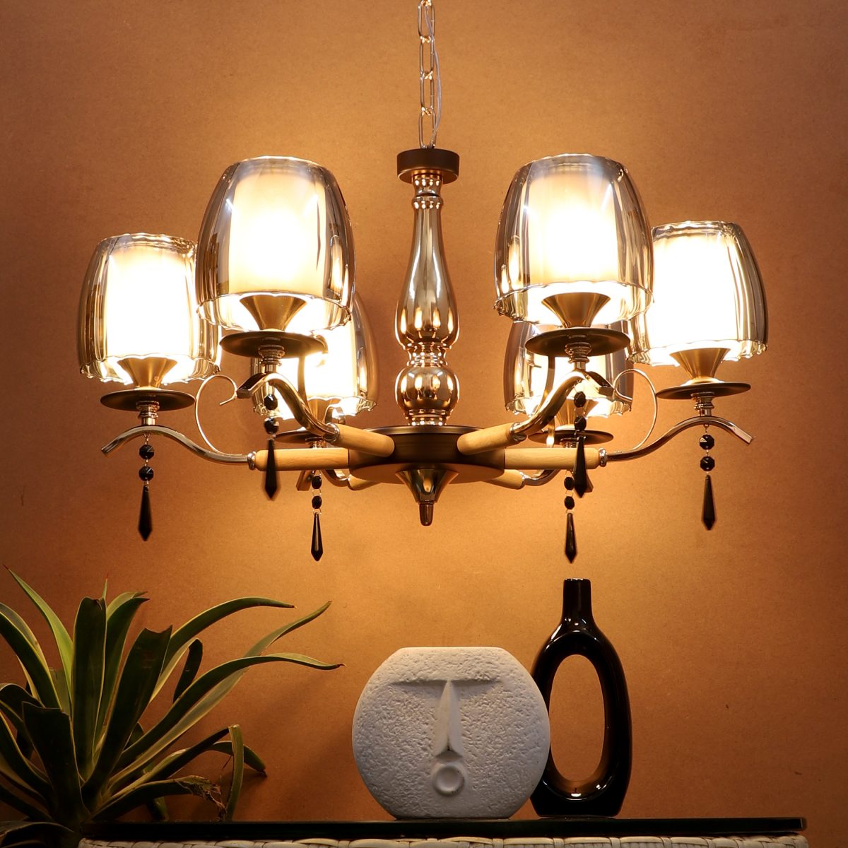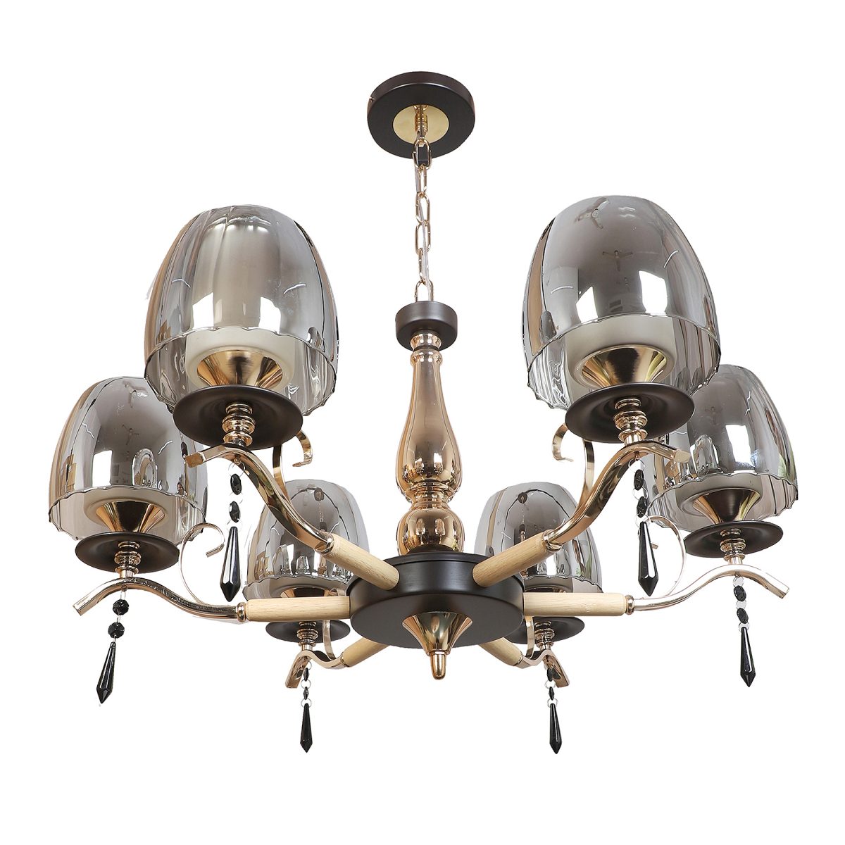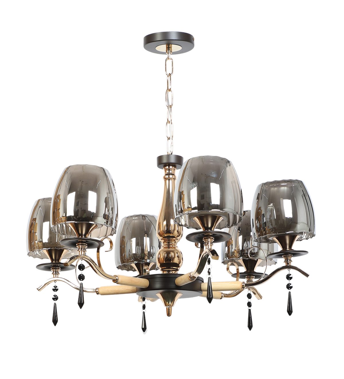 Gold and wood finish chandellier having six lights.The suspension can be adjusted at time of installation to the desired height. It is maintenance free, it is easy to remove glasses and wash them. Comes with an E27 holder.Can be customized as per requirement. Other sizes can be made as per requirement. LAMP NOT INCLUDED.