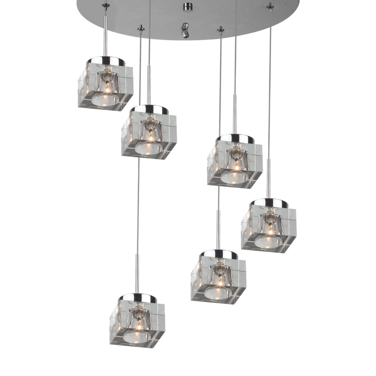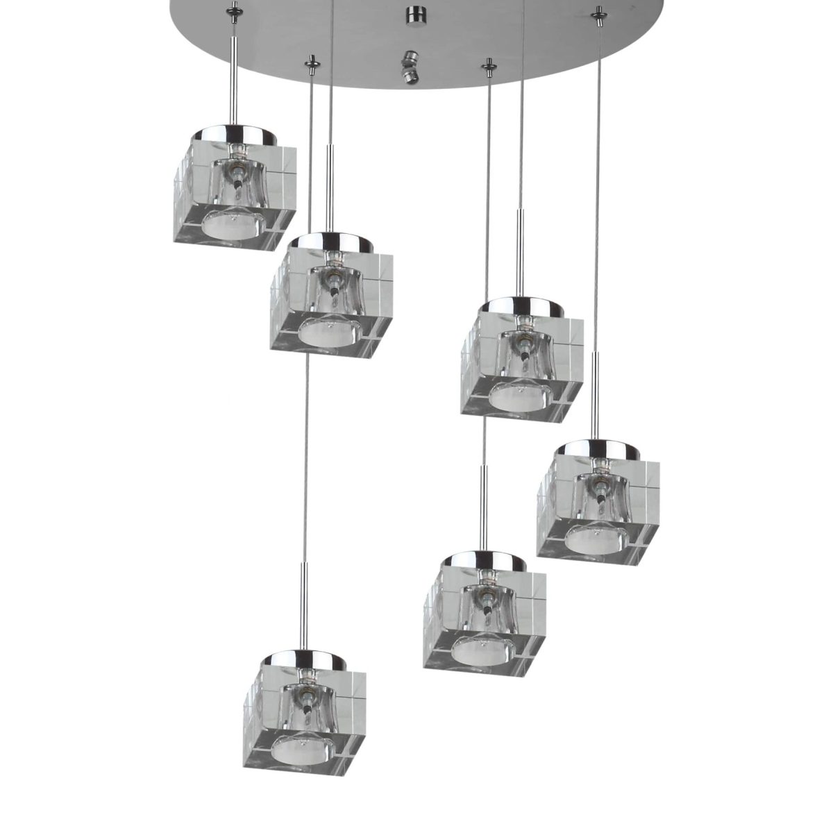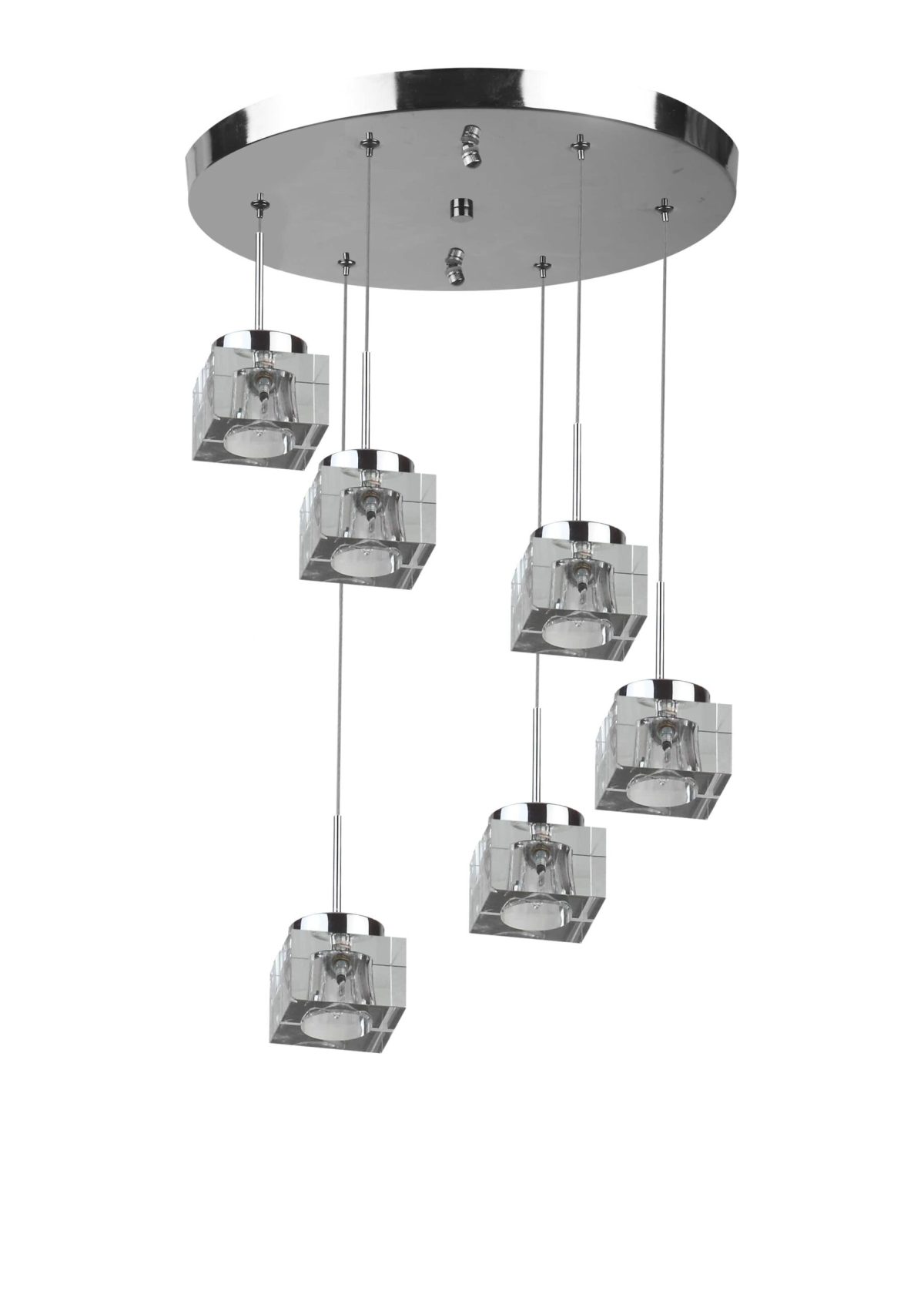 Ultra modern, premium, mild steel silver (chrome) finish, heavy crystal six glass hanging light. The suspension can be adjusted at time of installation to the desired height. Comes with an G4 holder and inbuilt transformer. Similar hanging variants with different number of lights – HL3939-10. Matching variants in wall light codes – ML304-1, ML304-2, ML304-3. Matching variants in ceiling light – CL440, CL445, CH381, CH382. LAMP INCLUDED.