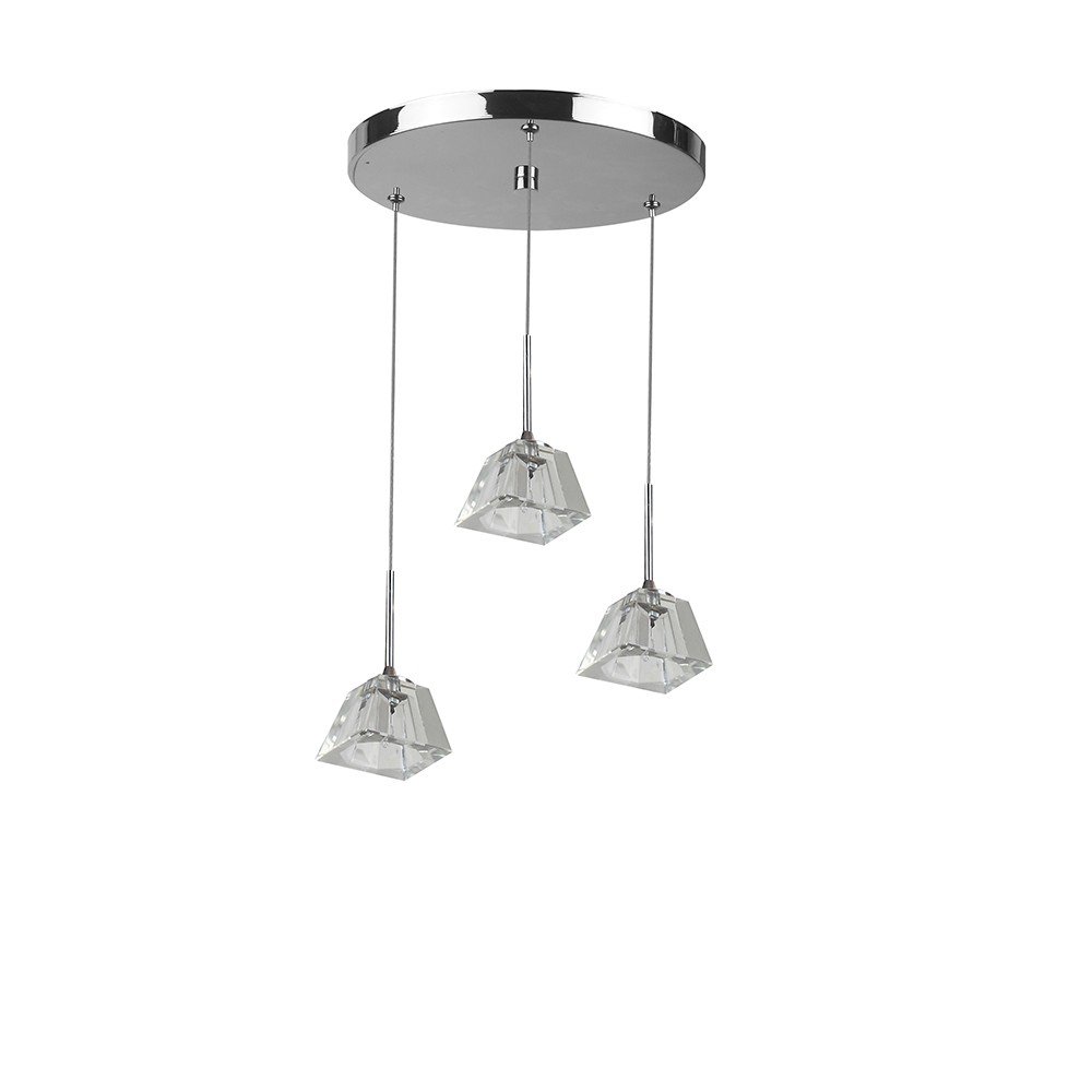 Ultra modern, premium, mild steel silver (chrome) finish, heavy crystal three glass hanging light. The suspension can be adjusted at time of installation to the desired height. Comes with an G4 holder and inbuilt transformer. Similar hanging variants with different number of lights – HL3981-10, HL3981-6. Matching variants in wall light codes – ML315-1, ML315-2, ML315-3. Matching variants in ceiling light – CL444, CH379. LAMP INCLUDED.