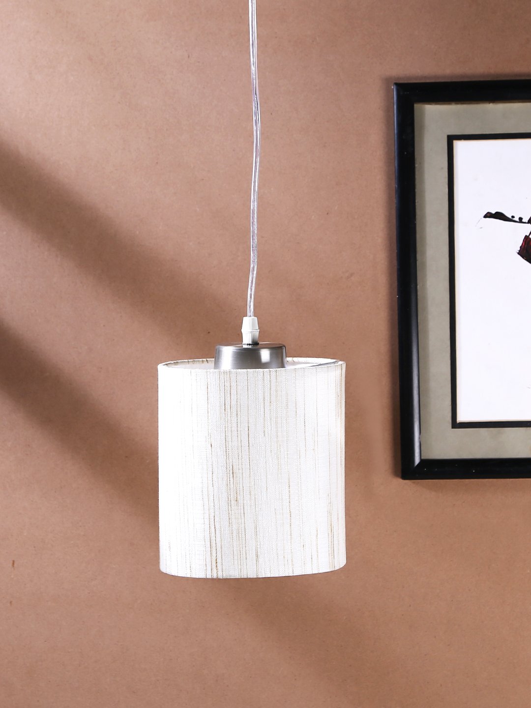 Off white single hanging light with oval long fabric shade and mild steel attachment in silver (satin nickel) finish. The suspension can be adjusted at time of installation to the desired height. It is maintenance free, comes with an e27 holder, only the change of lamp is required, which is available locally everywhere. Application includes both residential and commercial premises wherever it matches with your interiors. Other variations with different color – hl3732, hl3734. Can be customized as per requirement in case of bulk quantities. Lamp not included.