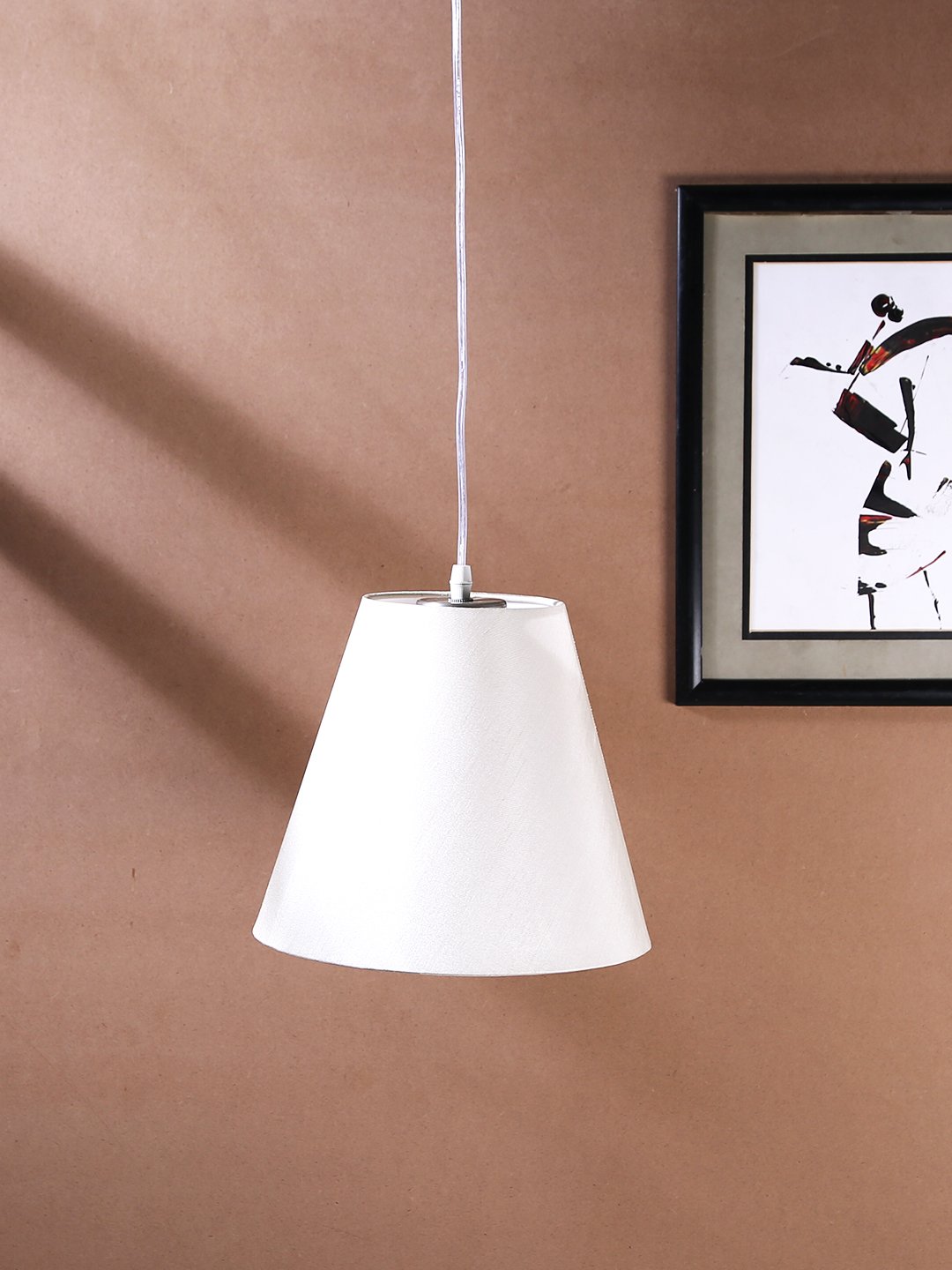 Cream (off-white) hanging light with big conical fabric shade and mild steel attachment in Silver (satin nickel) finish. The suspension can be adjusted at time of installation to the desired height. It is maintenance free, comes with an E27 holder, only the change of lamp is required, which is available locally everywhere. Application includes both residential and commercial premises wherever it matches with your interiors. Also available in dark brown (coffee) color with code HL3749. Can be customized as per requirement in case of bulk quantities. Lamp not included.