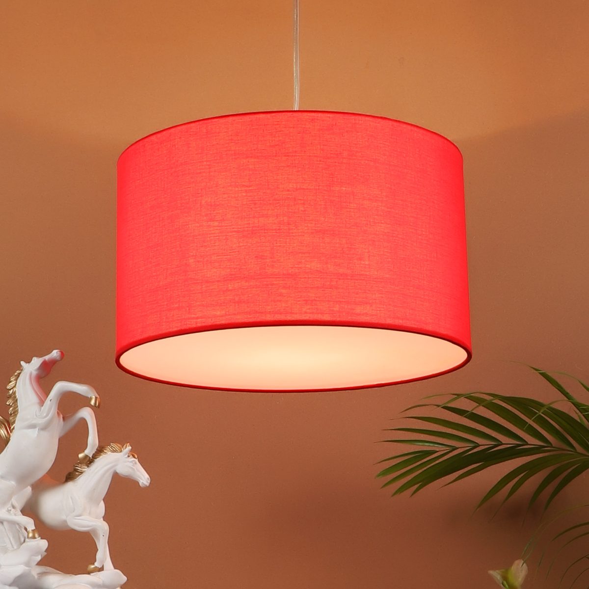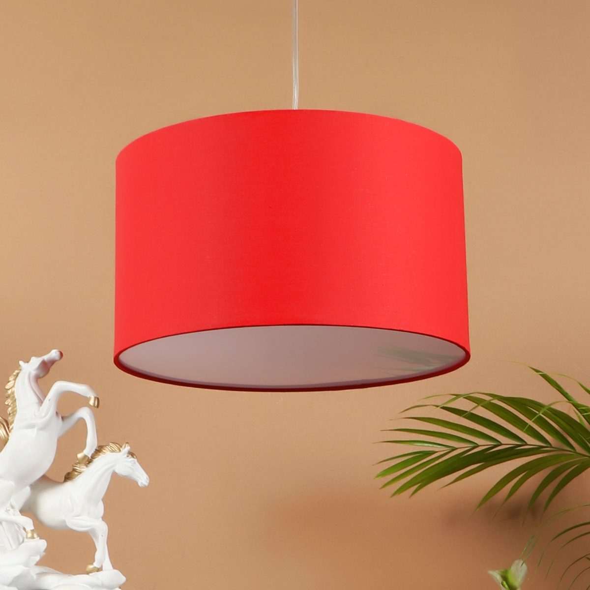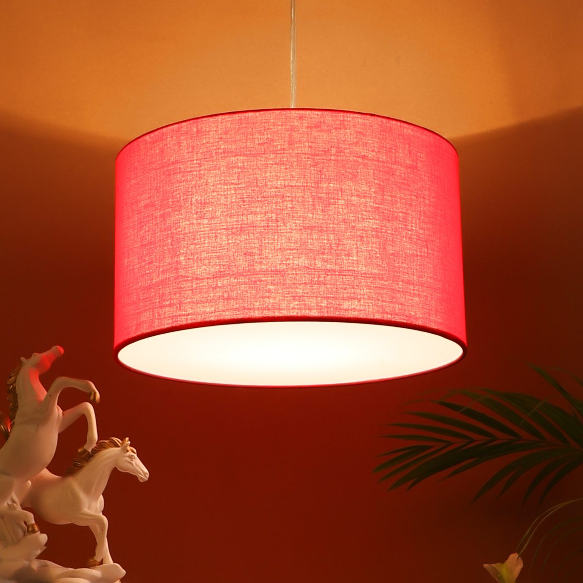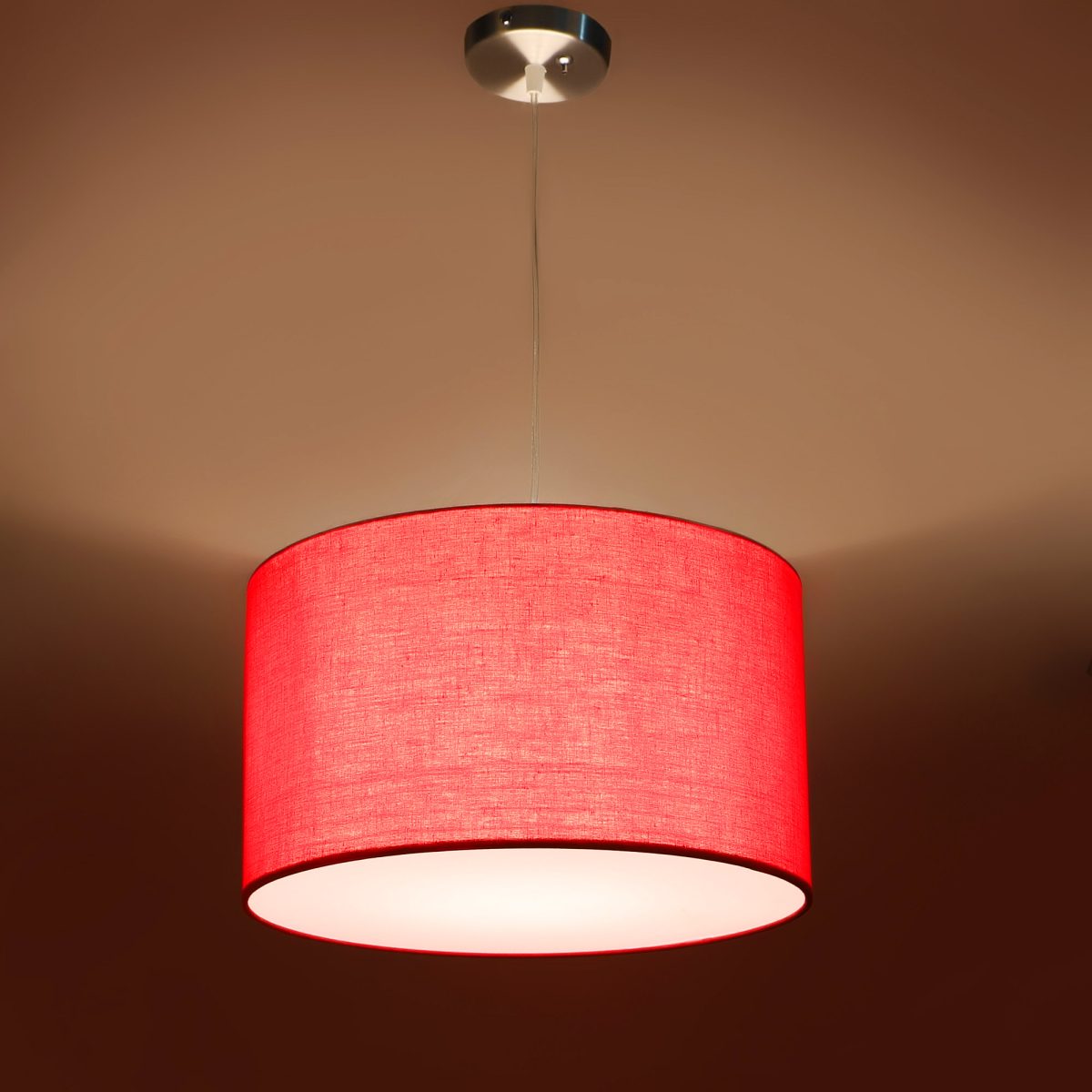 Red hanging light with big round fabric shade covered from bottom and mild steel attachment in Silver (satin nickel) finish. The suspension can be adjusted at time of installation to the desired height. It is maintenance free, comes with an E27 holder, only the change of lamp is required, which is available locally everywhere. Application includes both residential and commercial premises wherever it matches with your interiors. Other variations with different color -HL4039, HL4041. Can be customized as per requirement in case of bulk quantities. Lamp not included.
