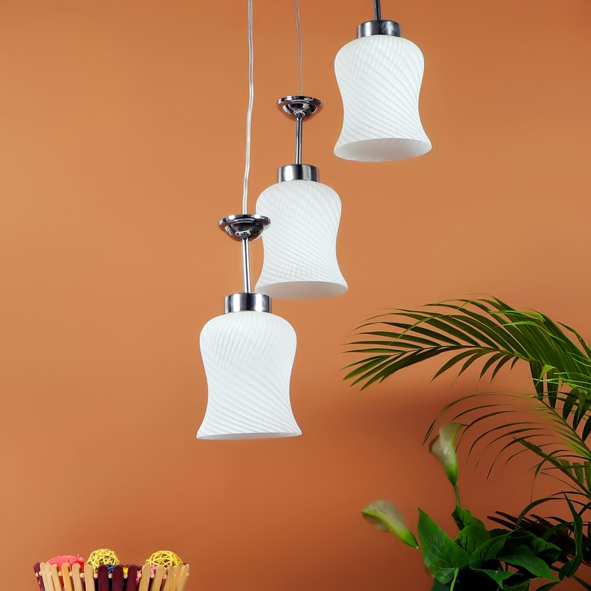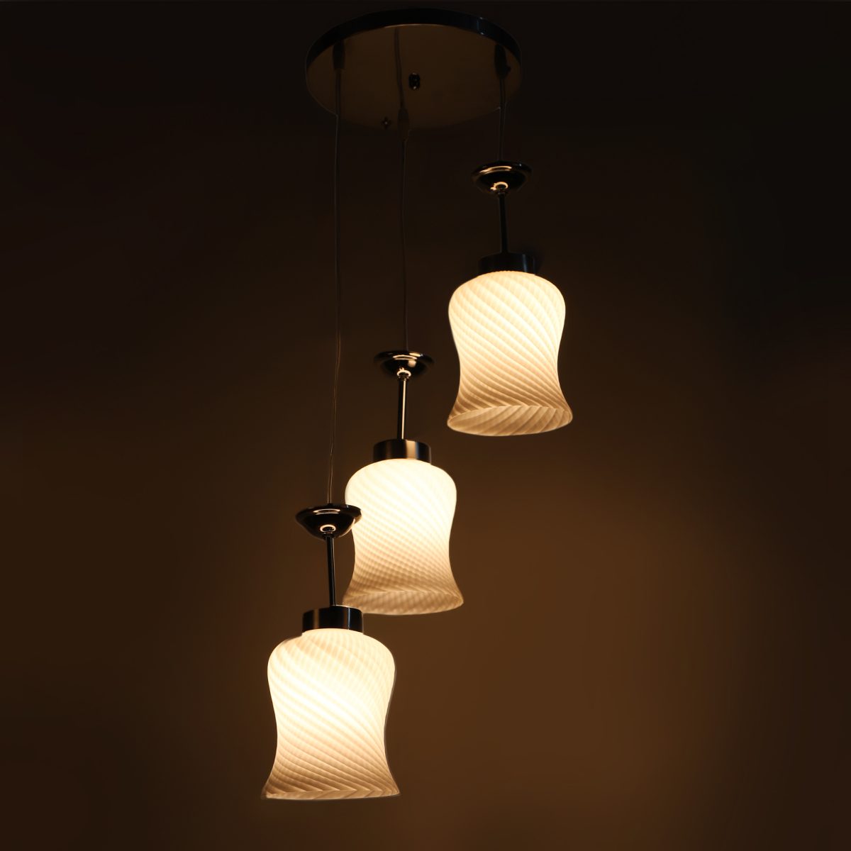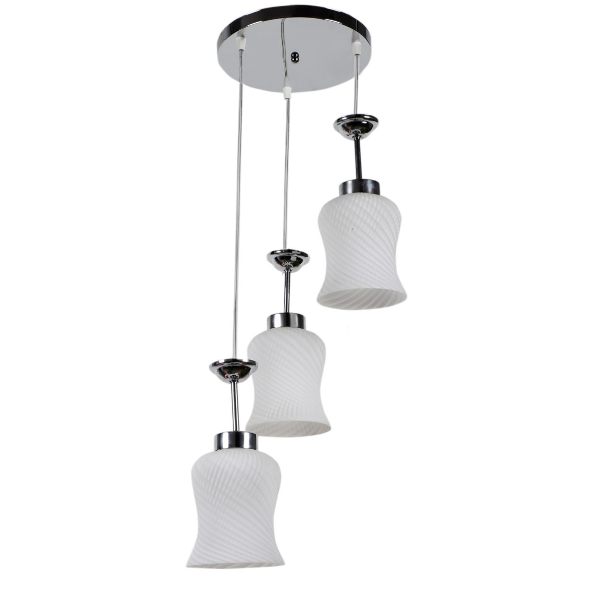 Silver (chrome) finish,modern bell shaped glass, cluster hanging light having three lamps made of mild steel and glass. This light is having a nice self design on the glass which is liked by many. The suspension can be adjusted at time of installation to the desired height. It is maintenance free, easy to remove glass and wash them, comes with an E27 holder, only the change of lamp is required, which is available locally everywhere. Application includes both residential and commercial premises wherever it matches with your interiors. Also available in single lamp option with code HL3841-1. Matching wall light code – WL1063, WL1285. Matching fixed ceiling code – CL413. Can be customized as per requirement in case of bulk quantities. Lamp not included.