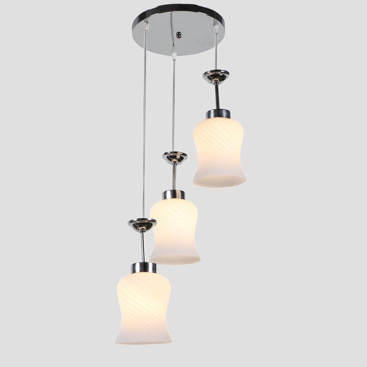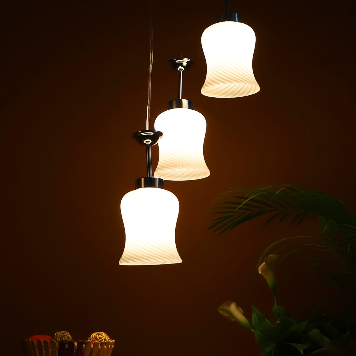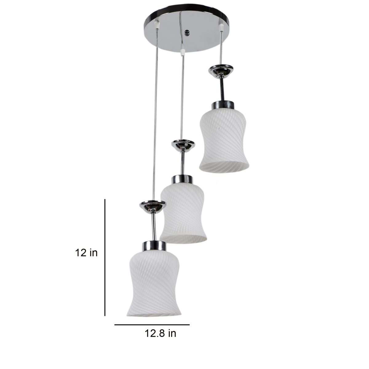 Silver (chrome) finish,modern bell shaped glass, cluster hanging light having three lamps made of mild steel and glass. This light is having a nice self design on the glass which is liked by many. The suspension can be adjusted at time of installation to the desired height. It is maintenance free, easy to remove glass and wash them, comes with an E27 holder, only the change of lamp is required, which is available locally everywhere. Application includes both residential and commercial premises wherever it matches with your interiors. Also available in single lamp option with code HL3841-1. Matching wall light code – WL1063, WL1285. Matching fixed ceiling code – CL413. Can be customized as per requirement in case of bulk quantities. Lamp not included.