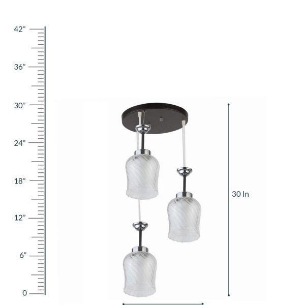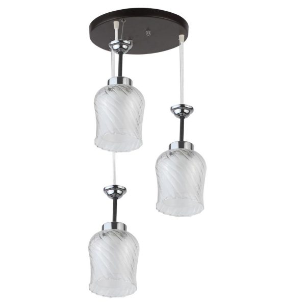 Silver (chrome) finish,modern bell shaped glass, cluster hanging light having three lamps made of mild steel and glass. This light is having a nice self design on the glass which is liked by many. The suspension can be adjusted at time of installation to the desired height. It is maintenance free, easy to remove glass and wash them, comes with an E27 holder, only the change of lamp is required, which is available locally everywhere. Application includes both residential and commercial premises wherever it matches with your interiors. Also available in single lamp option with code HL3841-1. Matching wall light code – WL1063, WL1285. Matching fixed ceiling code – CL413. Can be customized as per requirement in case of bulk quantities. Lamp not included.