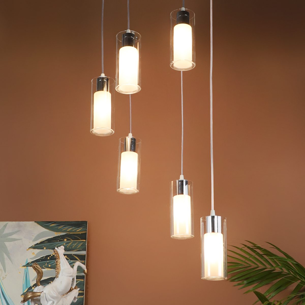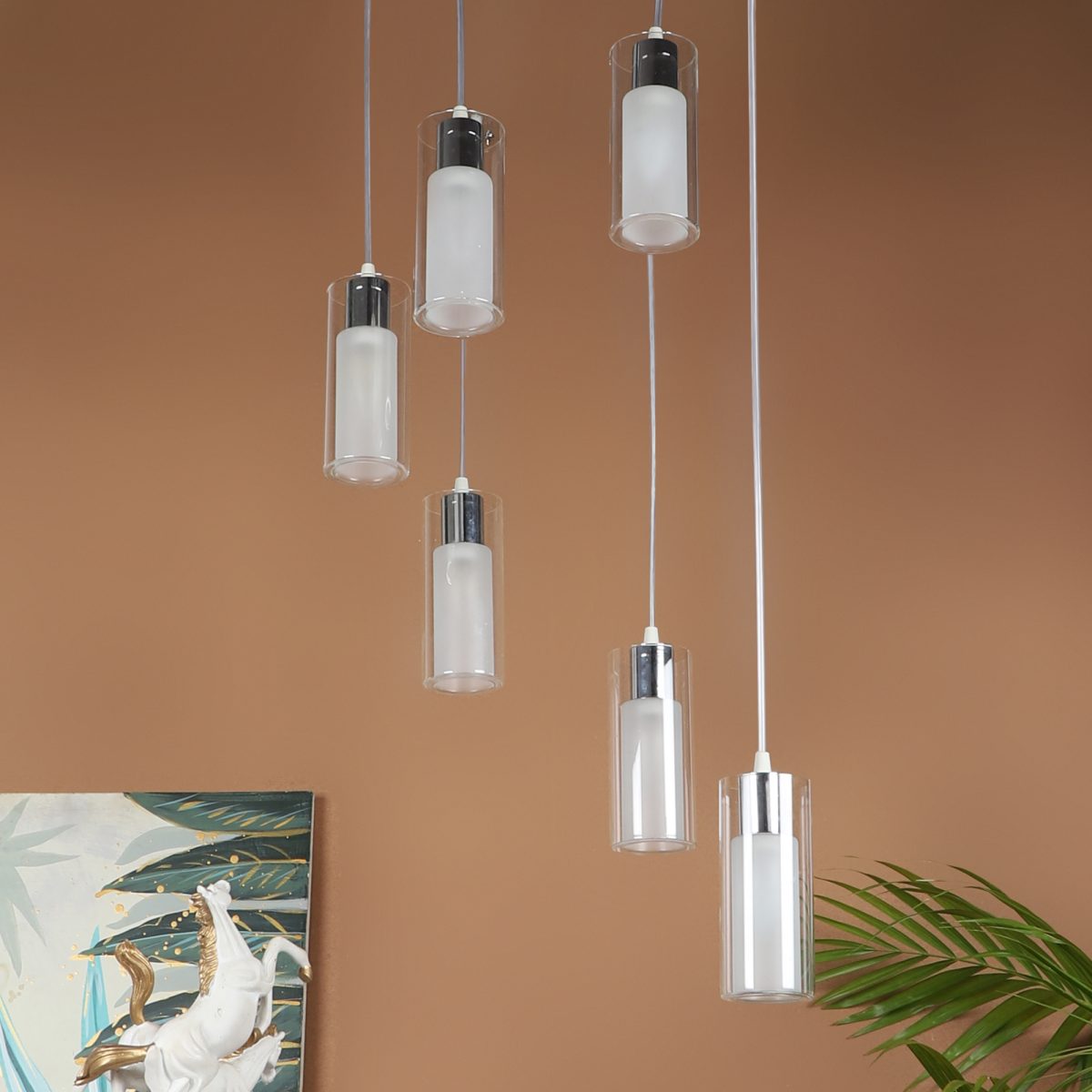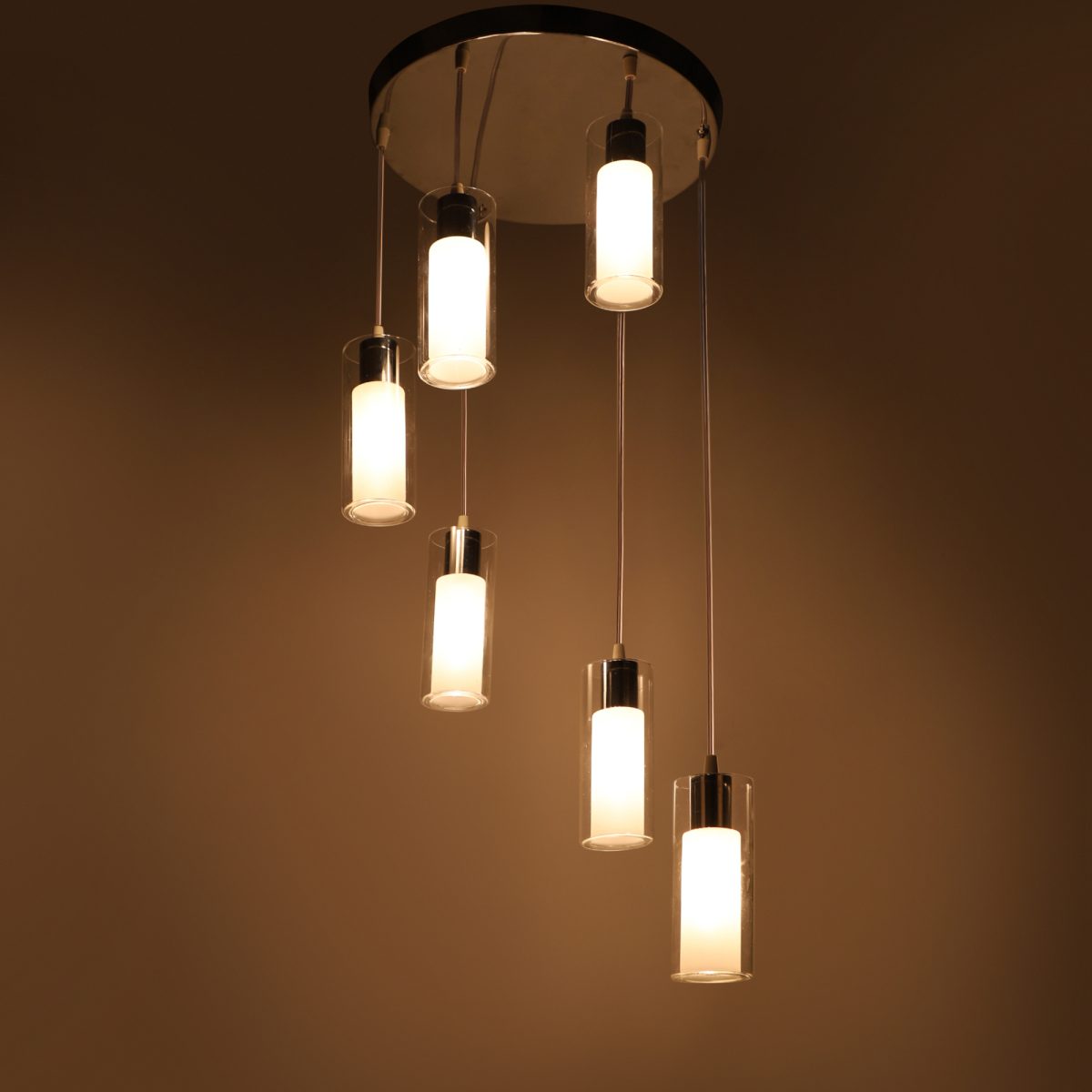 Silver (chrome) finish, ultra modern round glass, cluster hanging light having six lamps made of mild steel and glass. Each light is having two layers in glass, inner glass is frosted and outer glass is transparent making this light unique. The suspension can be adjusted at time of installation to the desired height. It is maintenance free, easy to remove glass and wash them, comes with an E14 holder, only the change of lamp is required, which is available locally everywhere. Application includes both residential and commercial premises wherever it matches with your interiors. Matching similar hanging codes – HL3868-1, HL3868-3, HL3868-10. Matching chandelier codes – CH313, CH316, Matching ceiling code – CL412. Matching wall light – WL1338, WL1339. All designs available in dark brown (wood) finish also. Can be customized as per requirement in case of bulk quantities. Lamp not included.