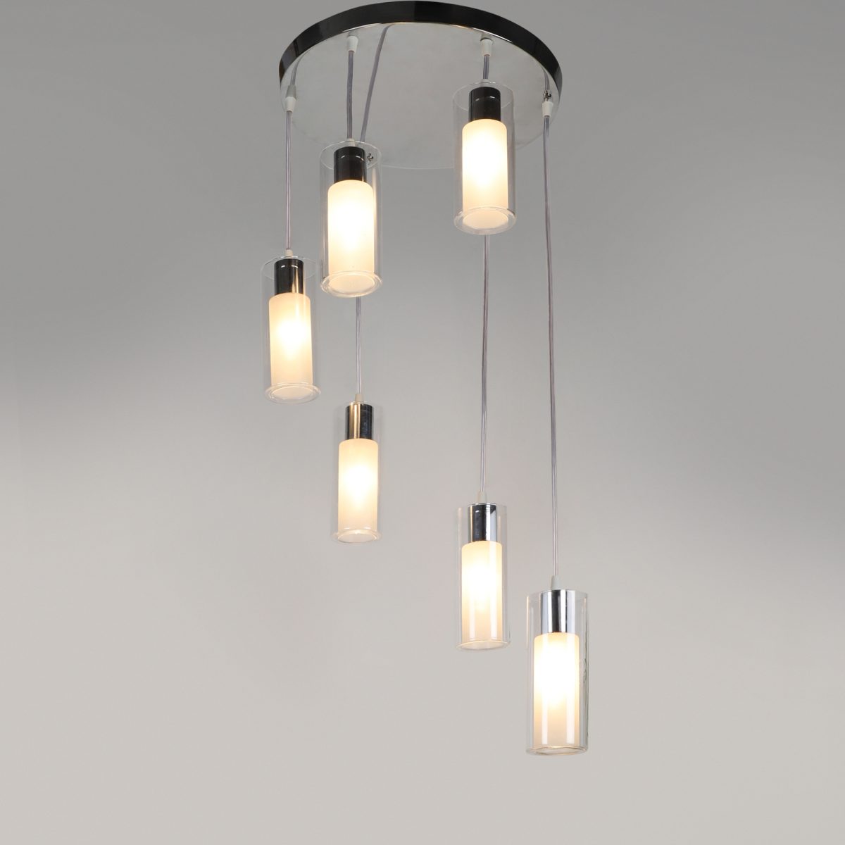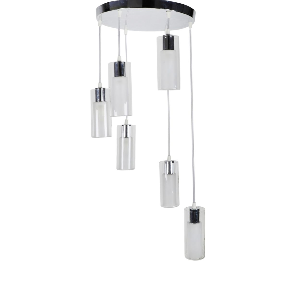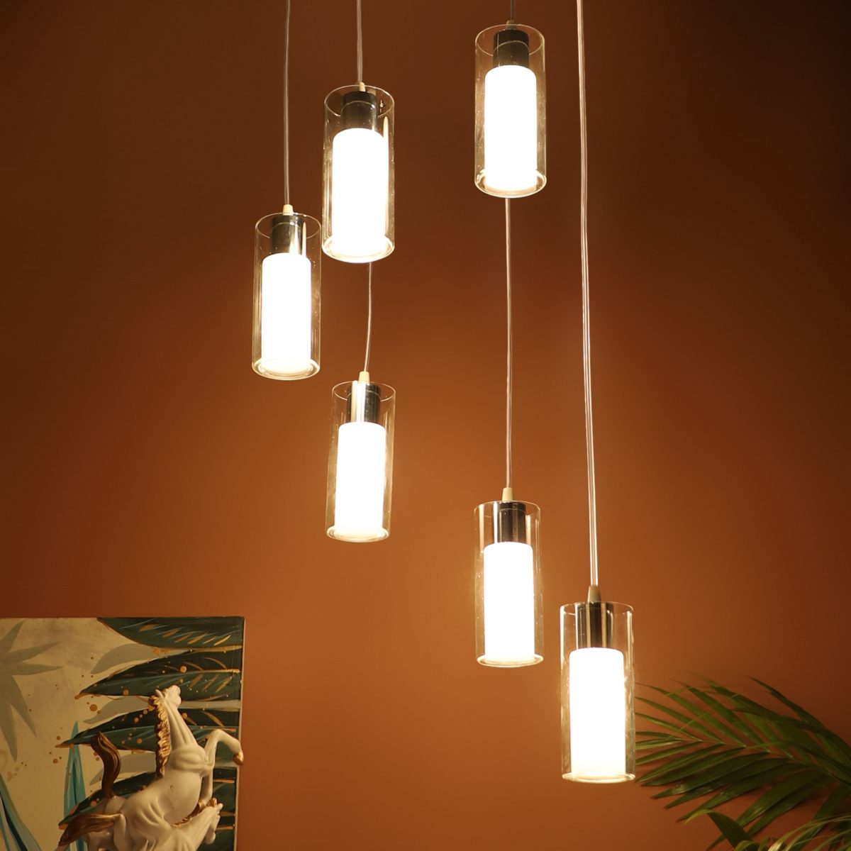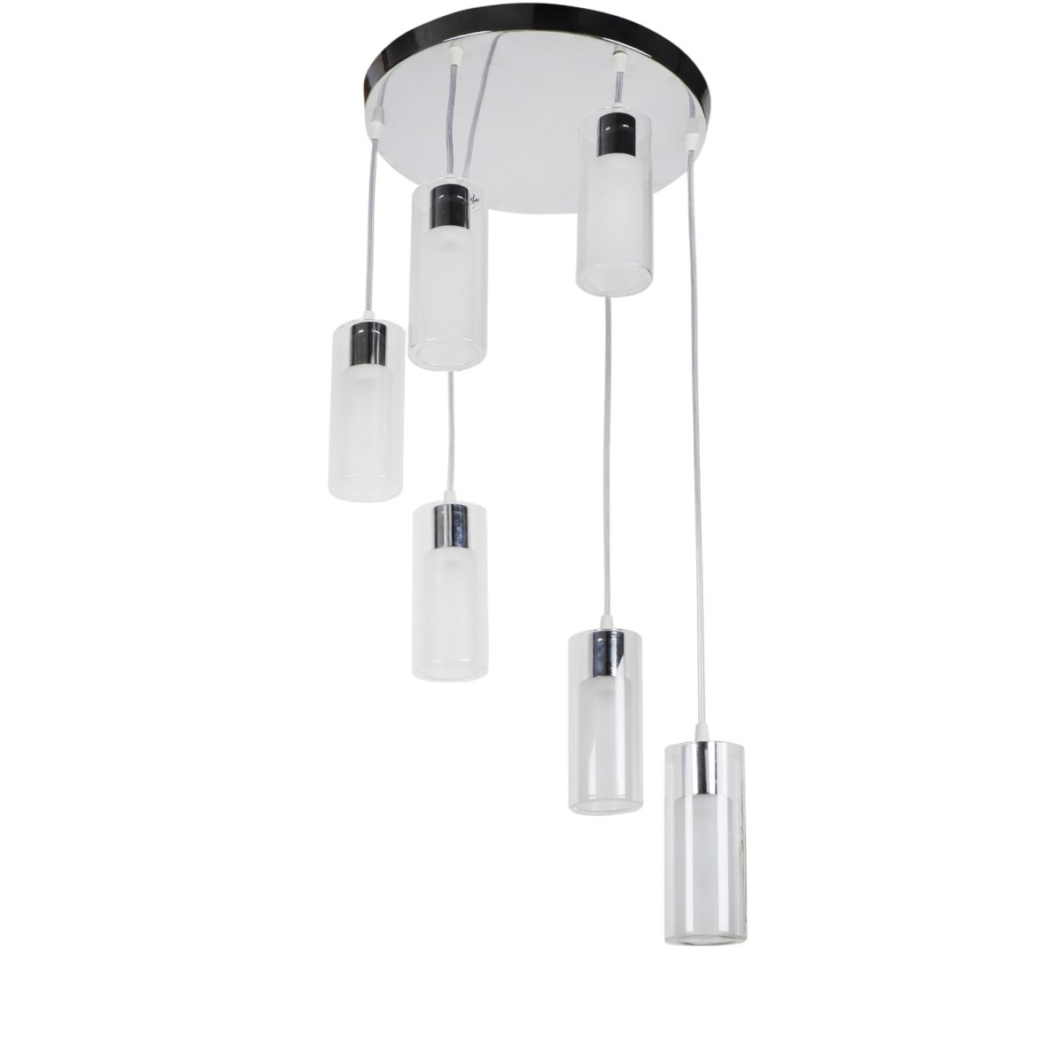 Silver (chrome) finish, ultra modern round glass, cluster hanging light having six lamps made of mild steel and glass. Each light is having two layers in glass, inner glass is frosted and outer glass is transparent making this light unique. The suspension can be adjusted at time of installation to the desired height. It is maintenance free, easy to remove glass and wash them, comes with an E14 holder, only the change of lamp is required, which is available locally everywhere. Application includes both residential and commercial premises wherever it matches with your interiors. Matching similar hanging codes – HL3868-1, HL3868-3, HL3868-10. Matching chandelier codes – CH313, CH316, Matching ceiling code – CL412. Matching wall light – WL1338, WL1339. All designs available in dark brown (wood) finish also. Can be customized as per requirement in case of bulk quantities. Lamp not included.