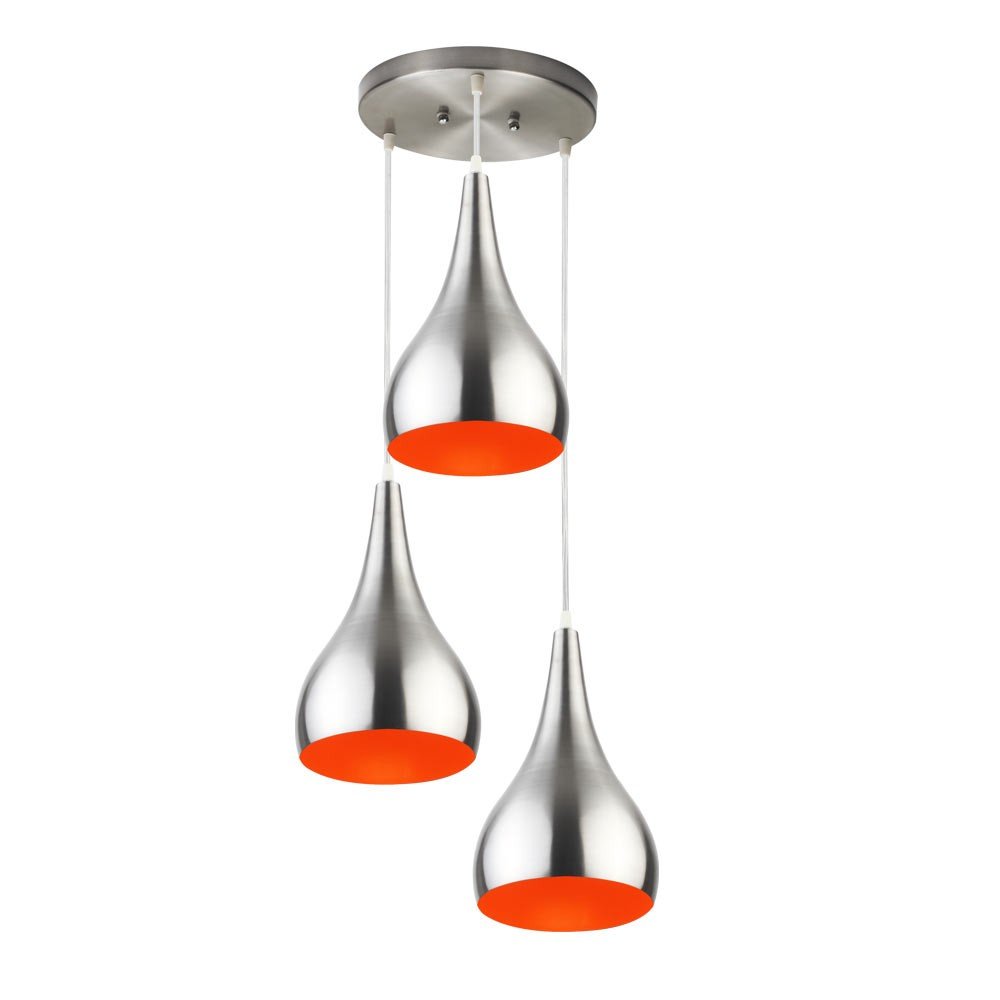 Silver (satin nickel) – orange finish modern aluminum cluster hanging light having three lamps. The suspension can be adjusted at time of installation to the desired height. It is maintenance free, comes with an E27 holder, only the change of lamp is required, which is available locally everywhere. This along with its variants are one of the best selling design in our catalogue. Application includes both residential and commercial premises wherever it matches with your interiors. Codes of other hanging variation in same design – HL3923-1, HL3923-3, HL3924-1, HL3924-3, HL3925-1, HL3925-3, HL3926-1, HL3926-3, HL3927-1, HL3928-1, HL3928-3, HL3946-1, HL3947-1, HL3949-1, HL3949-3, HL4104. Can be customized as per requirement in case of bulk quantities. Lamp not included.