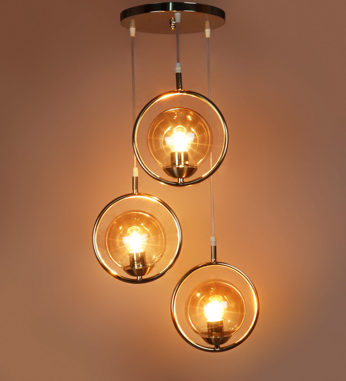 Gold modern, mild steel triple hanging light in campaign glass. The suspension can be adjusted at time of installation to the desired height. It is maintenance free, comes with an E27 holder, only the change of lamp is required, which is available locally everywhere. LED filament lamp is recommended to enhance its beauty. Matching single hanging code – HL6075-1. Application includes both residential and commercial premises wherever it matches with your interiors. Can be customized as per requirement in case of bulk quantities. LAMP NOT INCLUDED.