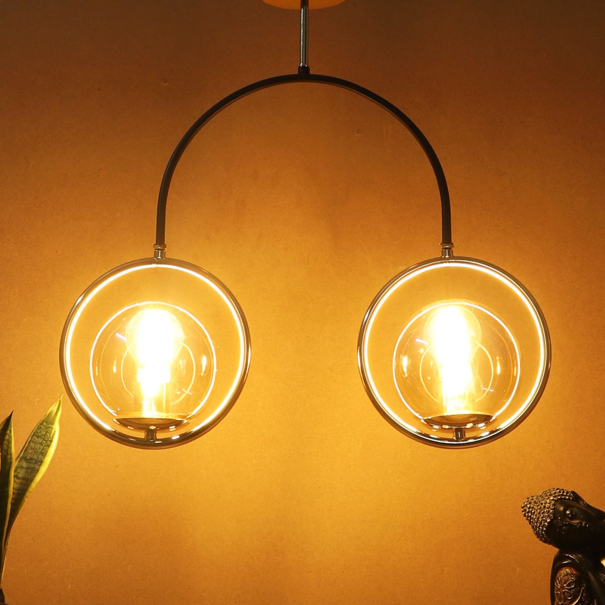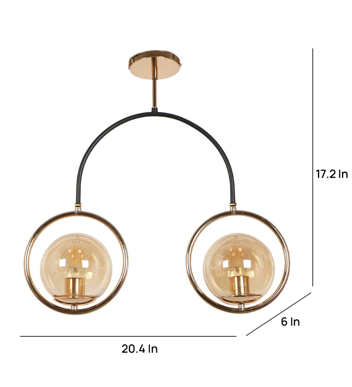 Black and gold modern hanging light having two lights in champaign coloured doom glass. The suspension can be adjusted at time of installation to the desired height. Looks amazing with LED filament lamp. Can be customized as per requirement. LAMP NOT INCLUDED.