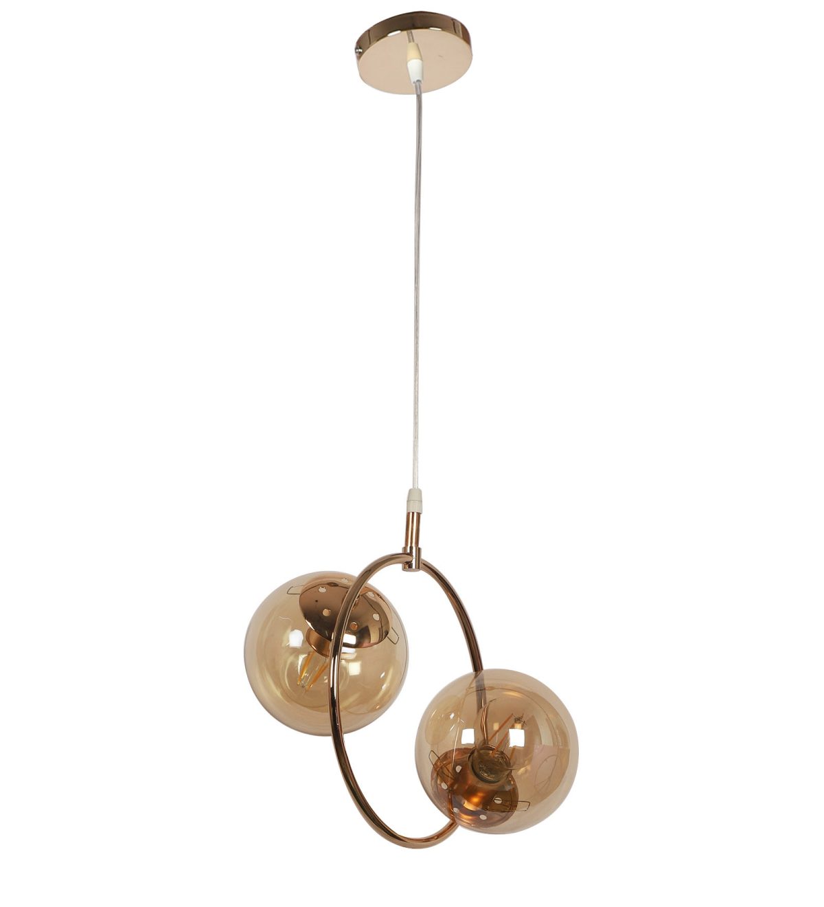 Golden modern hanging light having two lights in champaign coloured doom glass. The suspension can be adjusted at time of installation to the desired height. Looks amazing with LED filament lamp. Can be customized as per requirement. LAMP NOT INCLUDED.