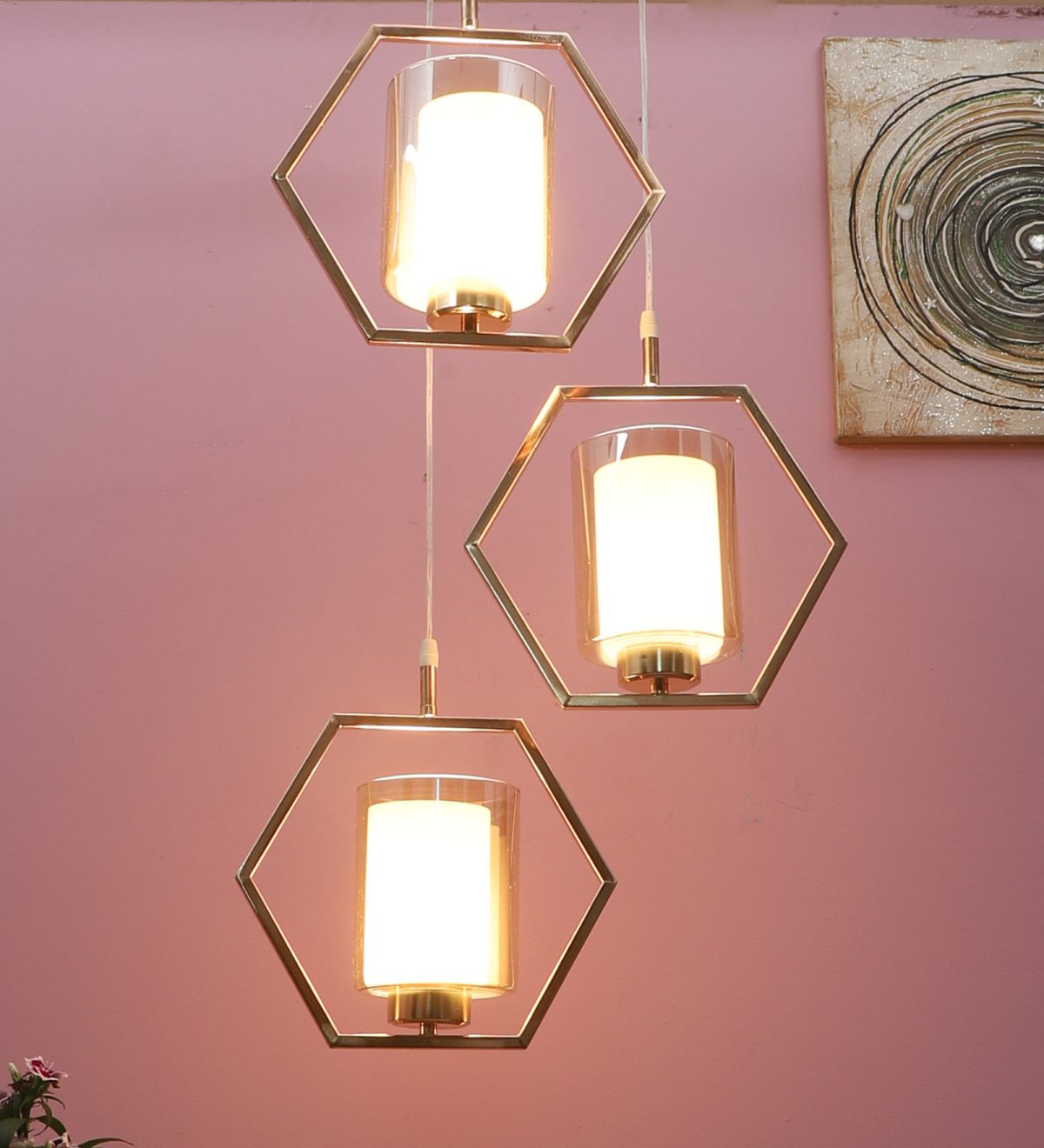 Antique finish modern hanging light having three lights in champaign coloured glass. The suspension can be adjusted at time of installation to the desired height. Can be customized as per requirement. LAMP NOT INCLUDED.