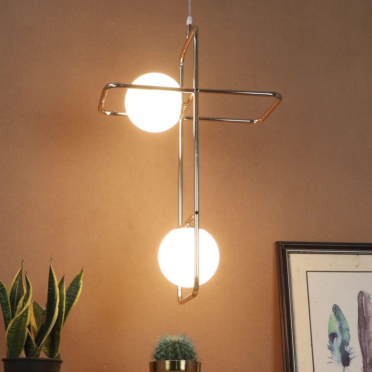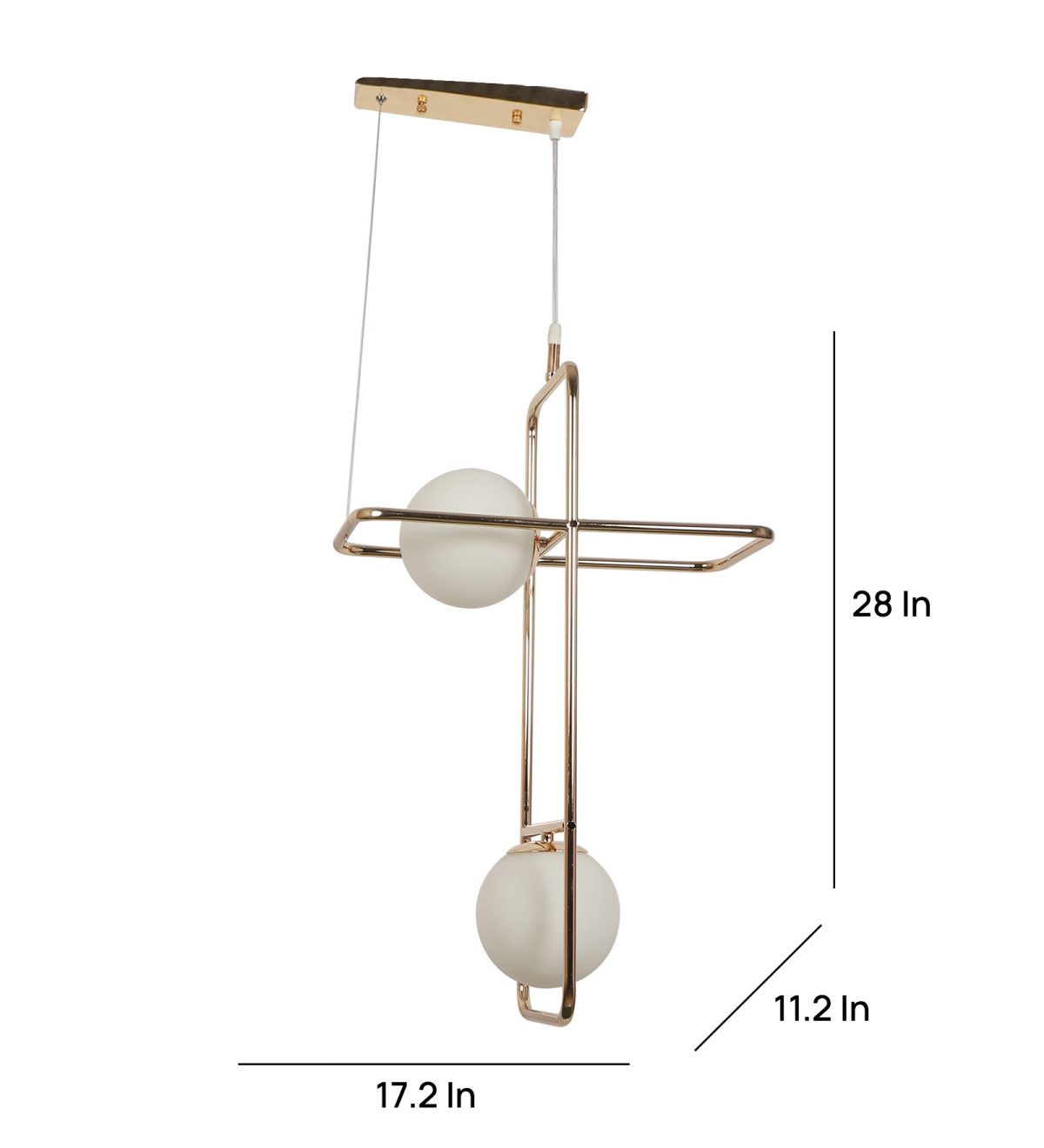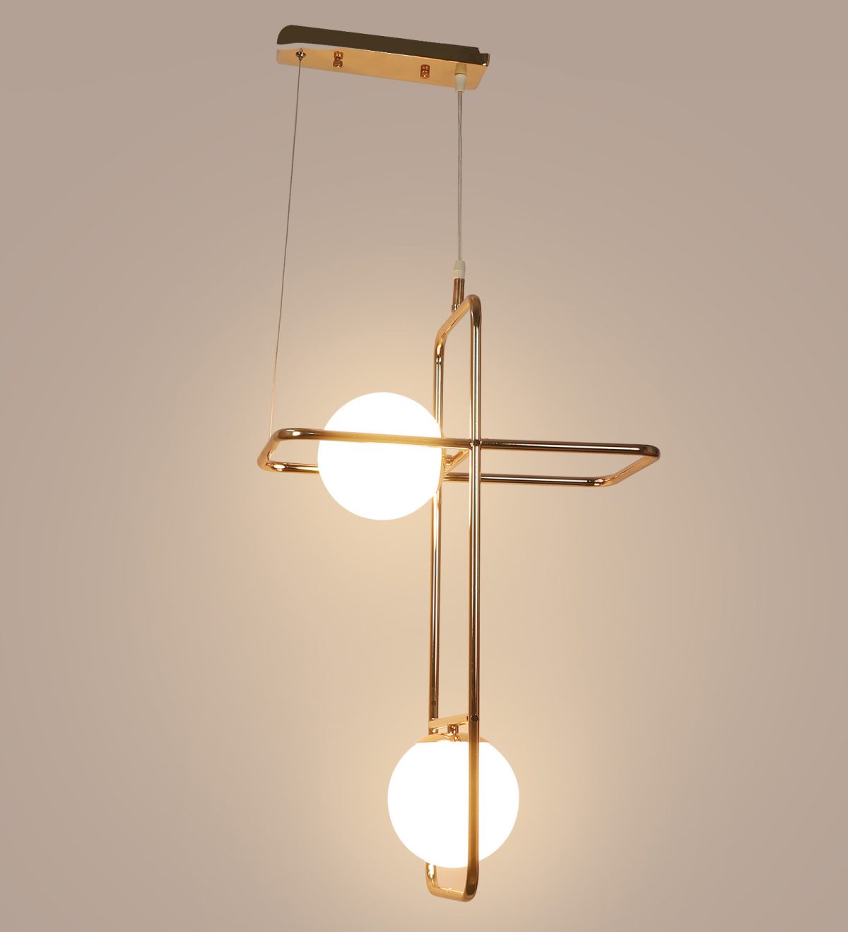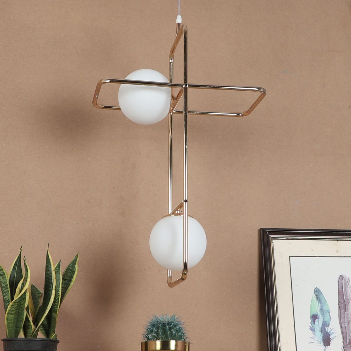 Golden modern hanging light having two lights in white doom glass. The suspension can be adjusted at time of installation to the desired height. Can be customized as per requirement. LAMP NOT INCLUDED.