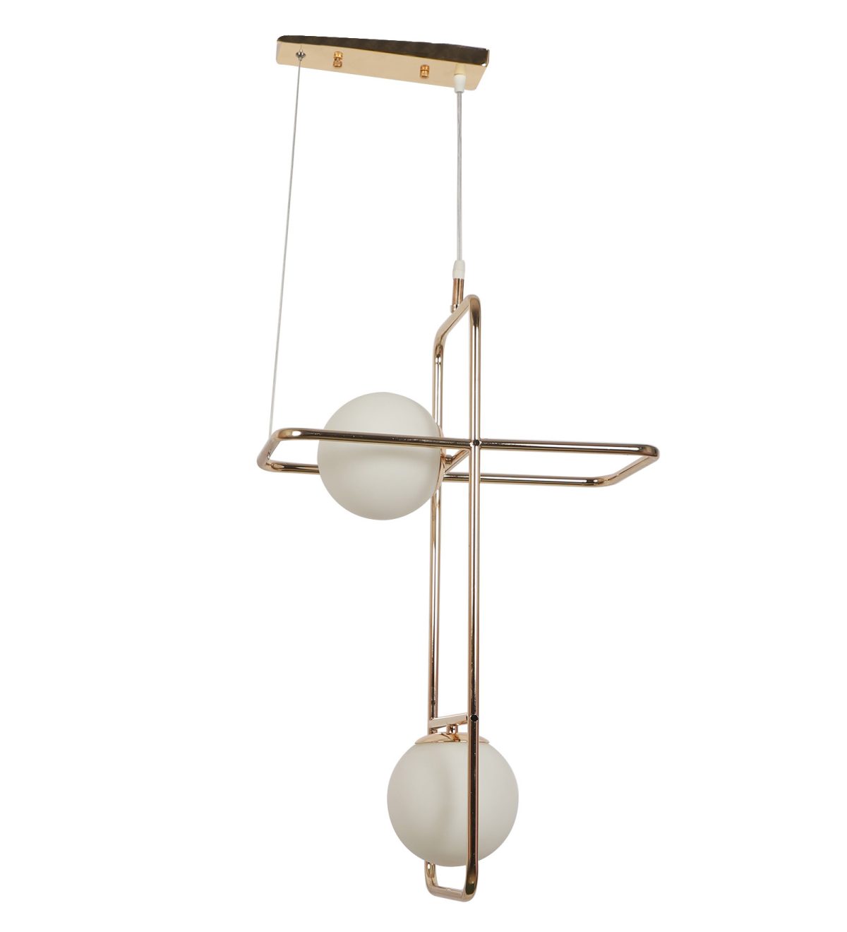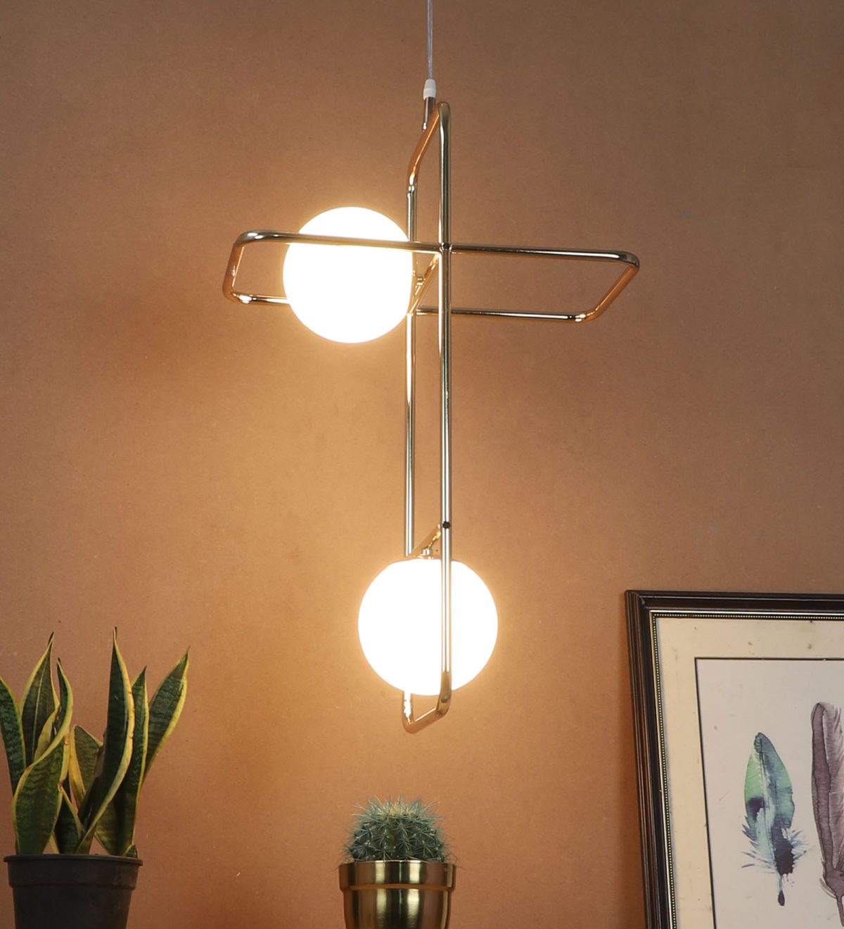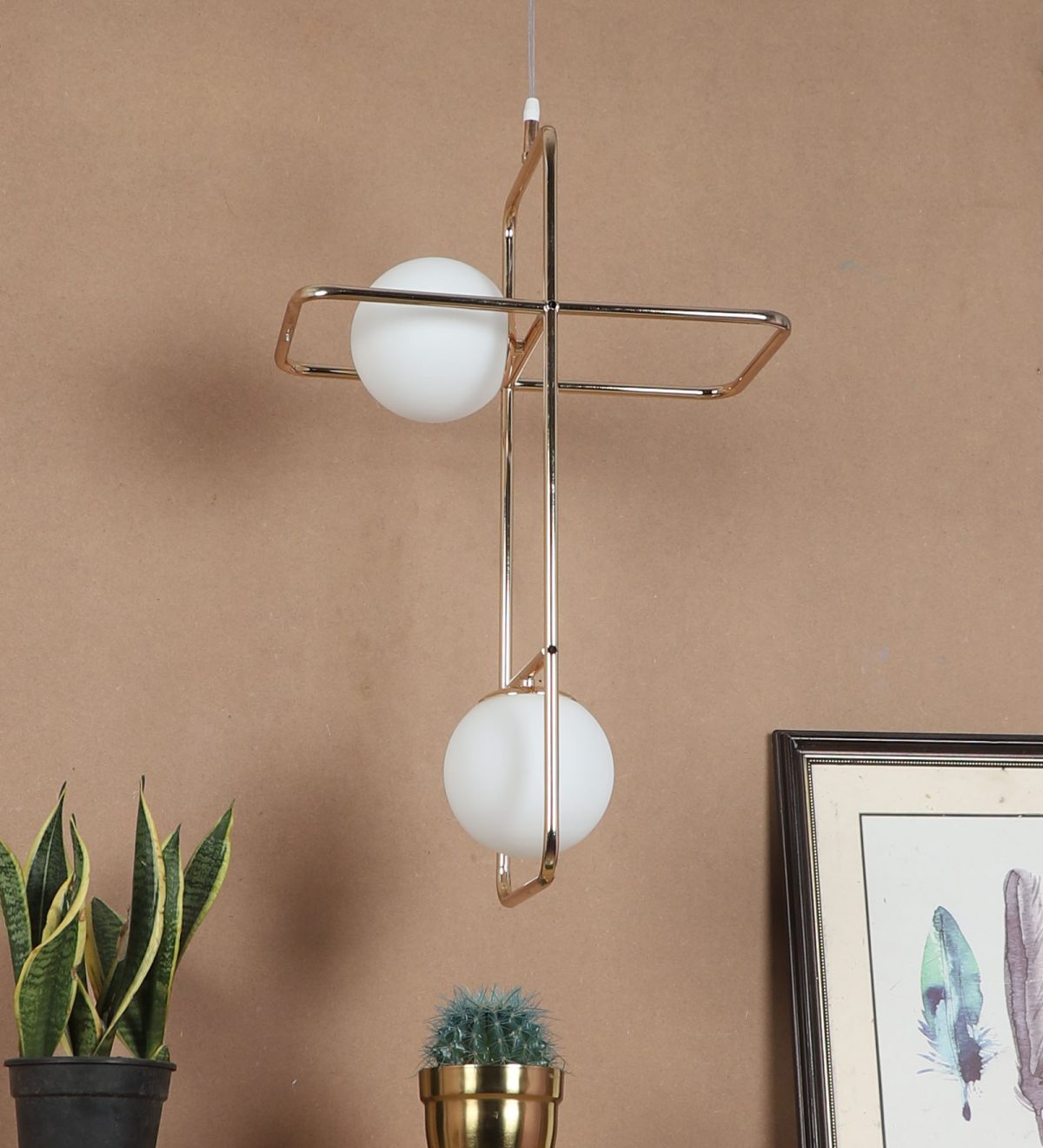 Golden modern hanging light having two lights in white doom glass. The suspension can be adjusted at time of installation to the desired height. Can be customized as per requirement. LAMP NOT INCLUDED.